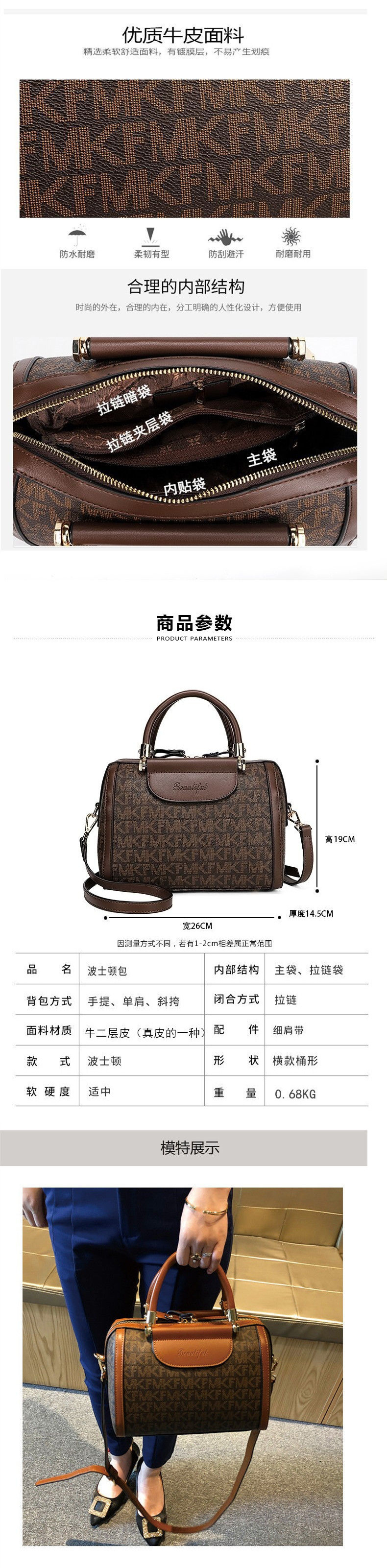 정품 가죽 다용도 대용량 캐주얼 배럴 베개 가방 보스턴 휴대용 크로스 바디 백 크로스 여성용 가방 소가죽 대형 가방