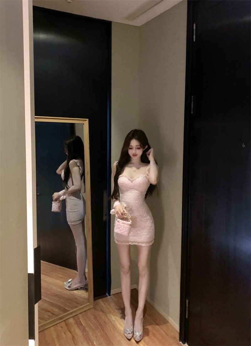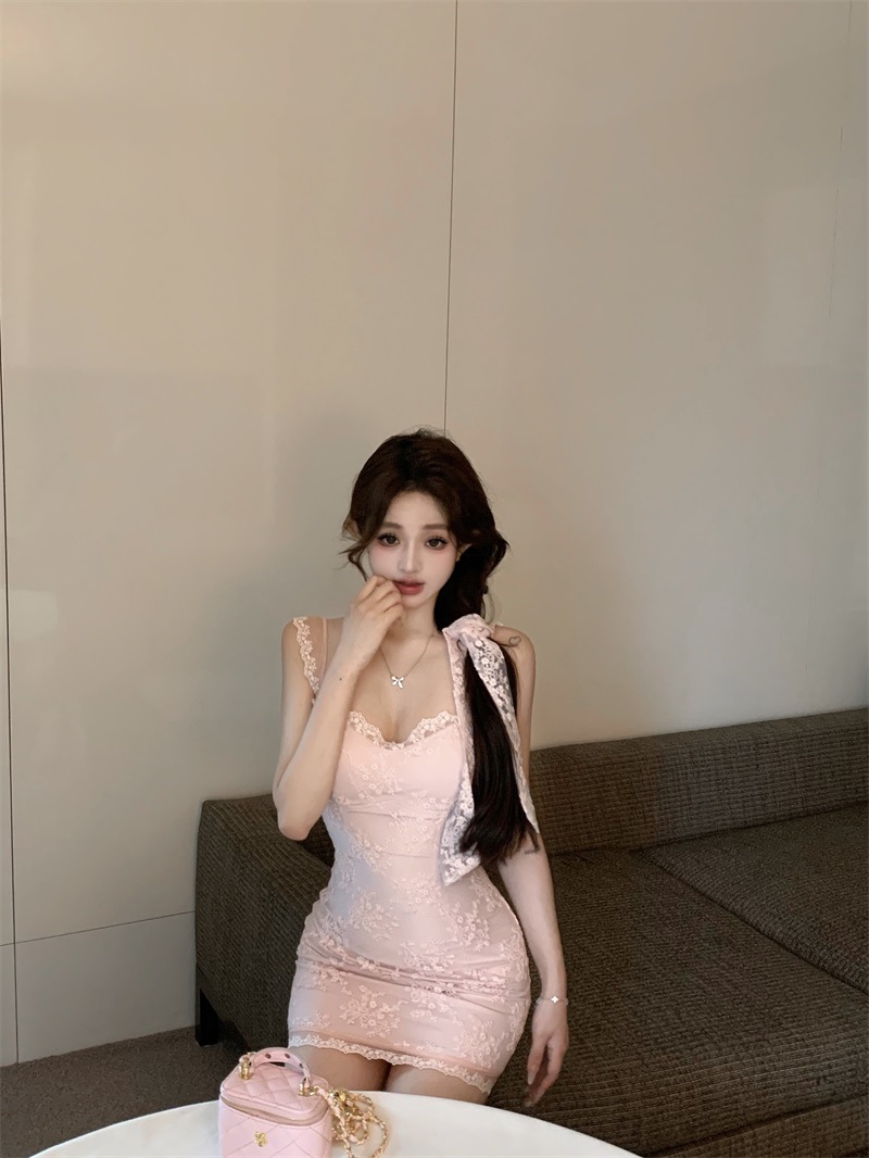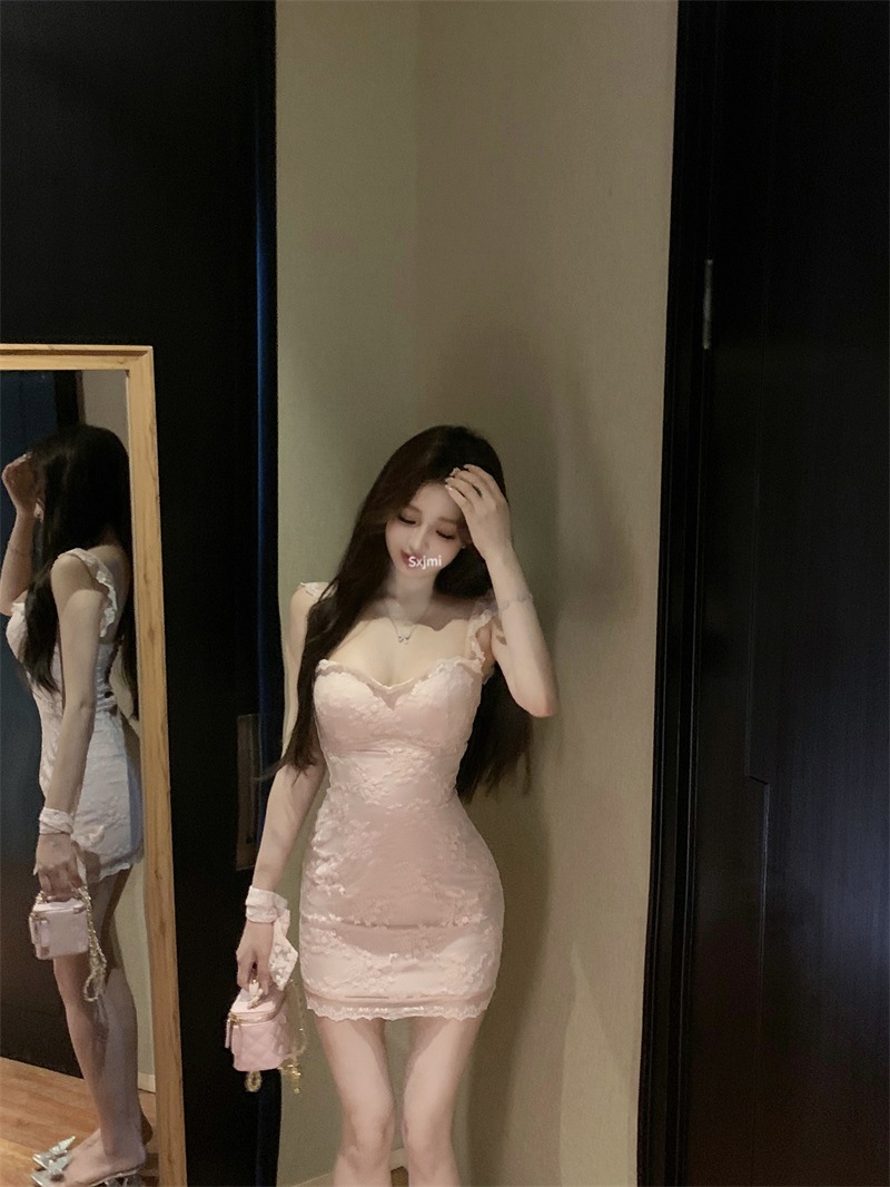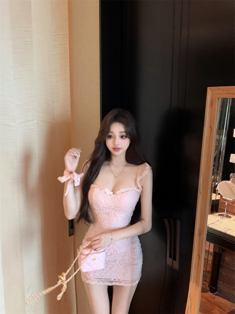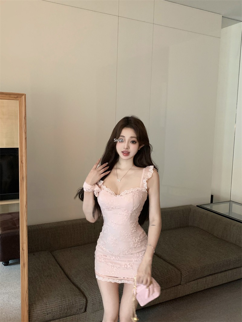 레이스 스플 라이스 슬림 피트 스몰 플라잉 슬리브 서스펜더 드레스 여성 여름 핑크 스위트 핫 걸 힙 스커트 허리 짧은 스커트스토어 가기