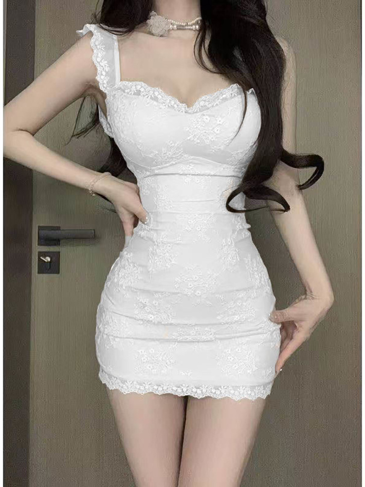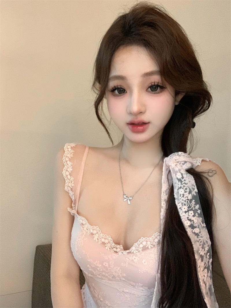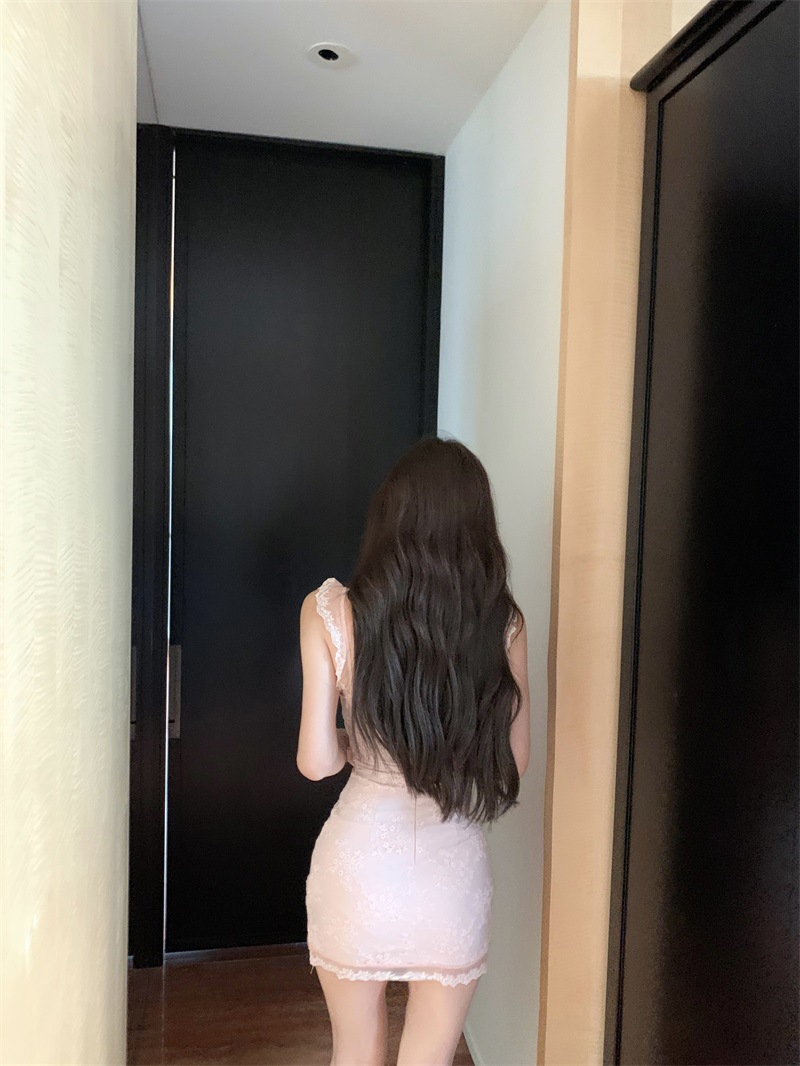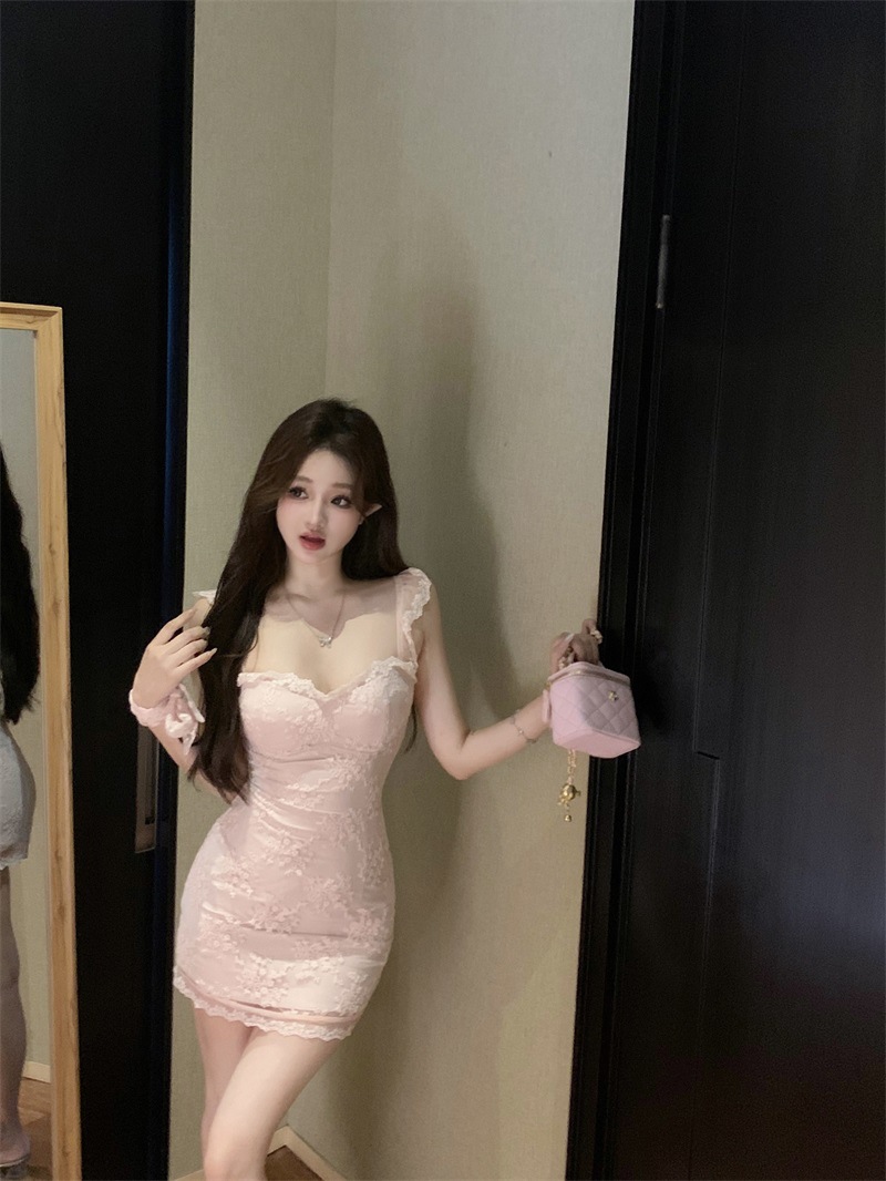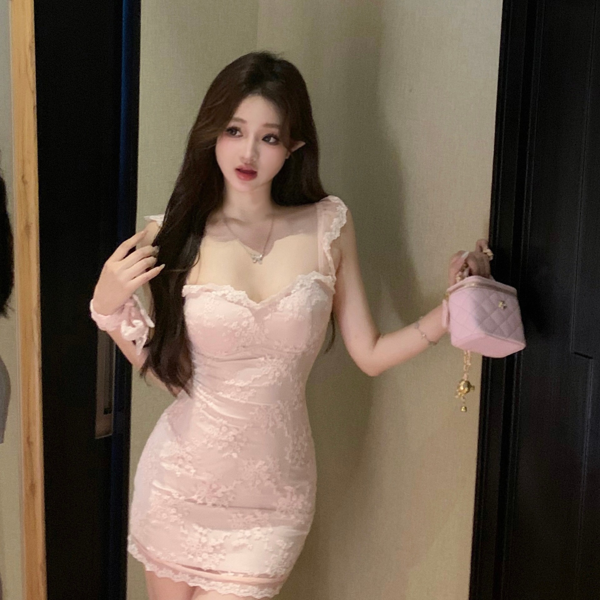 레이스 스플 라이스 슬림 피트 스몰 플라잉 슬리브 서스펜더 드레스 여성 여름 핑크 스위트 핫 걸 힙 스커트 허리 짧은 스커트스토어 가기