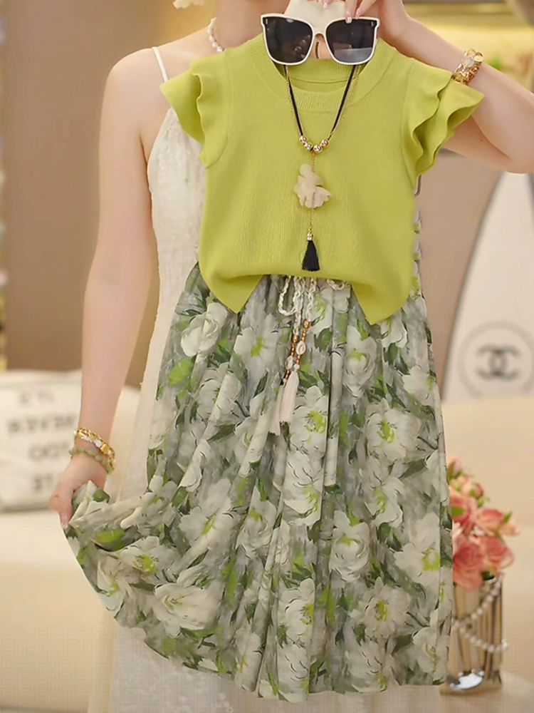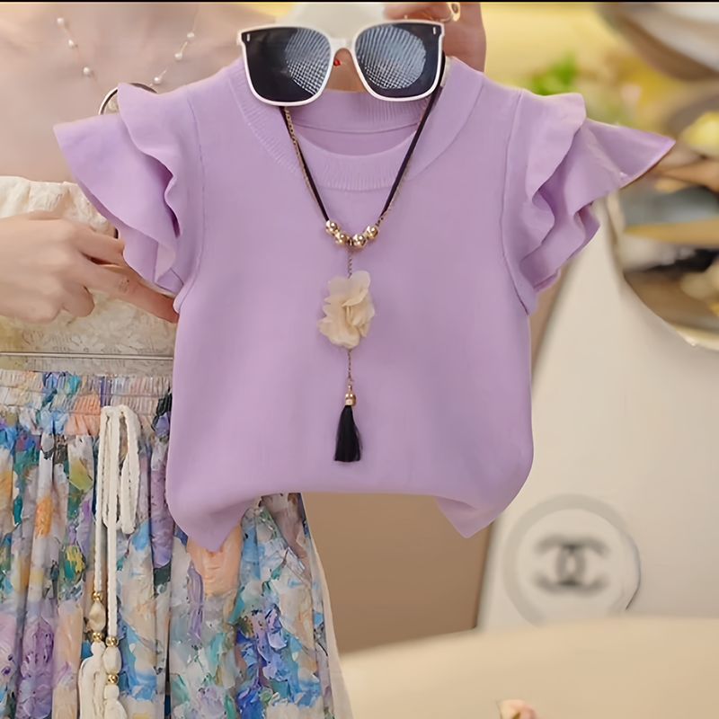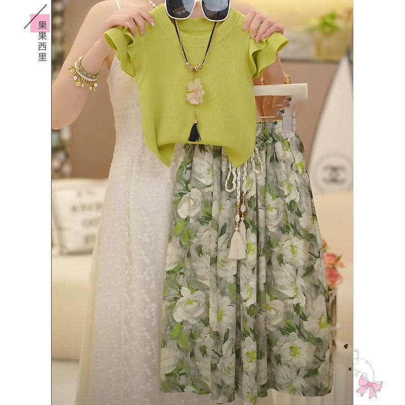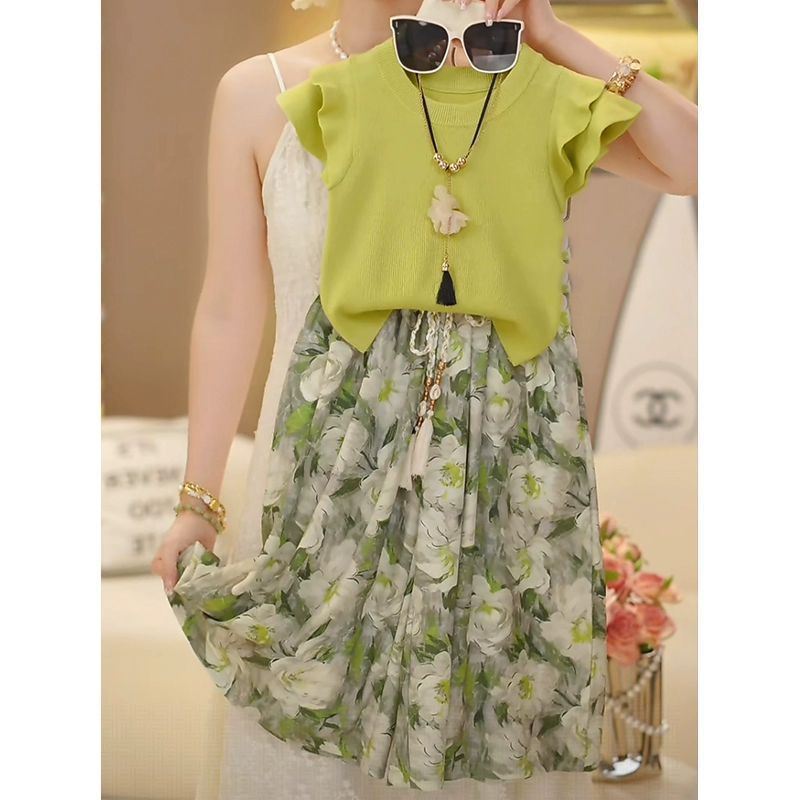 소녀 세트 여름 2025 새로운 스타일 여자 서양식 비행 소매 티셔츠 안티-모기 바지 신선한 녹색 어린이 투피스 세트