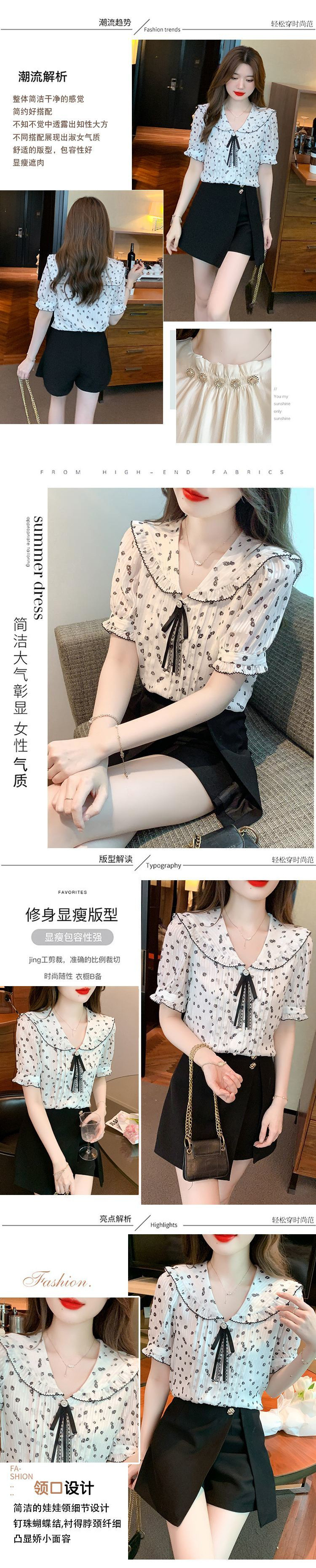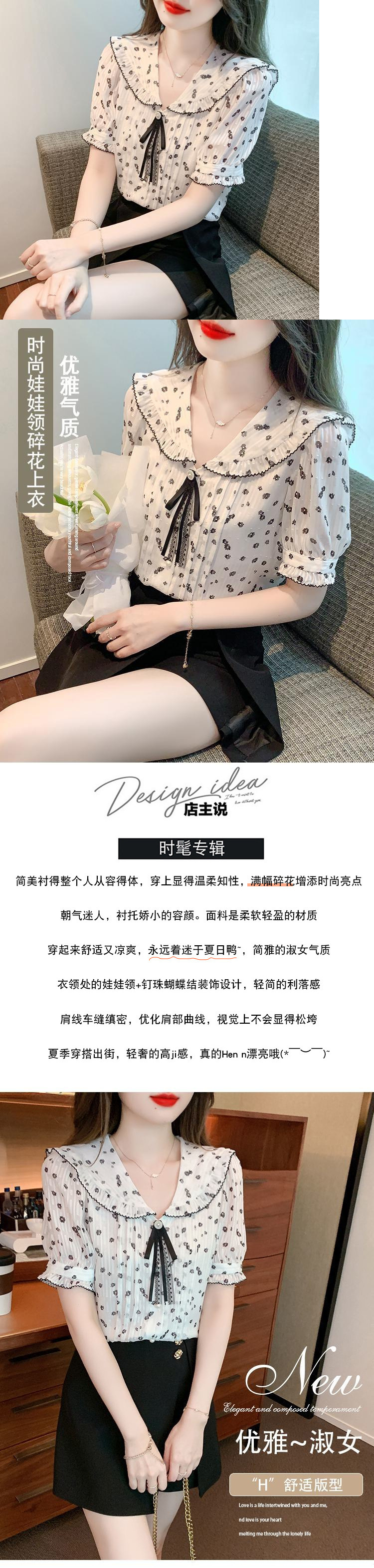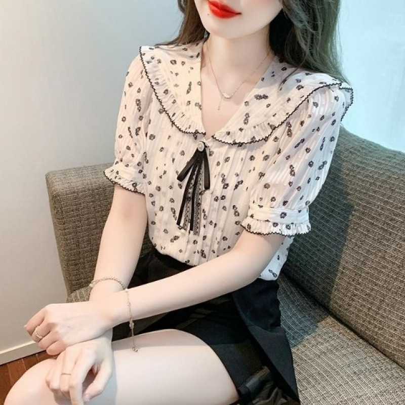 여름 여성을 위한 프렌치 플로럴 반팔 쉬폰 셔츠, 부드럽고 달콤한 인형 칼라 탑, 디자인 니치 플리츠 셔츠스토어 가기