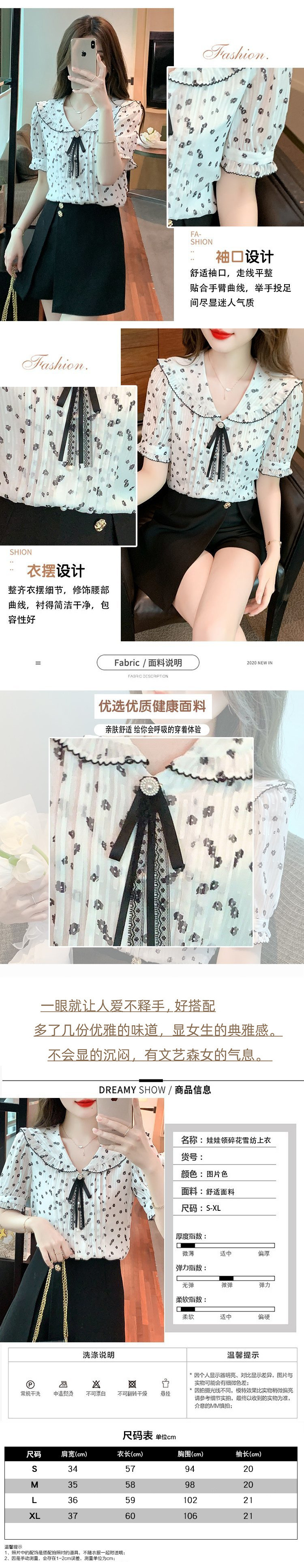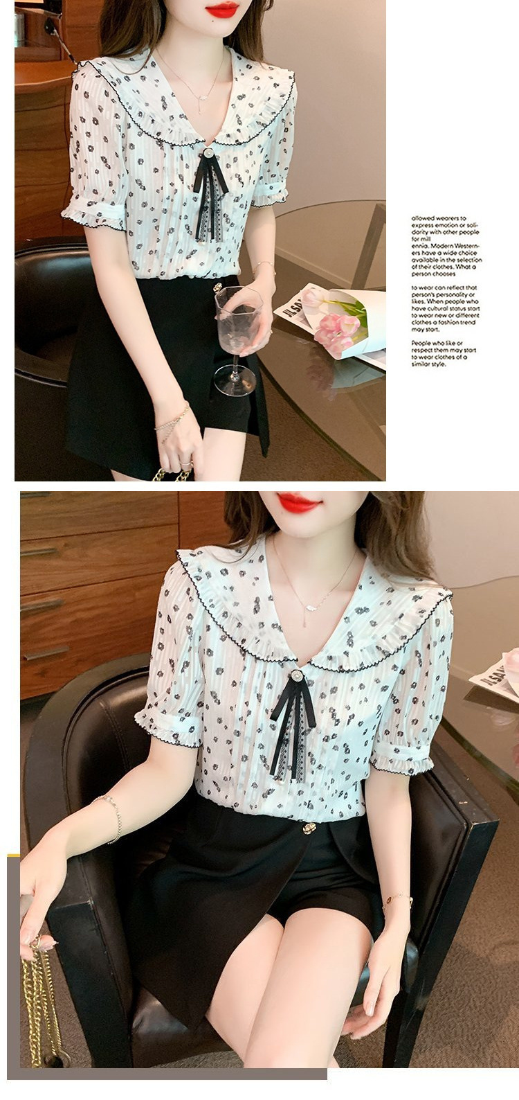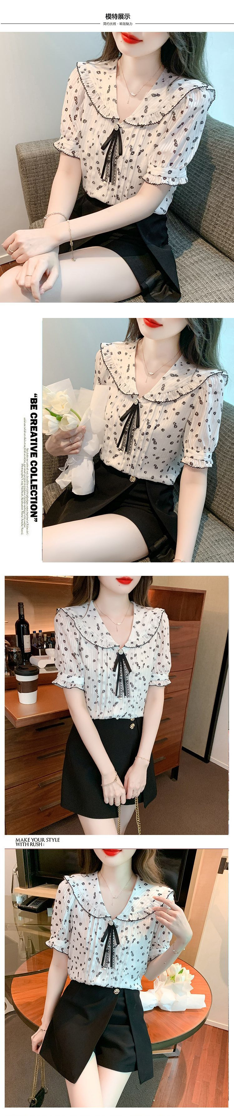 여름 여성을 위한 프렌치 플로럴 반팔 쉬폰 셔츠, 부드럽고 달콤한 인형 칼라 탑, 디자인 니치 플리츠 셔츠스토어 가기