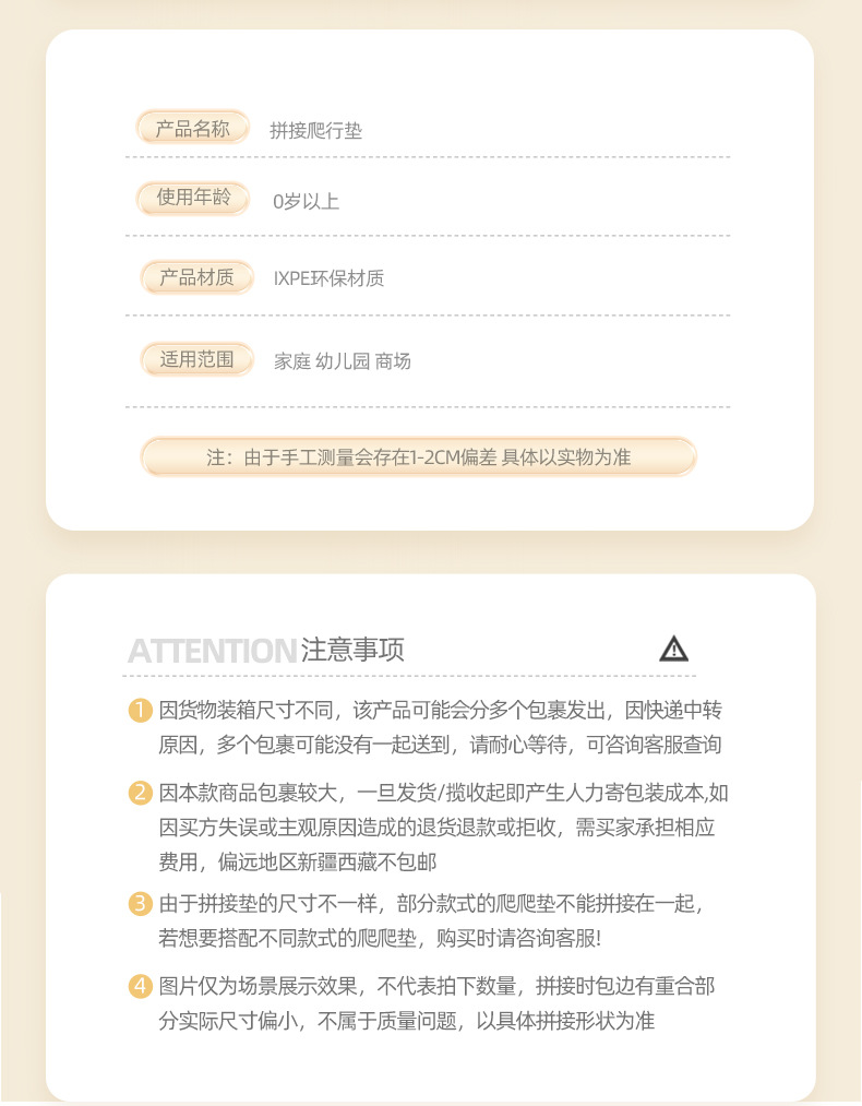 亲,拼接垫产品因受机器生产影响,垫子厚度和宽度可能会存在一些误差,敬请谅解。