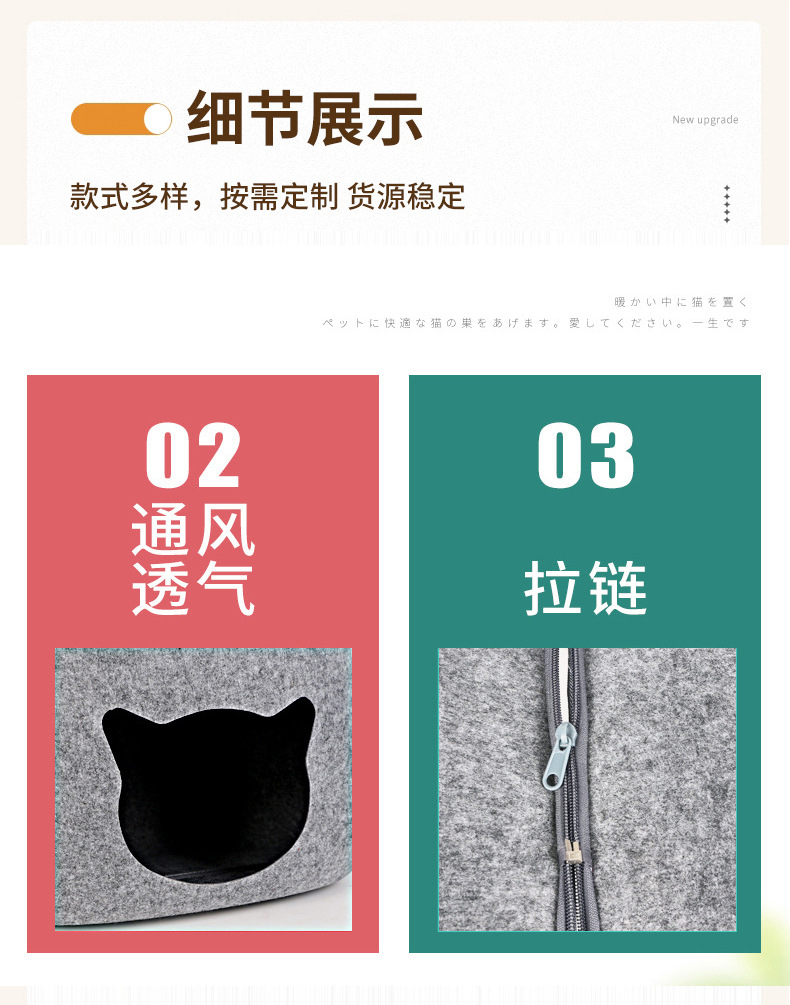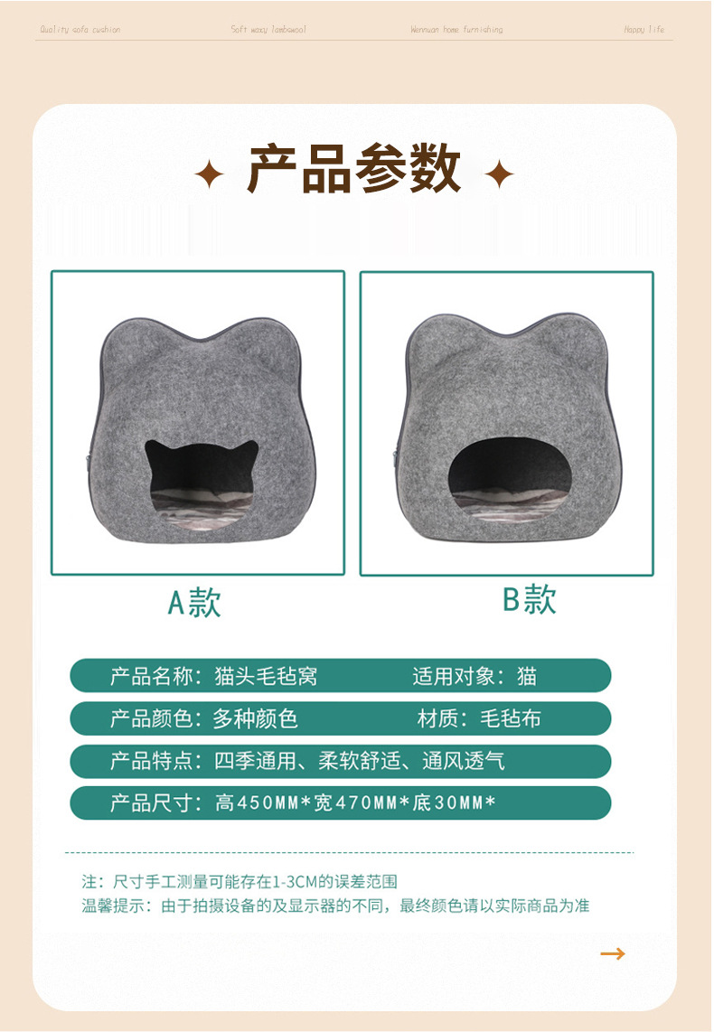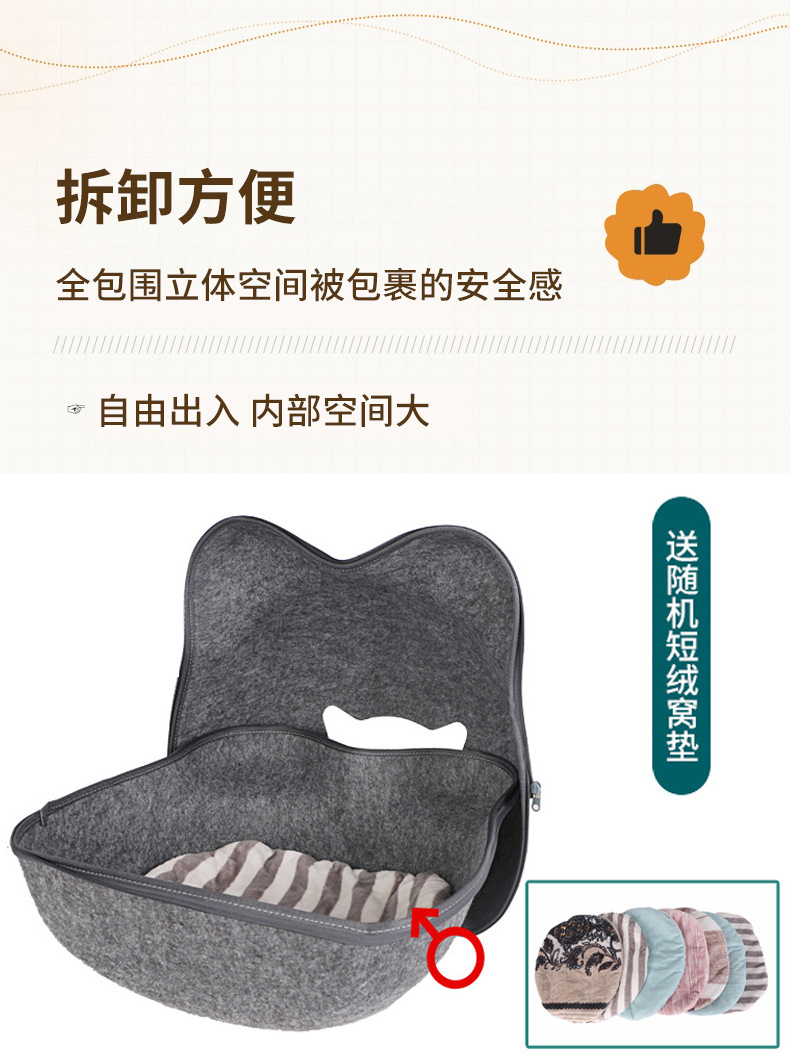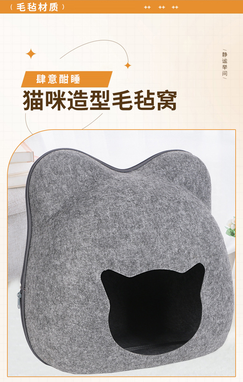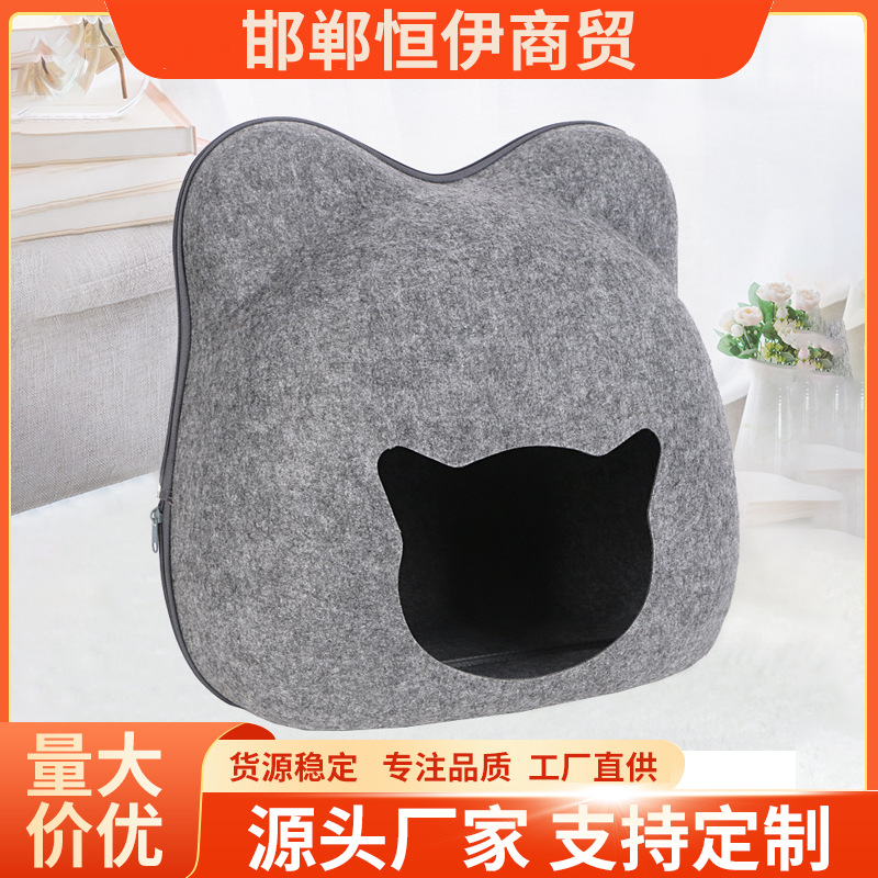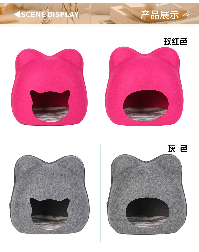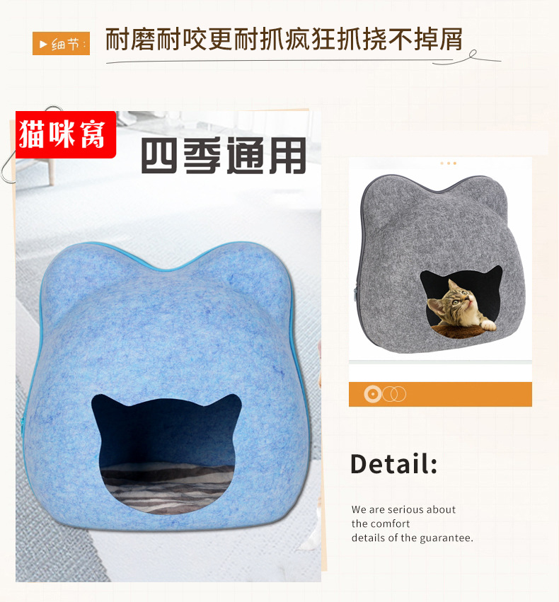 펠트 고양이 둥지는 휴대가 간편하고 반밀폐형 애완동물 둥지입니다. 창의적인 고양이 모양의 고양이 둥지는 통기성이 뛰어나고 사계절 내내 사용할 수 있습니다.스토어 가기