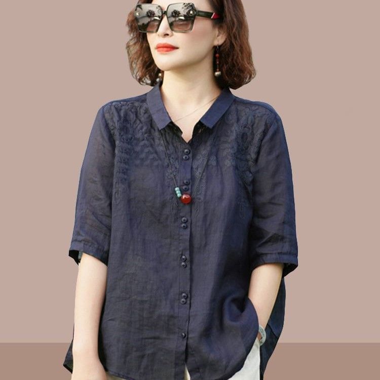 2025 여름 신작 모시 자수 셔츠 탑 여성 루즈한 7부 소매 셔츠 재킷 다용도 얇은 셔츠