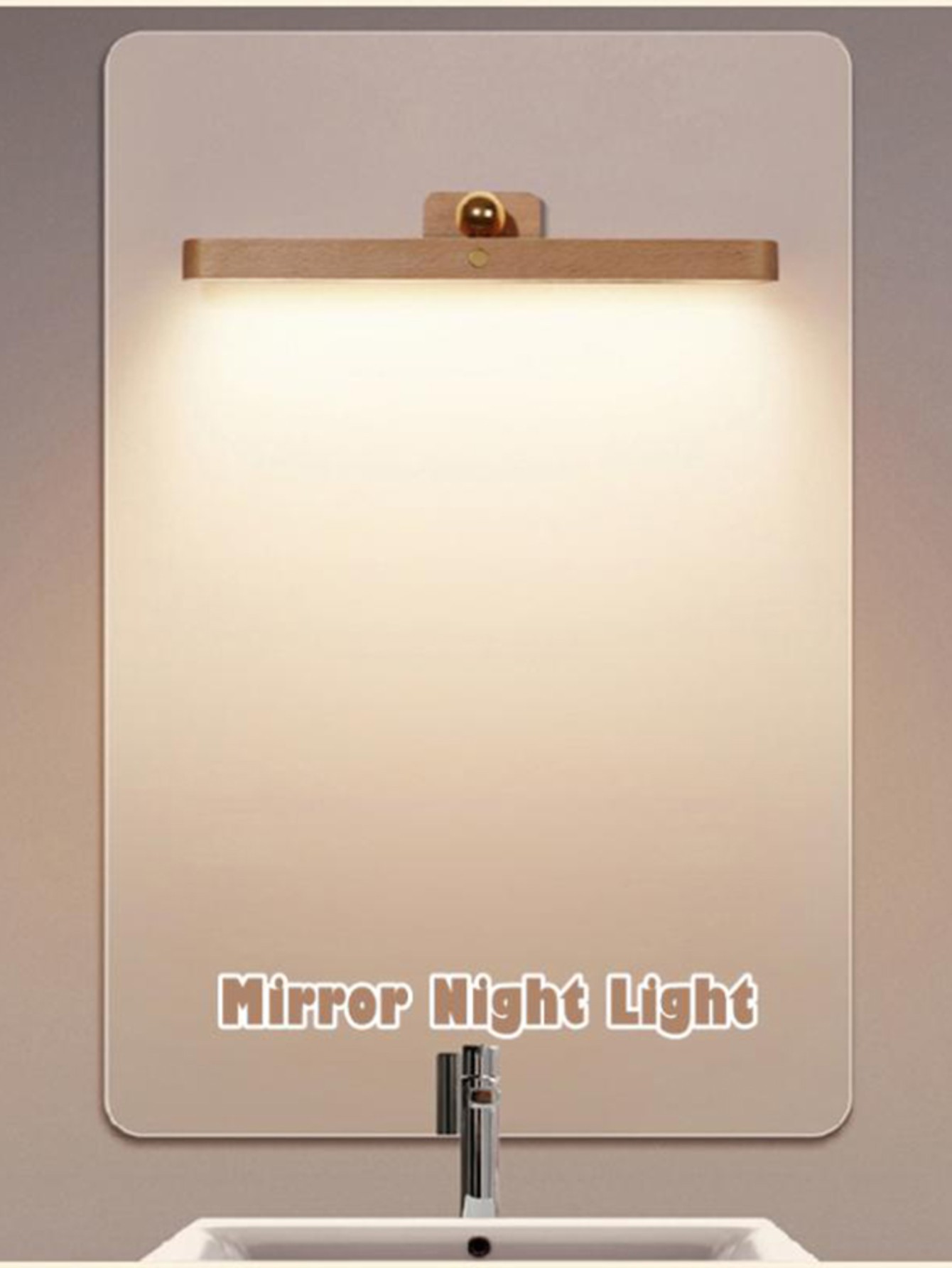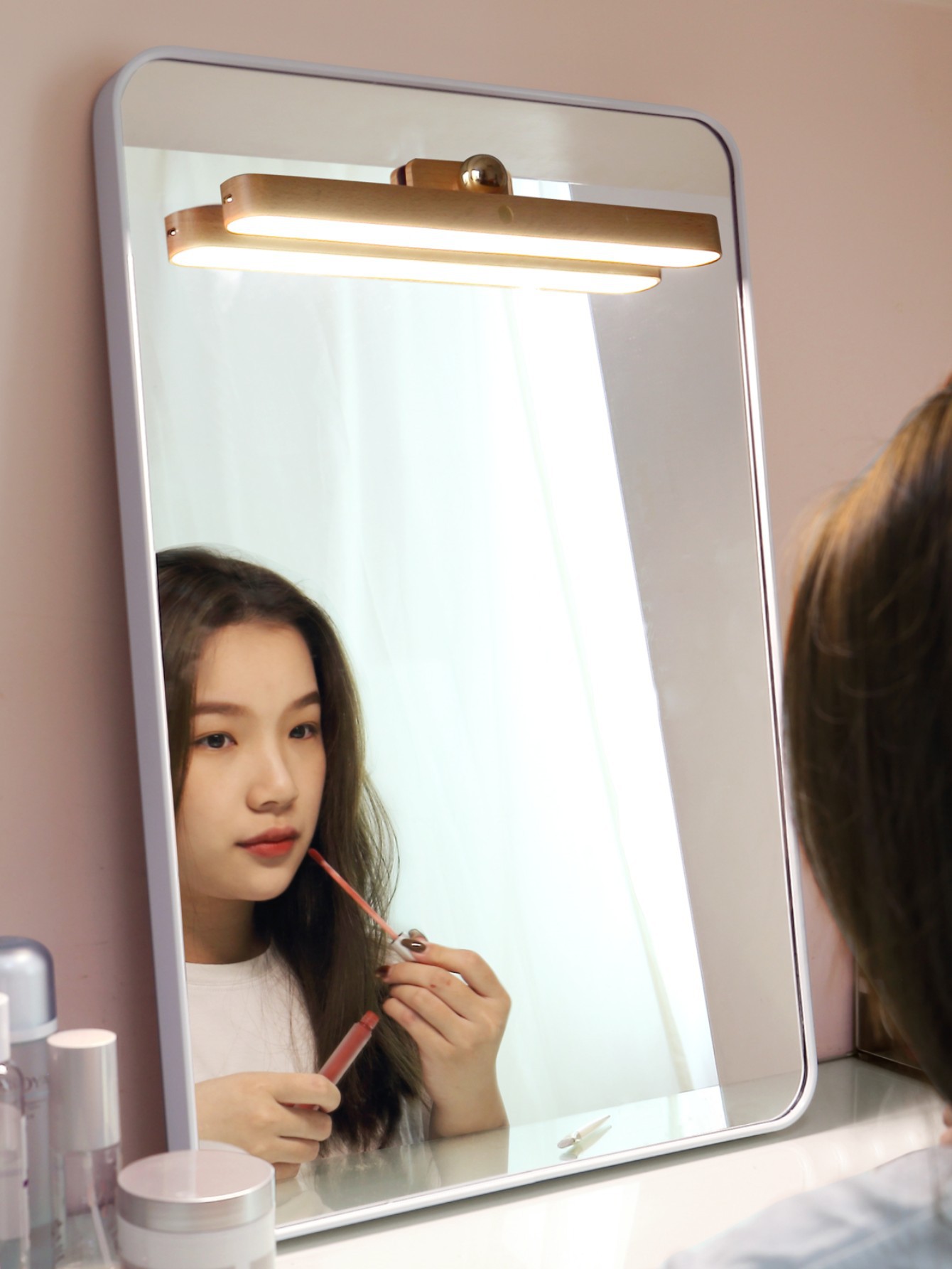 북유럽 스타일의 원목 거울 헤드라이트, 정교한 금속 장식으로 따뜻한 빛을 연출하여 세련된 세면대 분위기를 조성합니다.