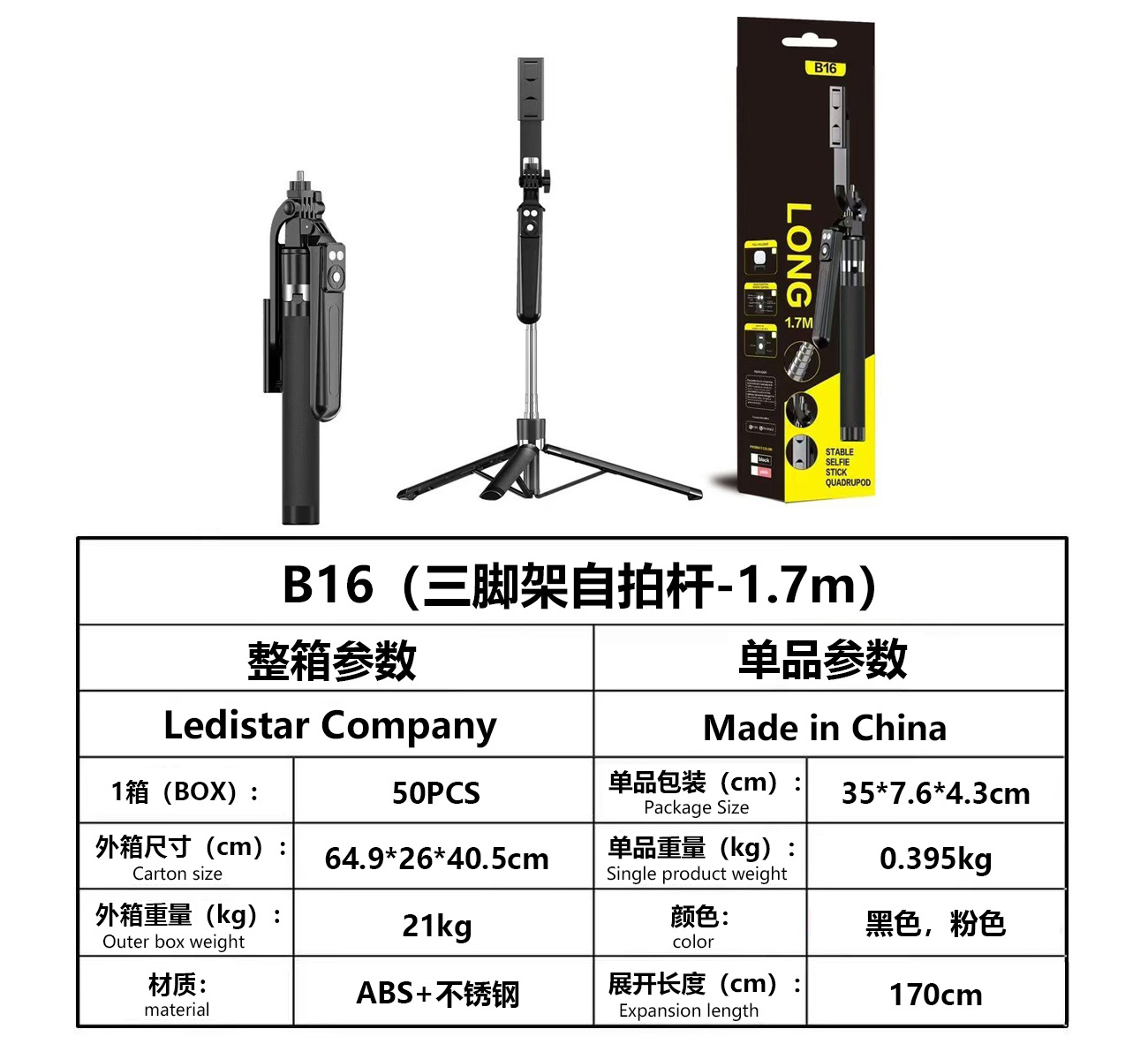 • 1.7m B16 셀카봉 블랙 + 작은 사각형 조명 1개