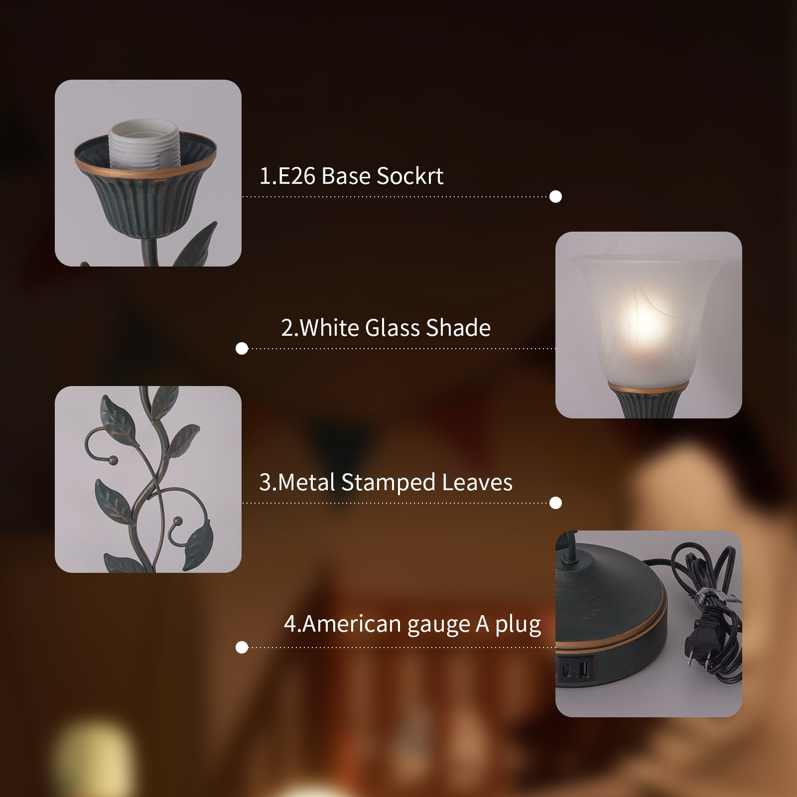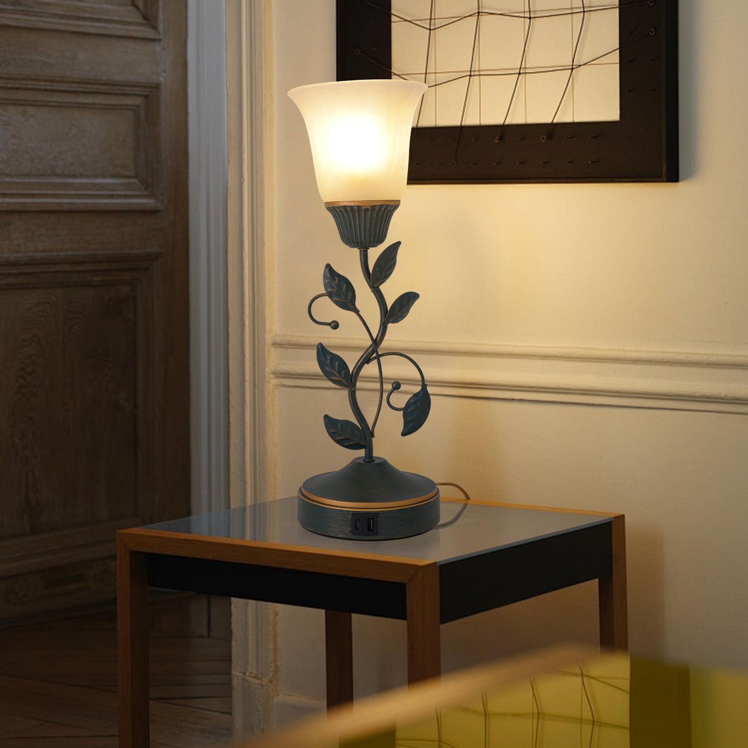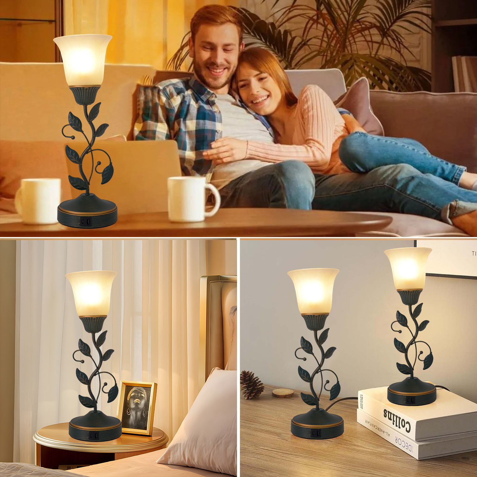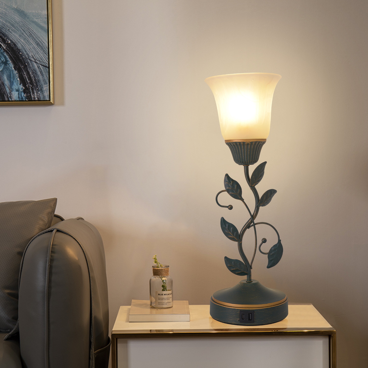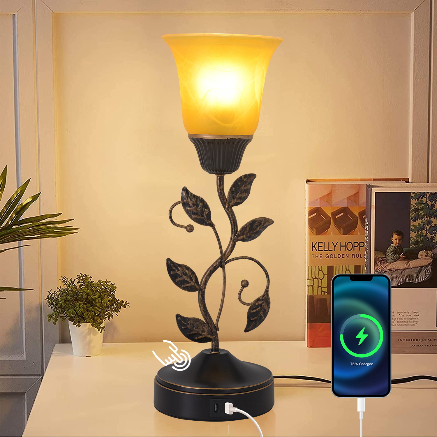 USB 인터페이스가 있는 터치 테이블 램프 3단 디밍 LED 침대 옆 램프 흰색 유리 갓 단풍잎 장식 침실 테이블 램프