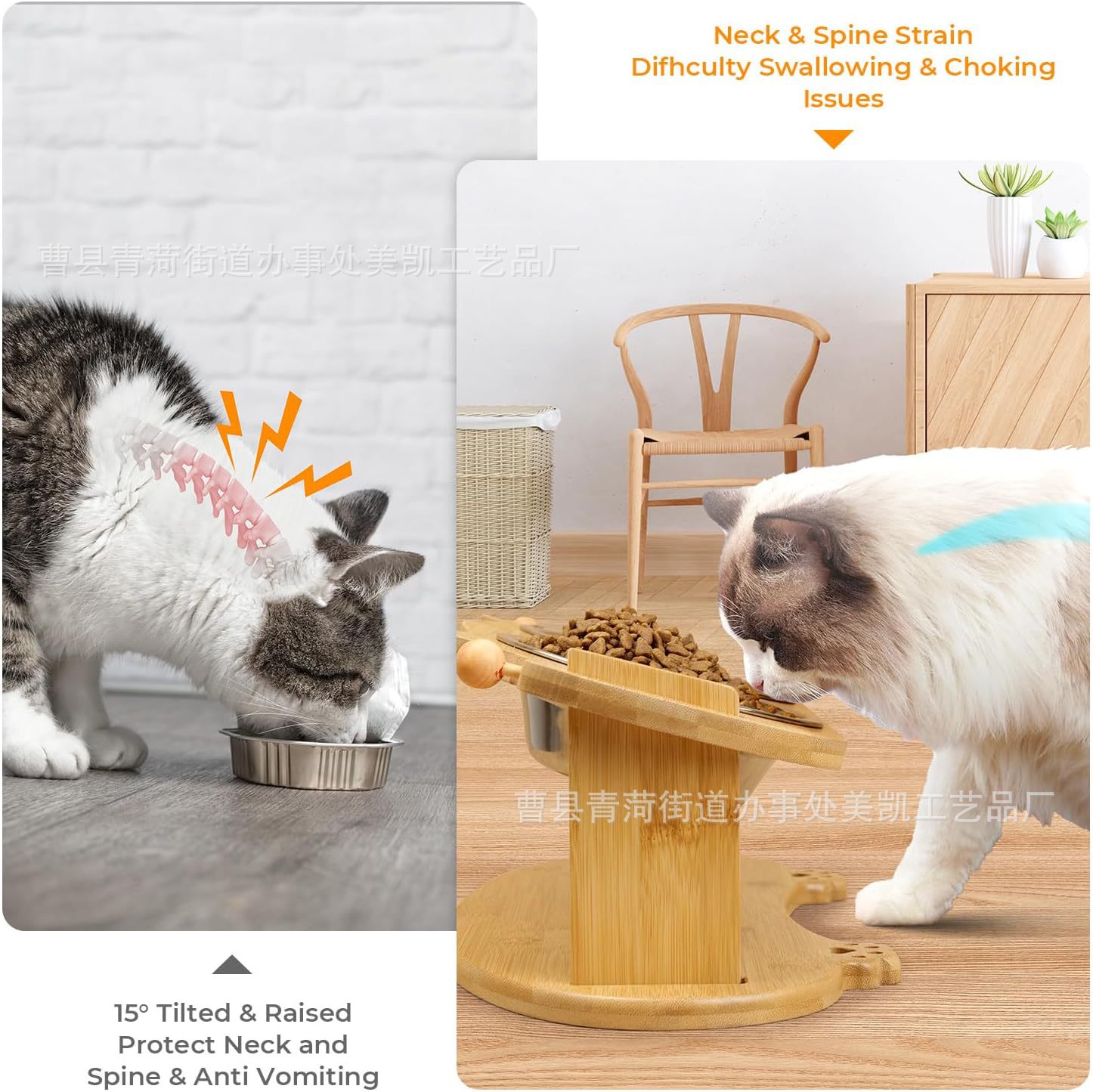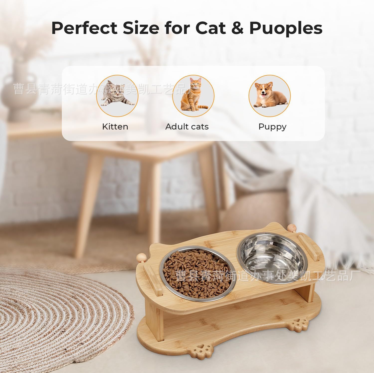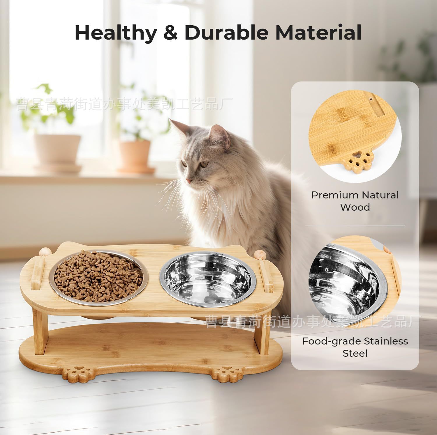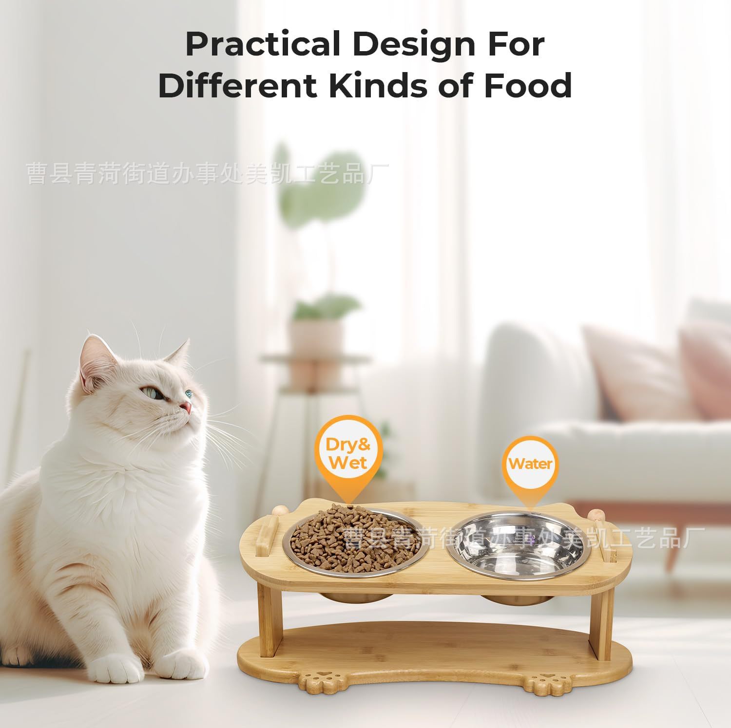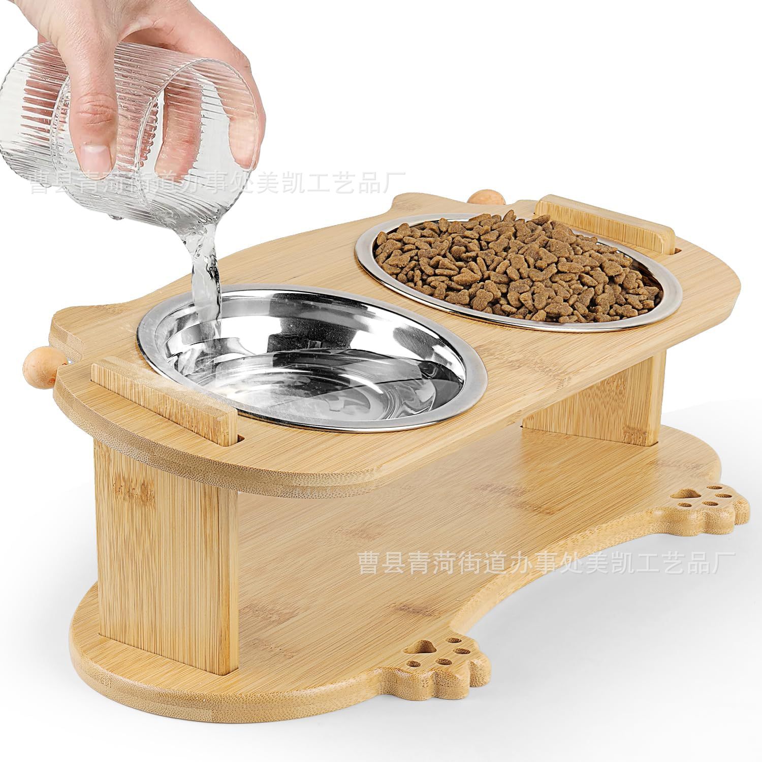 나무 애완 동물 고양이와 개 그릇 랙 단단한 나무 세라믹 스테인레스 스틸 더블 그릇 경사 목 보호 고양이 먹이 그릇 랙 애완 동물 밥 그릇