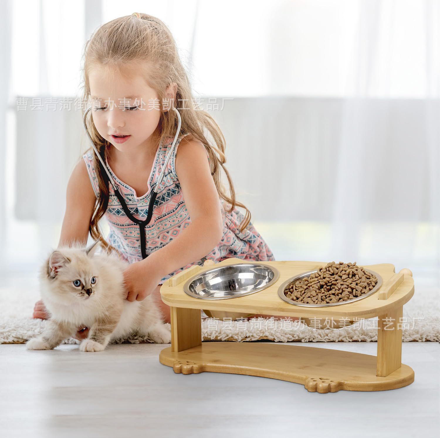 나무 애완 동물 고양이와 개 그릇 랙 단단한 나무 세라믹 스테인레스 스틸 더블 그릇 경사 목 보호 고양이 먹이 그릇 랙 애완 동물 밥 그릇스토어 가기