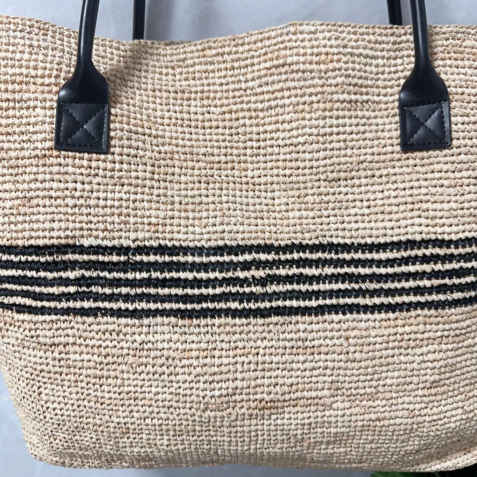 여성을위한 프랑스 고품질 대용량 라피아 스트라이프 짠 가방 해변 휴가 다목적 밀짚 휴대용 어깨 가방