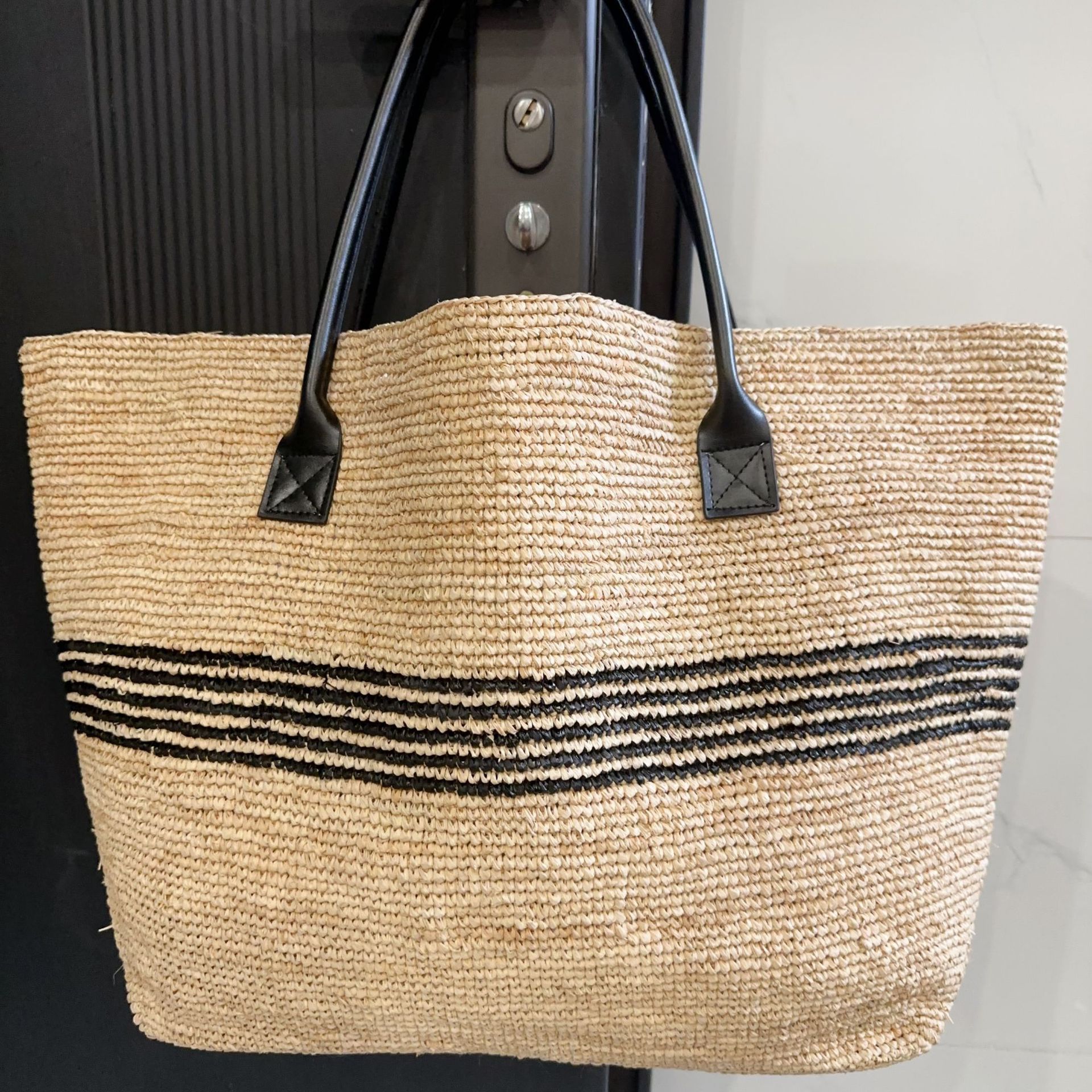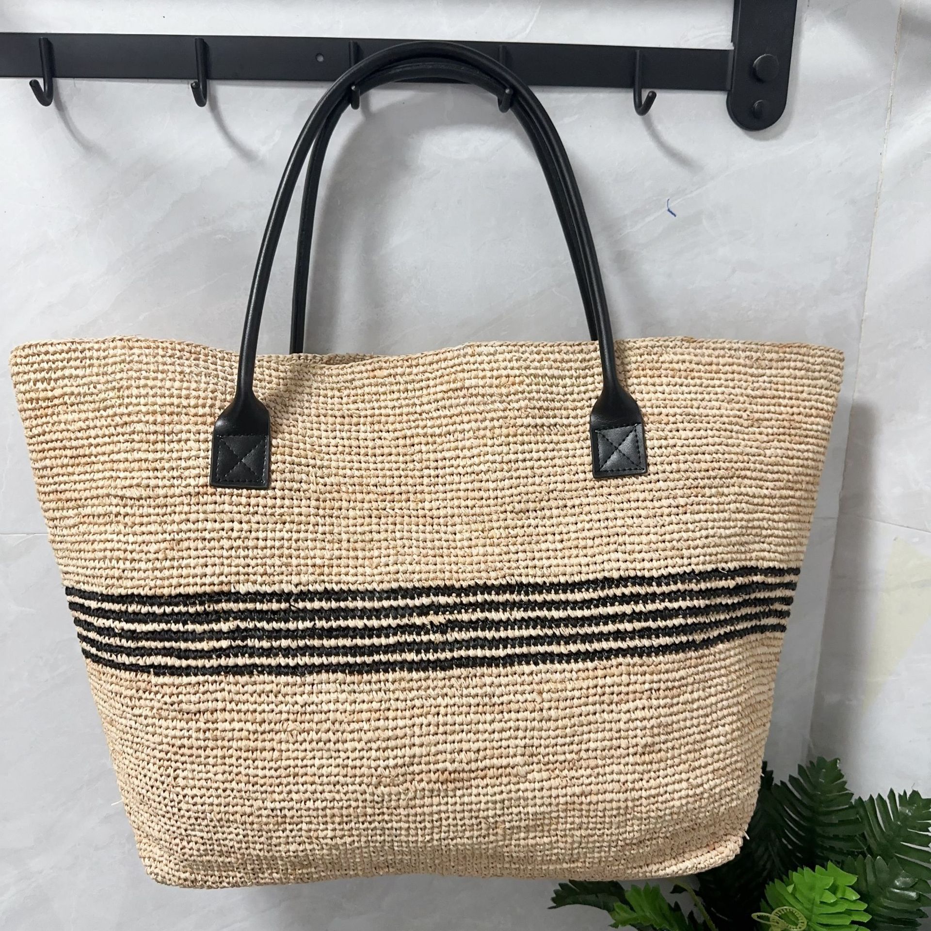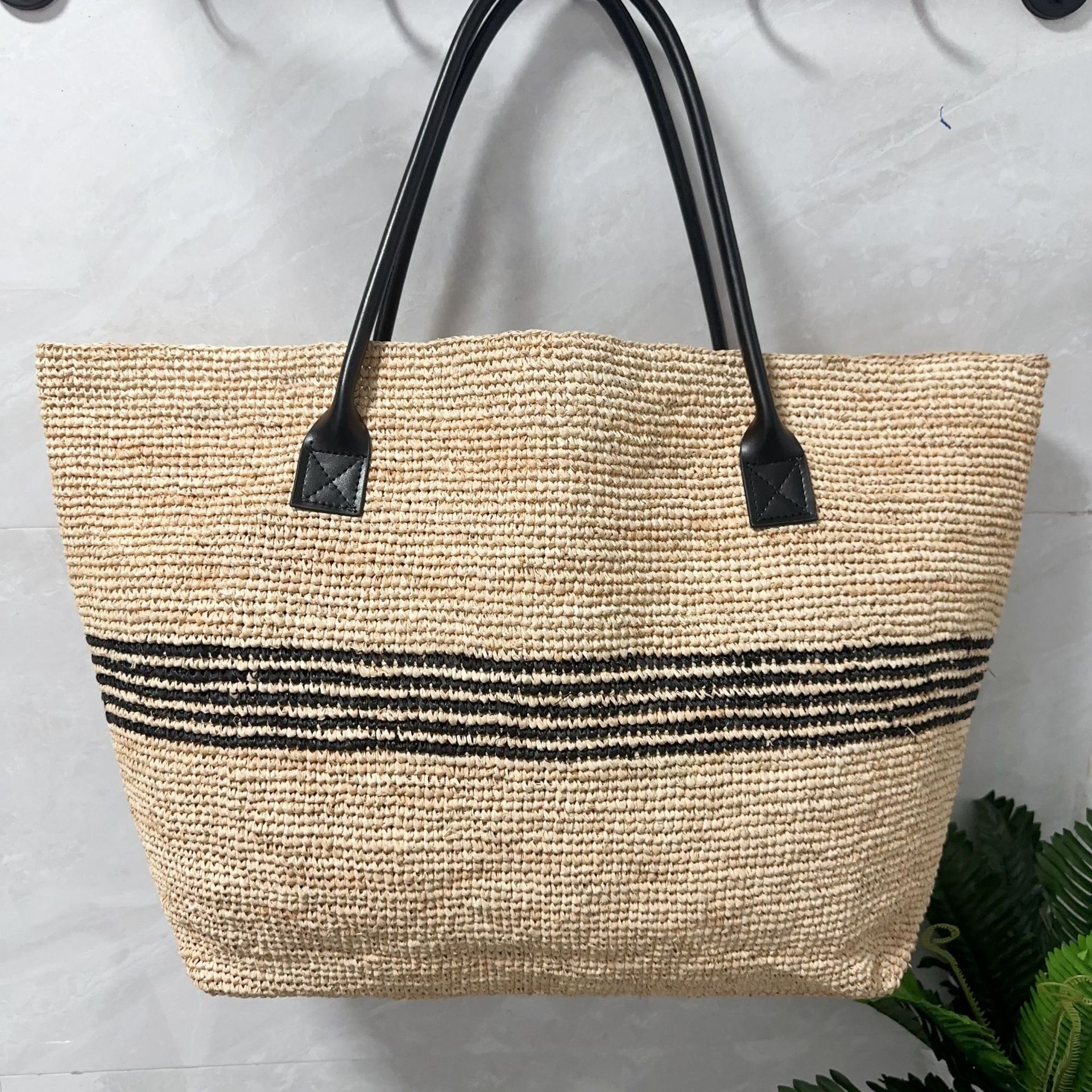 여성을위한 프랑스 고품질 대용량 라피아 스트라이프 짠 가방 해변 휴가 다목적 밀짚 휴대용 어깨 가방스토어 가기