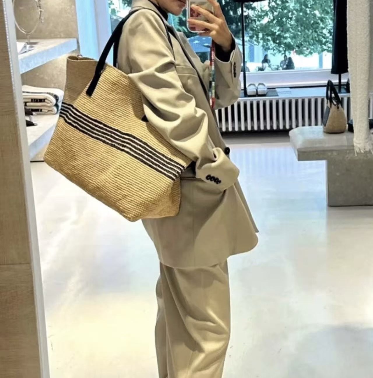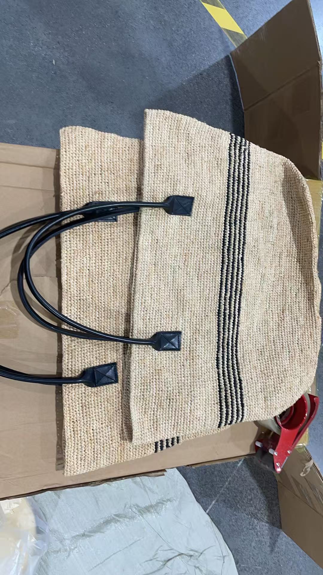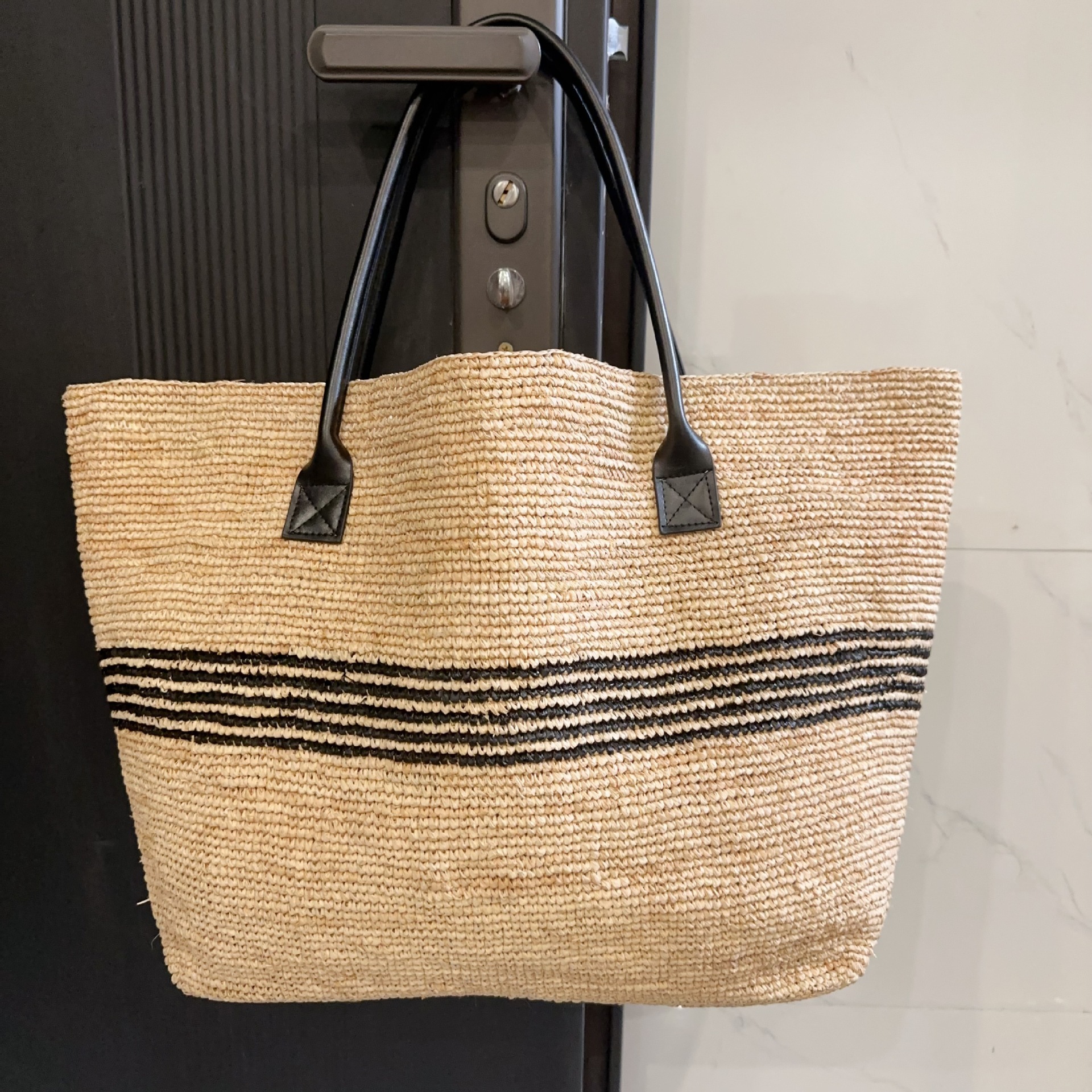 여성을위한 프랑스 고품질 대용량 라피아 스트라이프 짠 가방 해변 휴가 다목적 밀짚 휴대용 어깨 가방스토어 가기