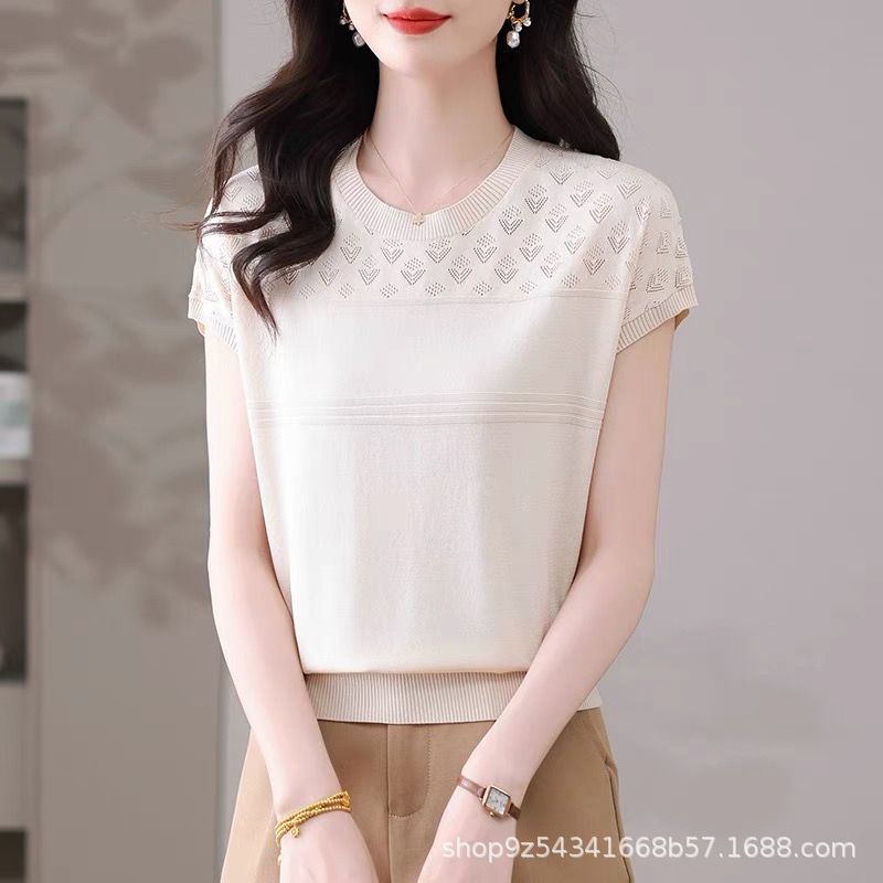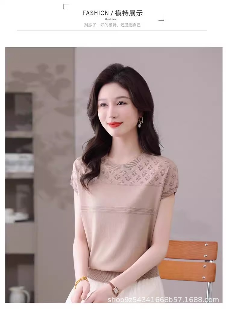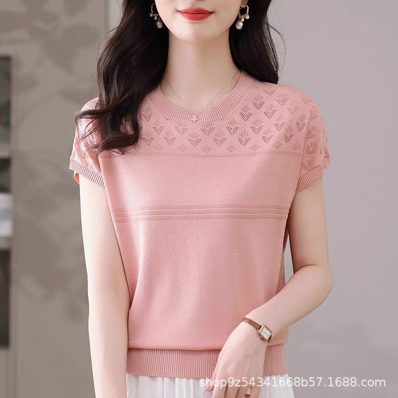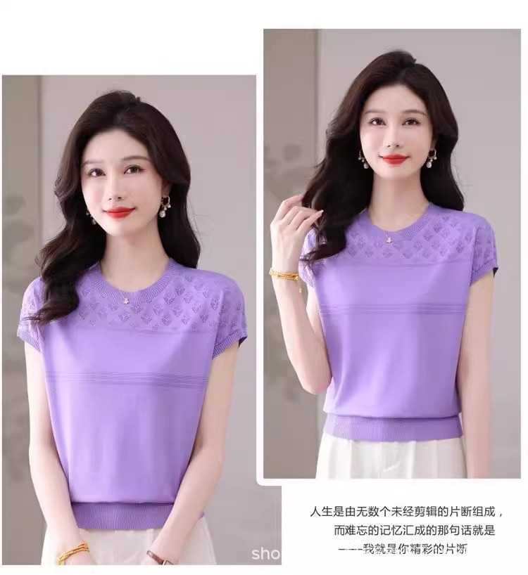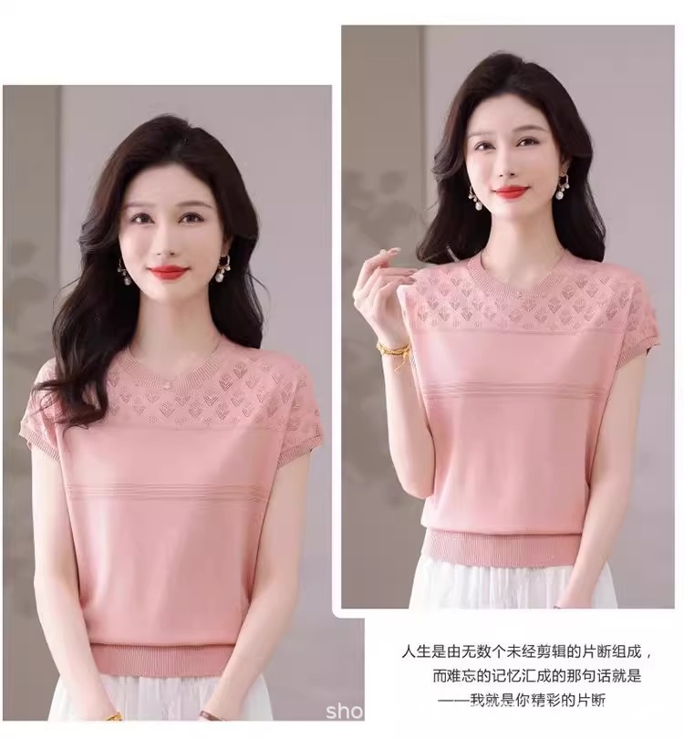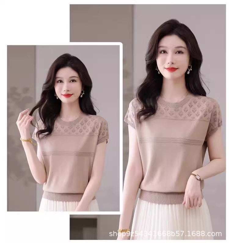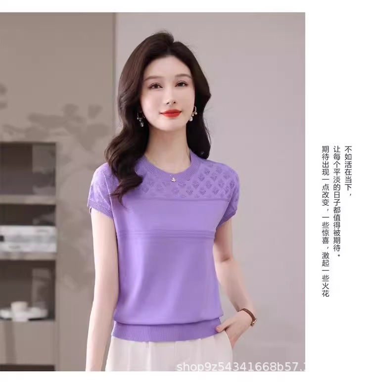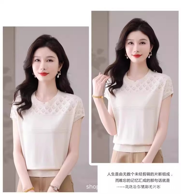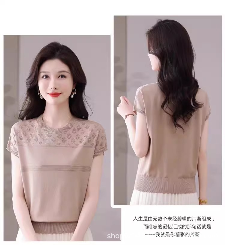 여성을위한 얼음 실크 반팔 티셔츠 2025 새로운 여름 중년 어머니 얇은 중공 스웨터 탑 서양식 작은 셔츠스토어 가기