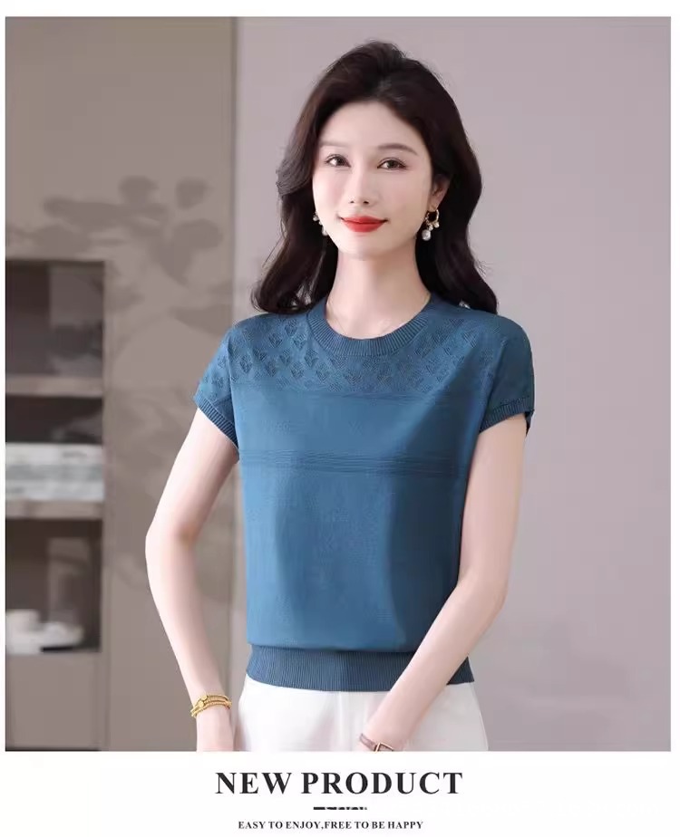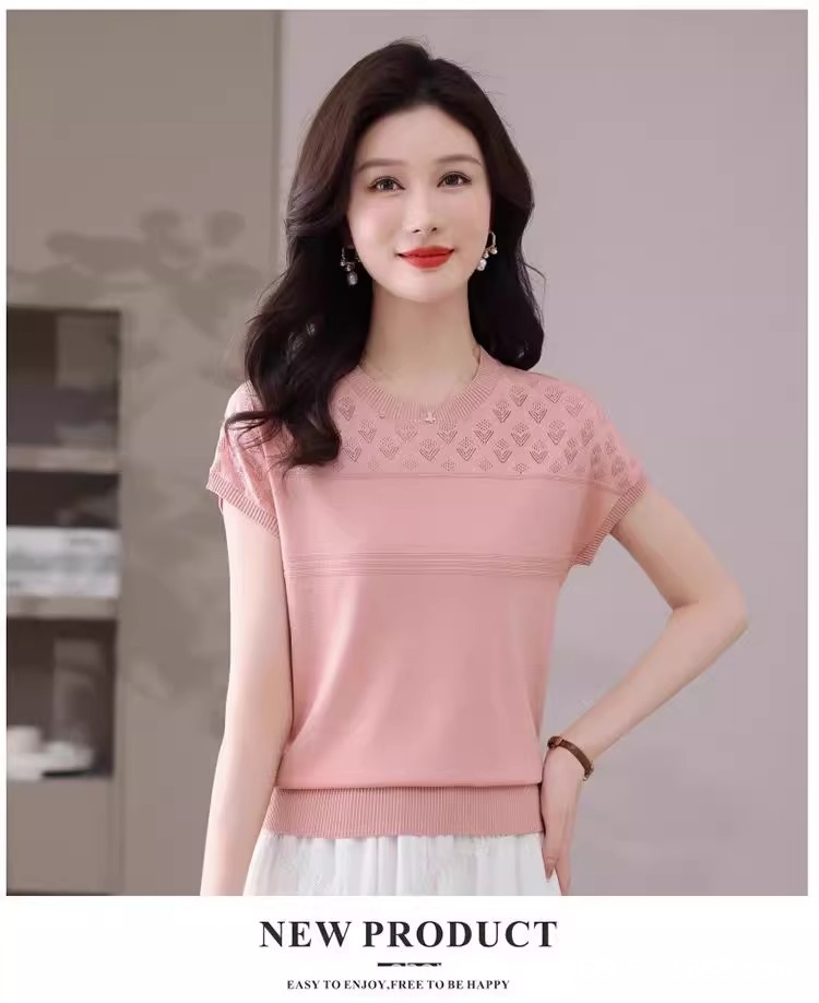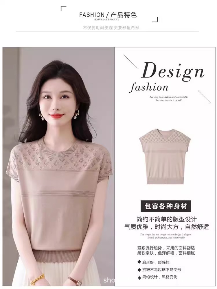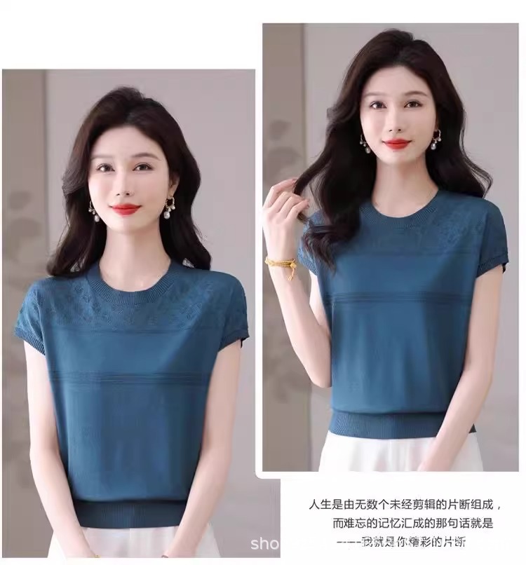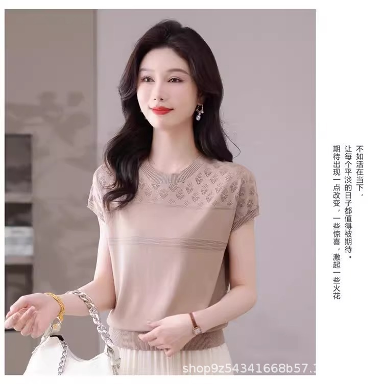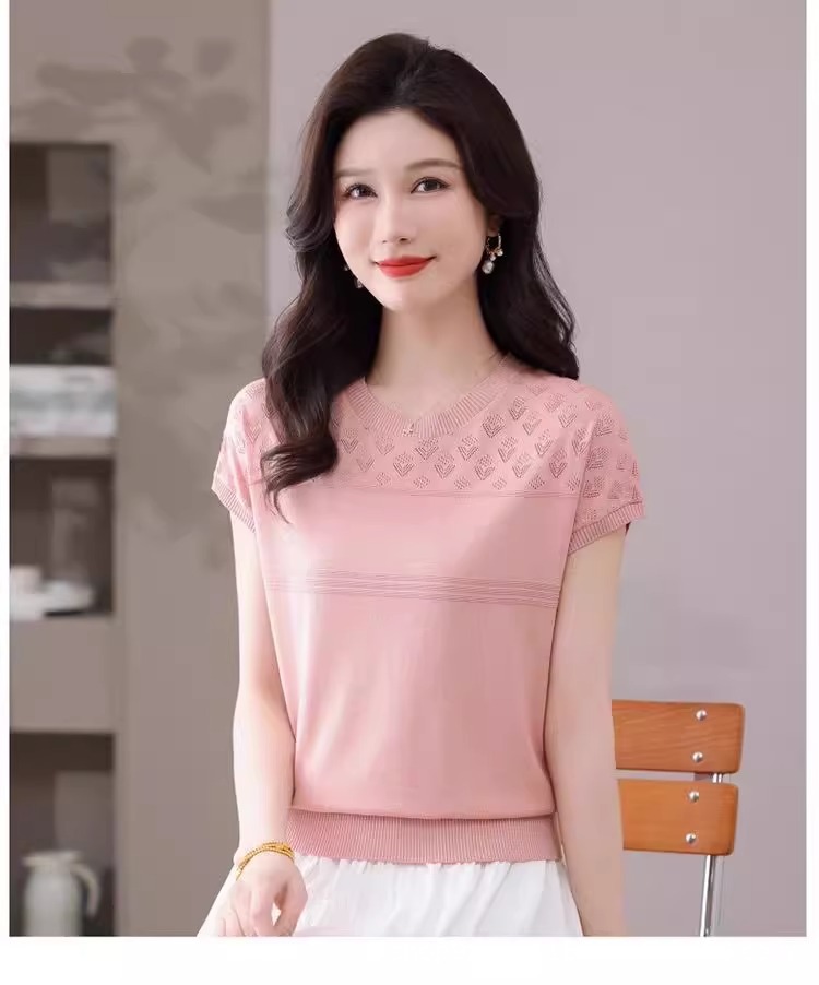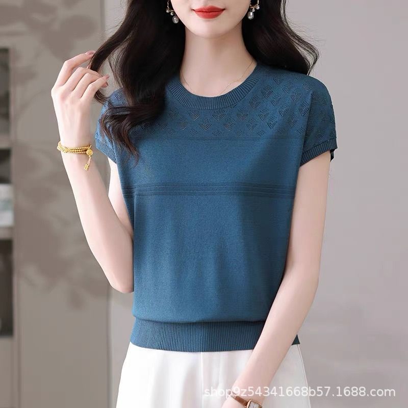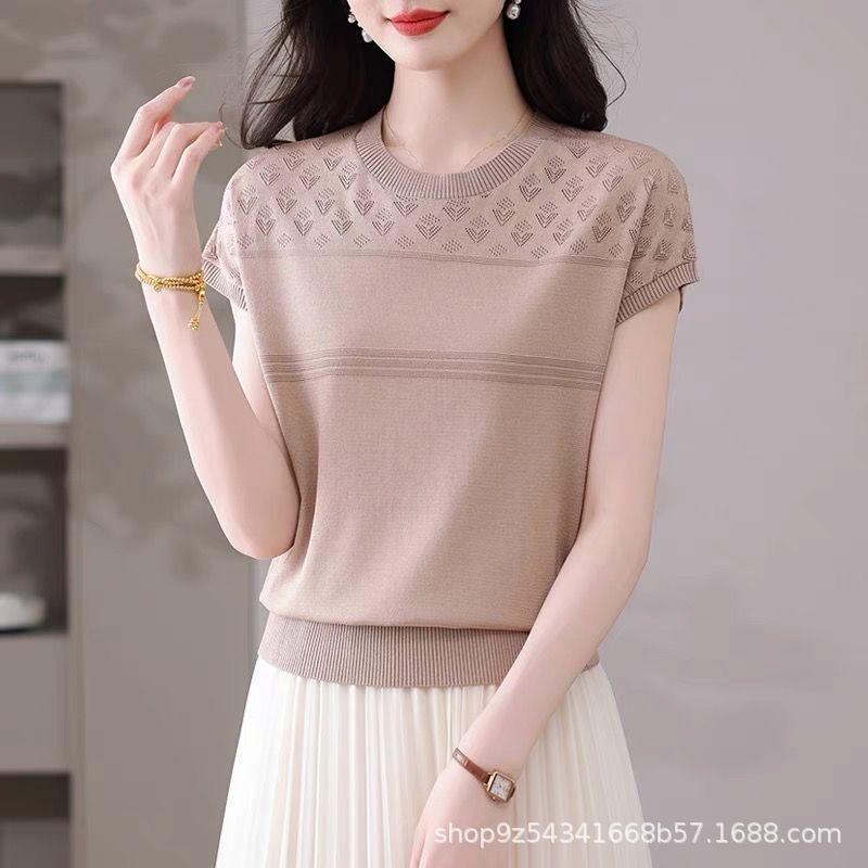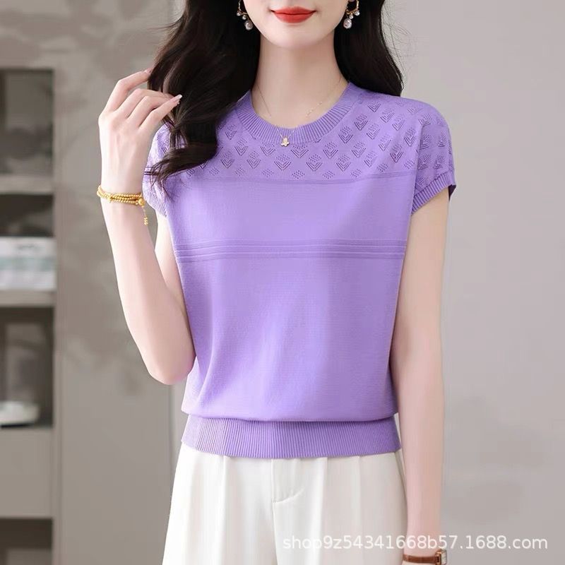 여성을위한 얼음 실크 반팔 티셔츠 2025 새로운 여름 중년 어머니 얇은 중공 스웨터 탑 서양식 작은 셔츠스토어 가기