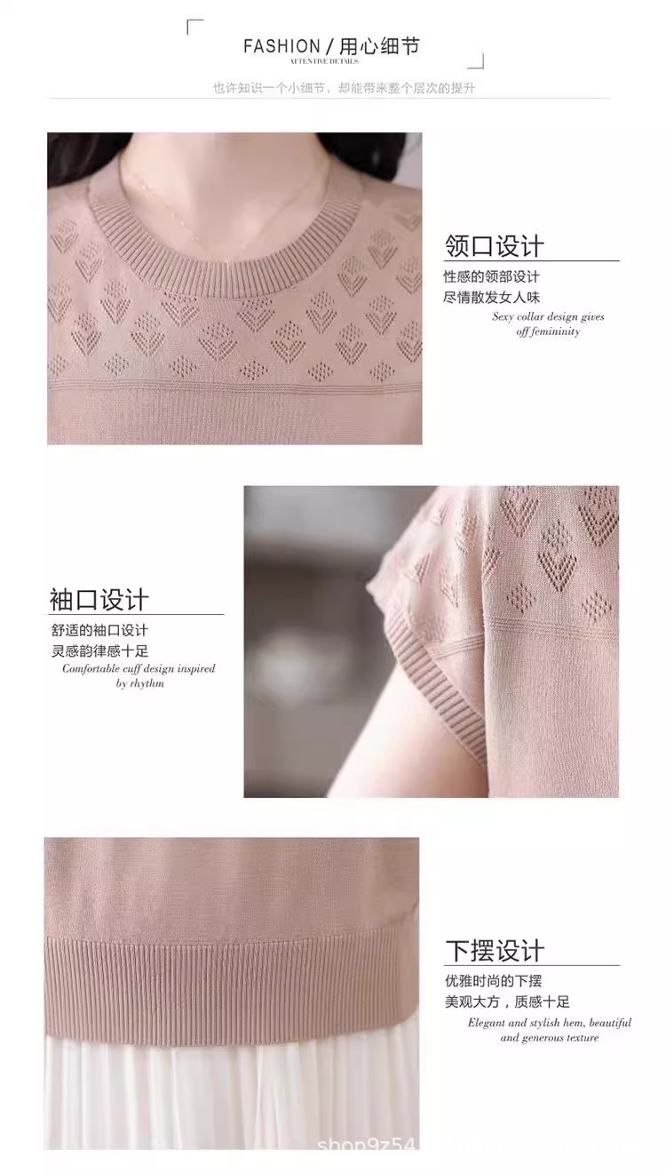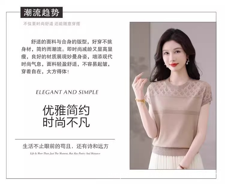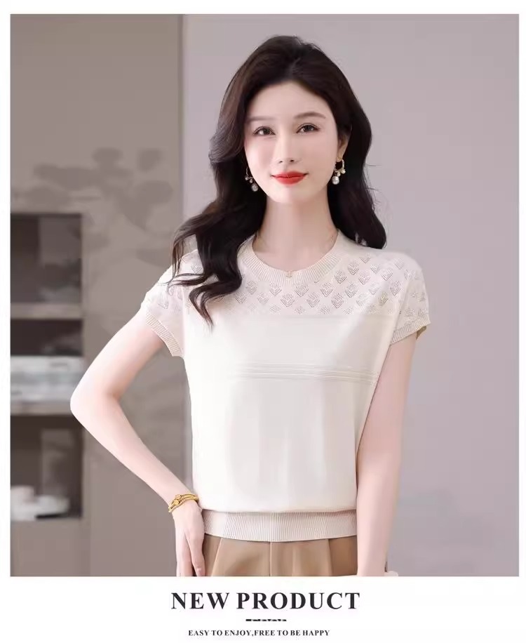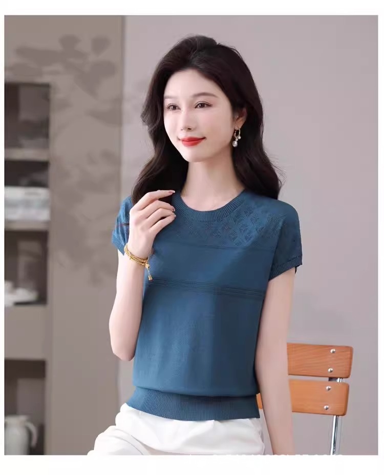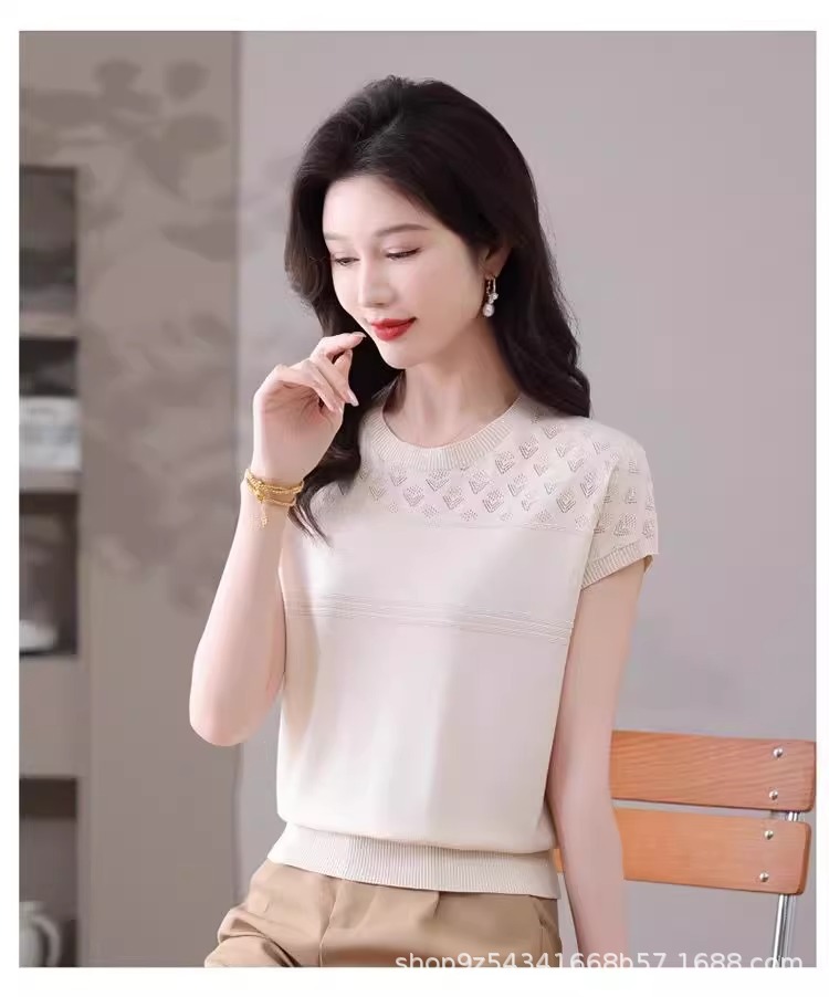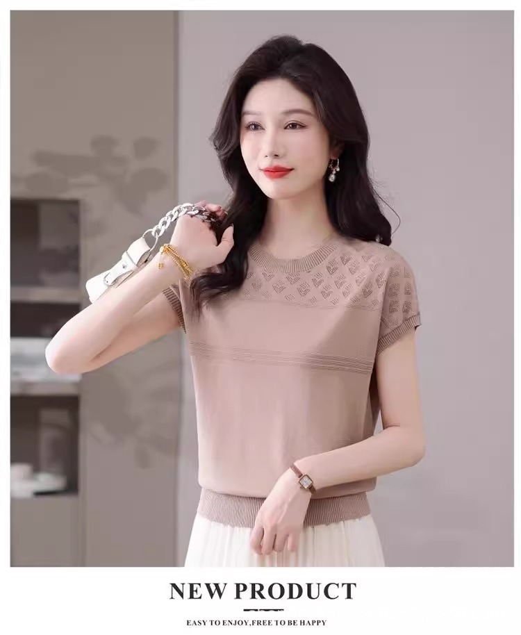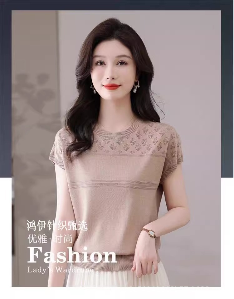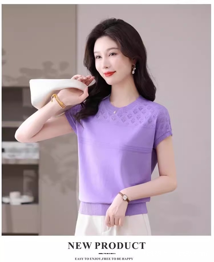 여성을위한 얼음 실크 반팔 티셔츠 2025 새로운 여름 중년 어머니 얇은 중공 스웨터 탑 서양식 작은 셔츠스토어 가기