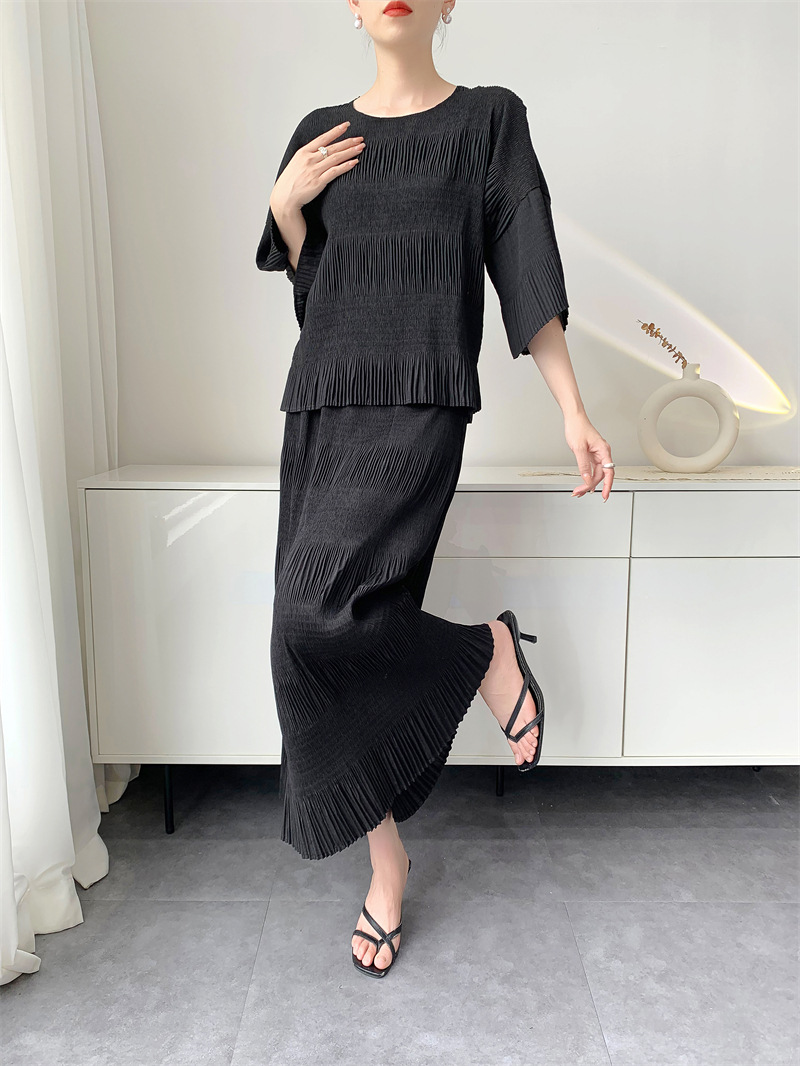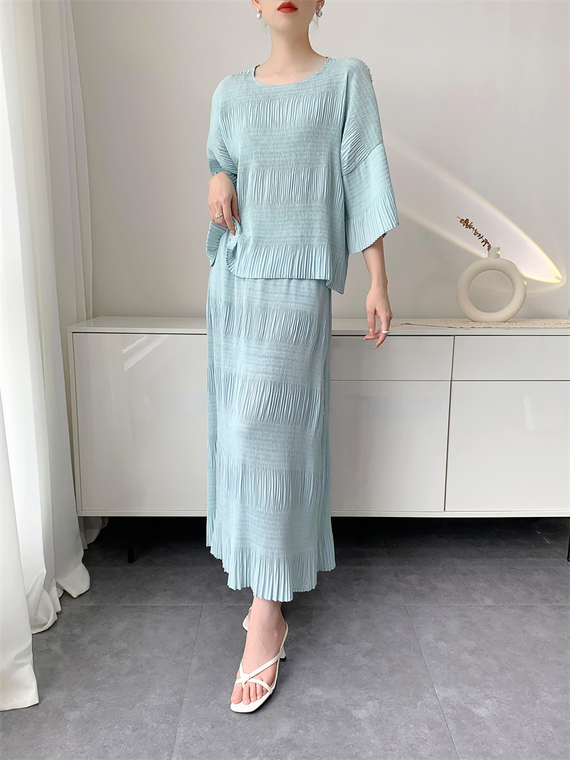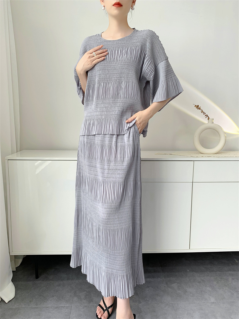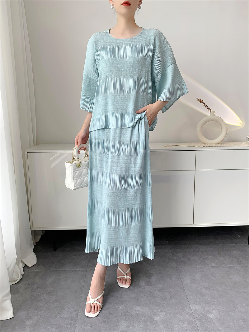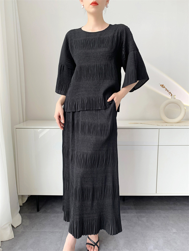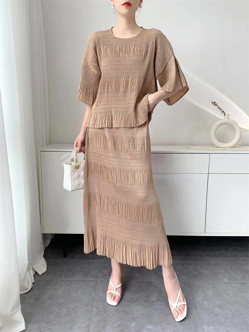 미야케 스타일의 고급 주름 세트 여성의 2025 년 여름 새로운 탑 오버 스커트 기질 시대-편안한 레저 감소