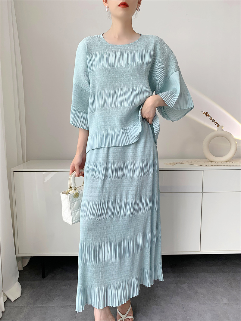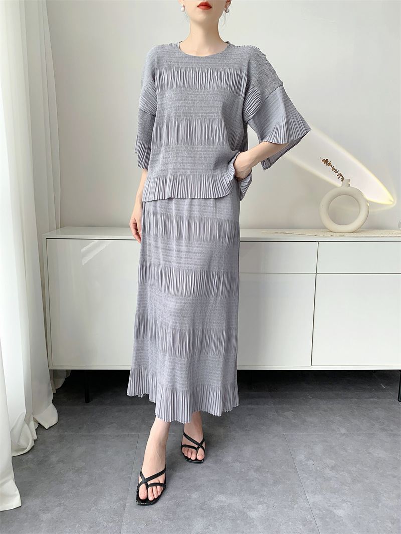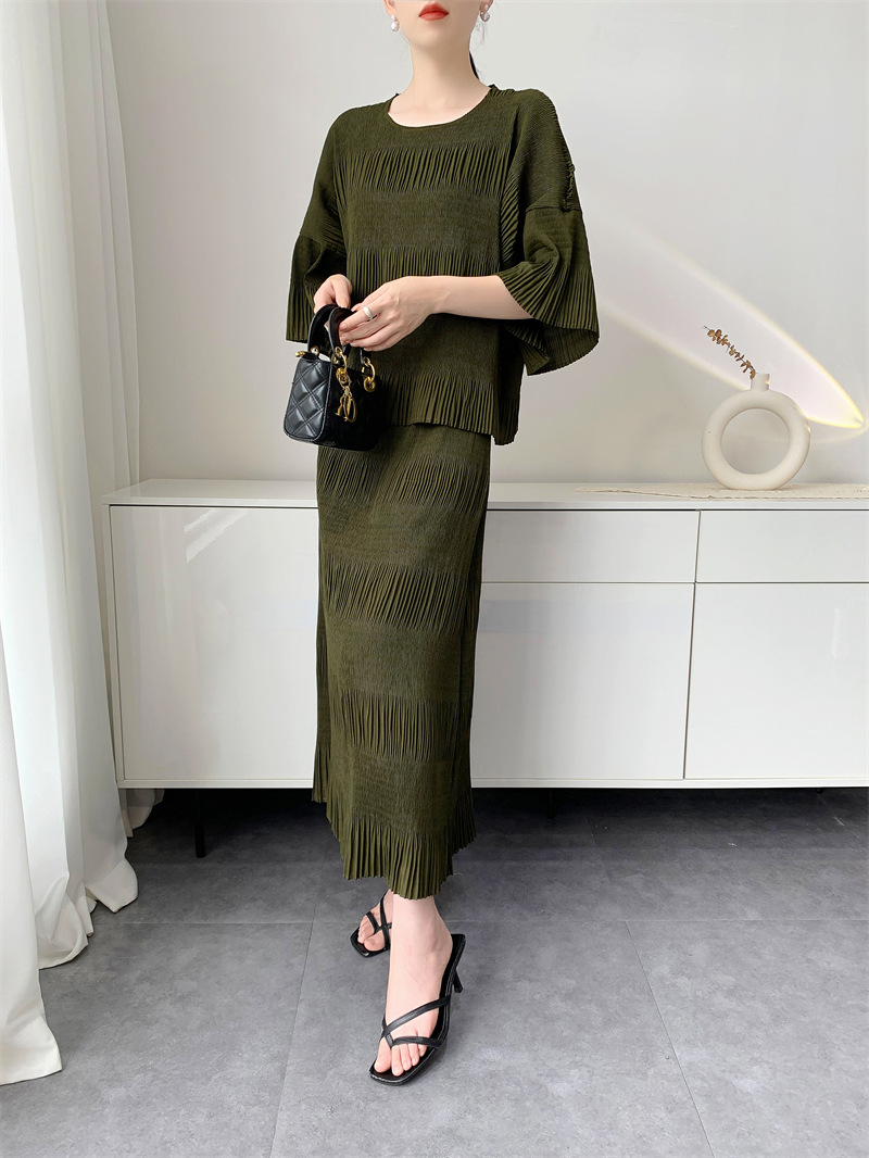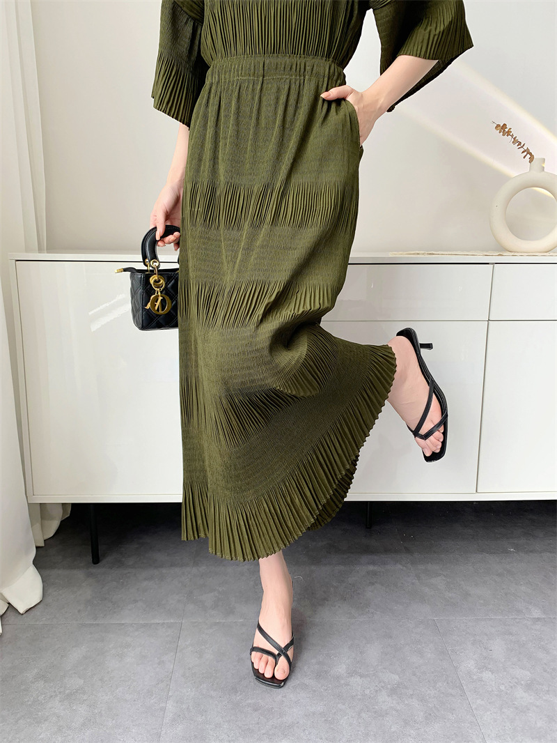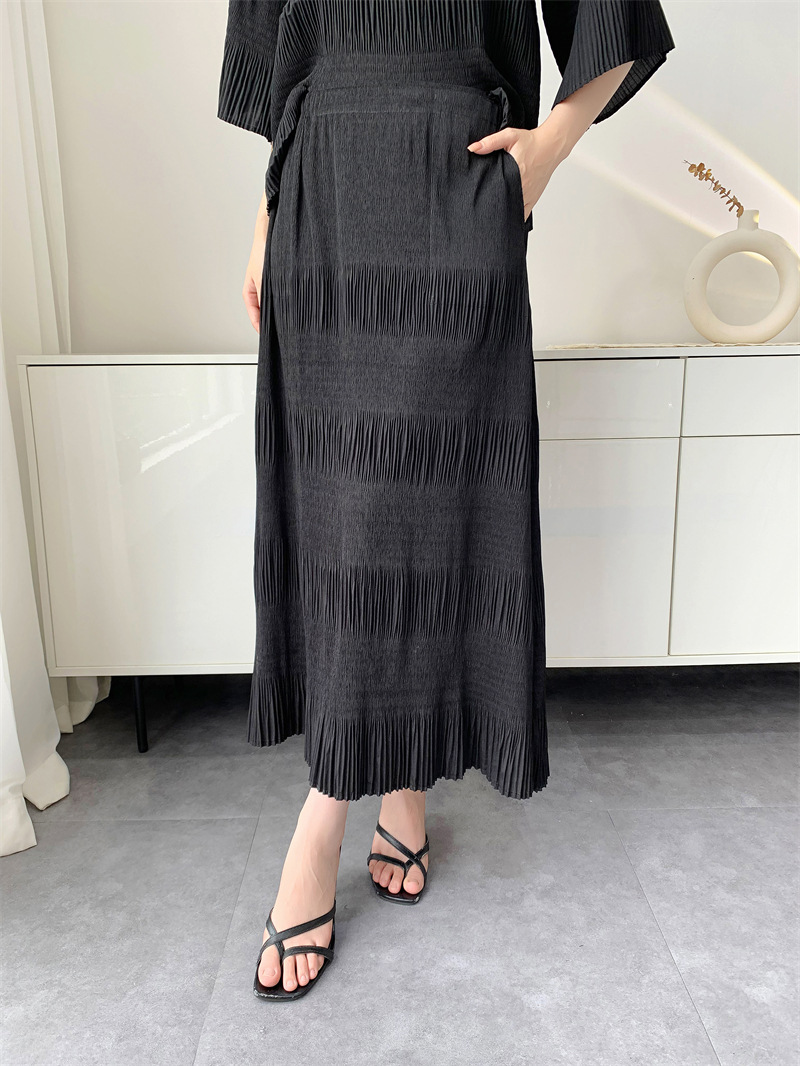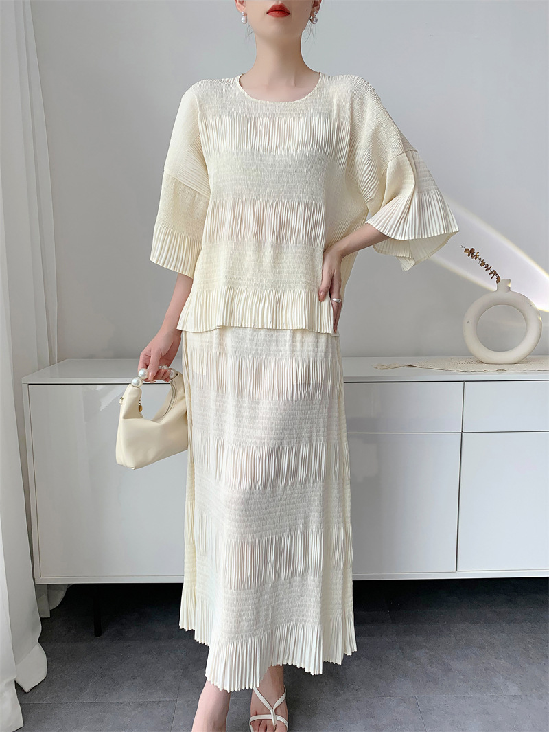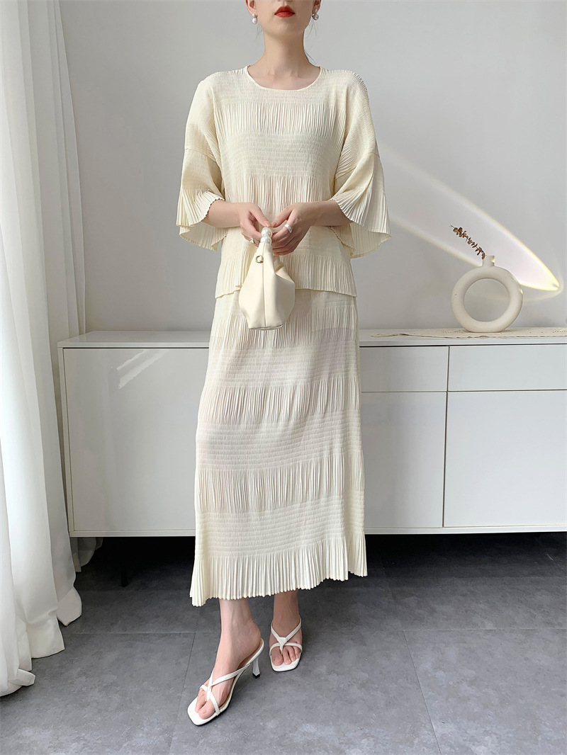 미야케 스타일의 고급 주름 세트 여성의 2025 년 여름 새로운 탑 오버 스커트 기질 시대-편안한 레저 감소