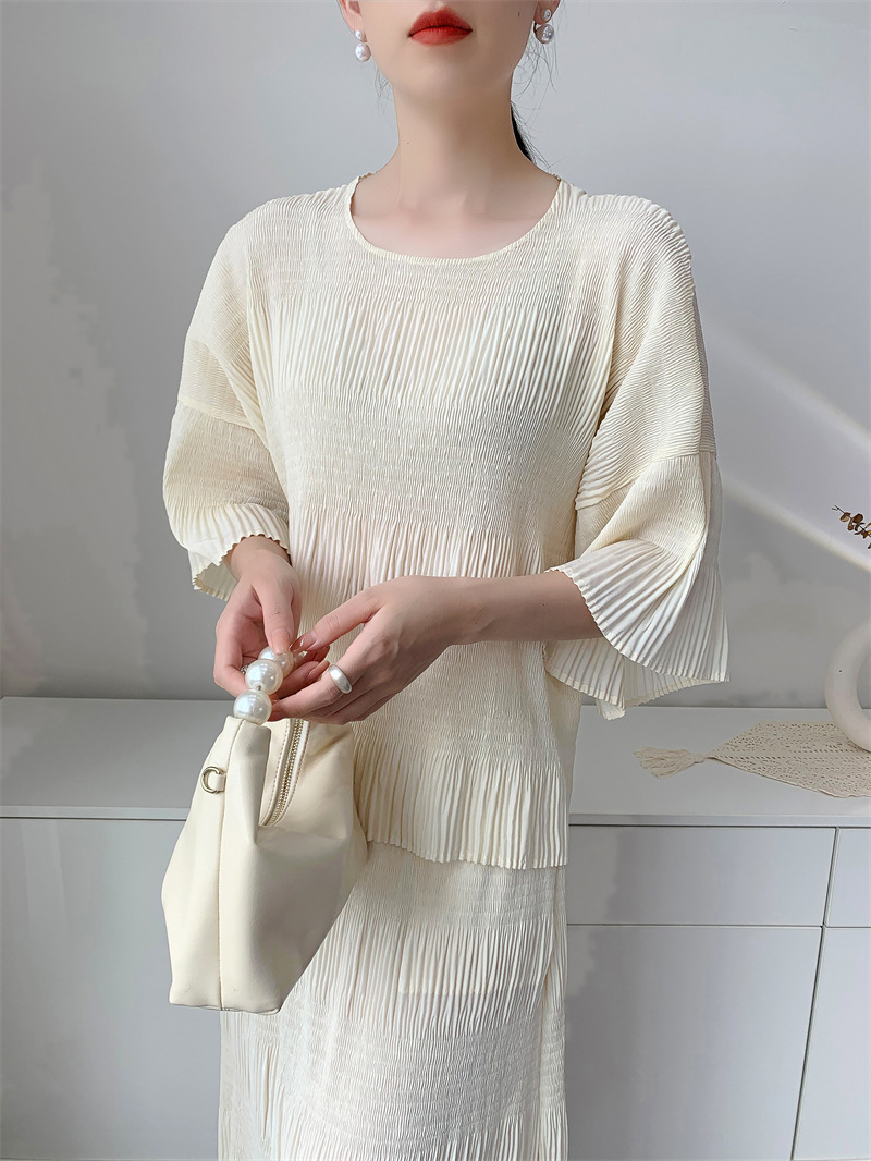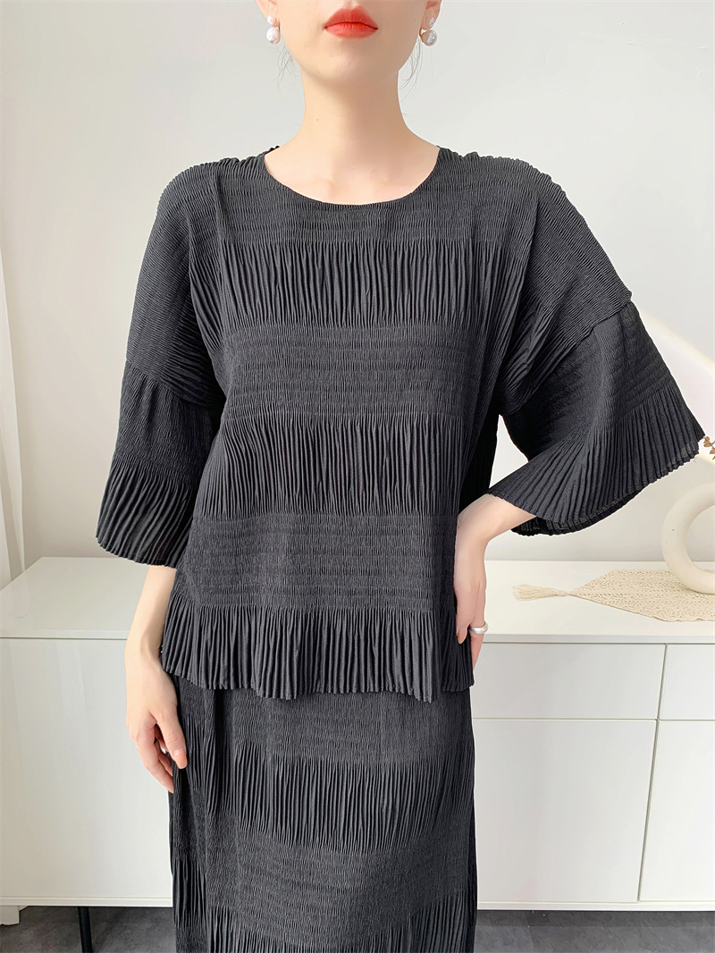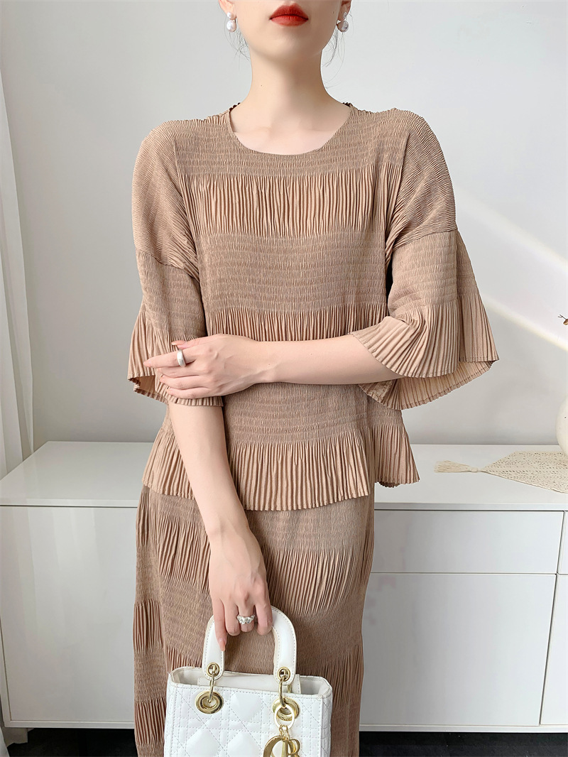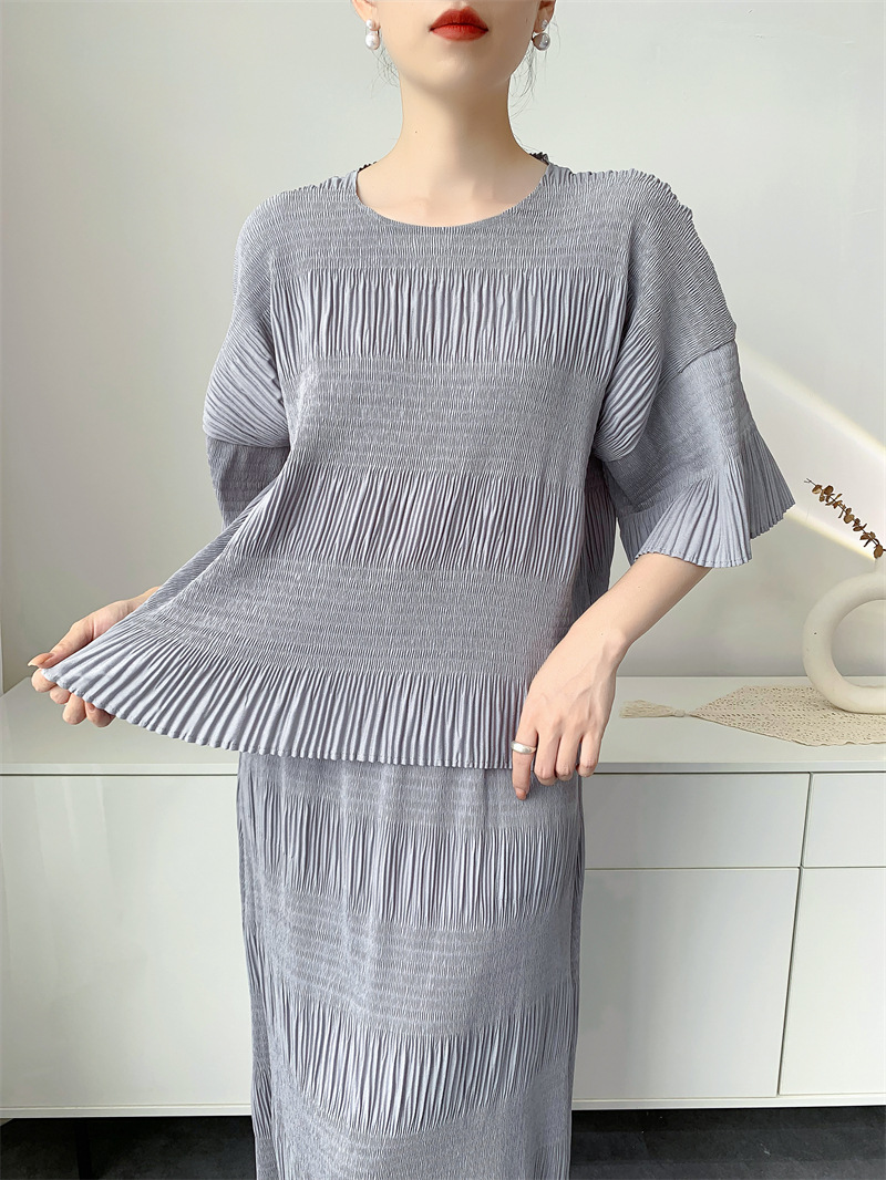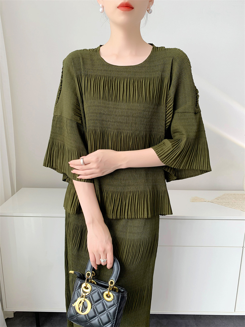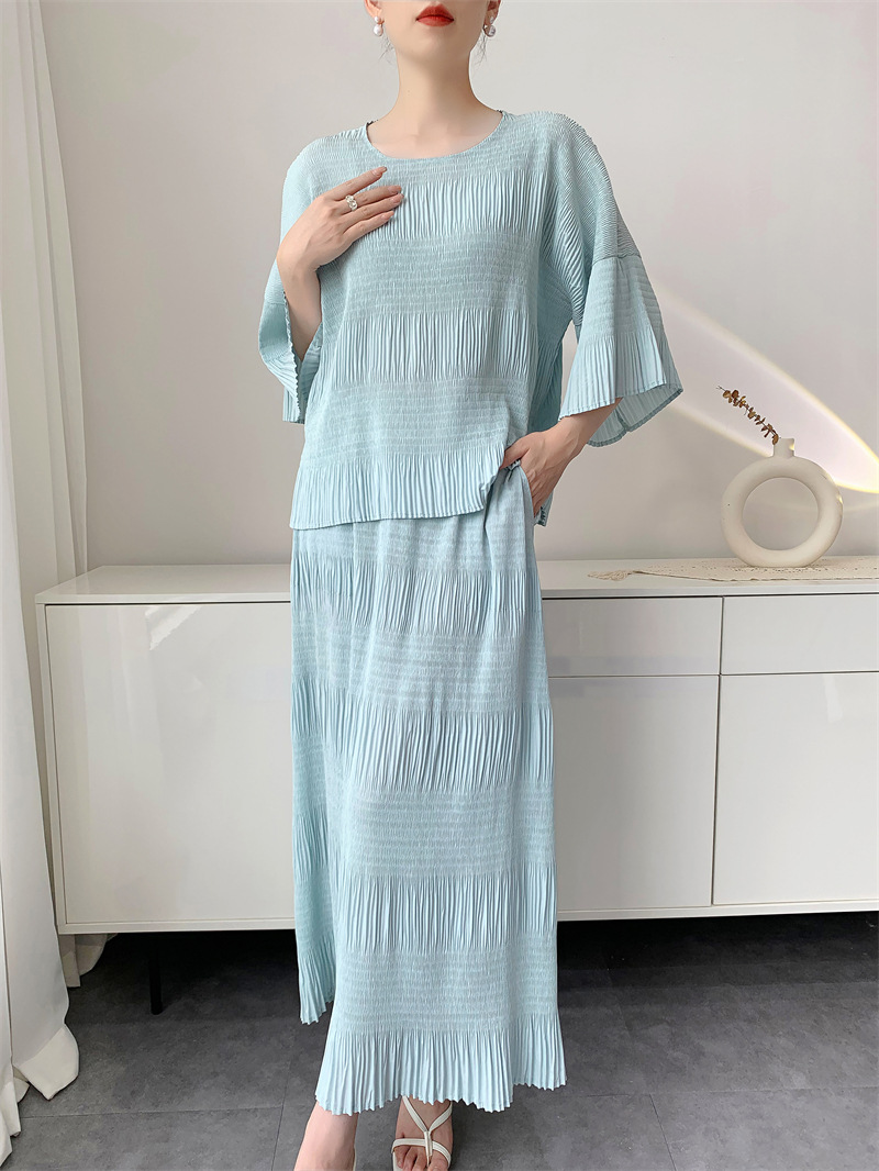 미야케 스타일의 고급 주름 세트 여성의 2025 년 여름 새로운 탑 오버 스커트 기질 시대-편안한 레저 감소
