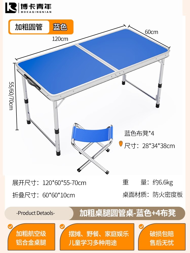 • [업그레이드 된 알루미늄 합금 사각 튜브] 120*60cm 블루 + 천 의자 4개