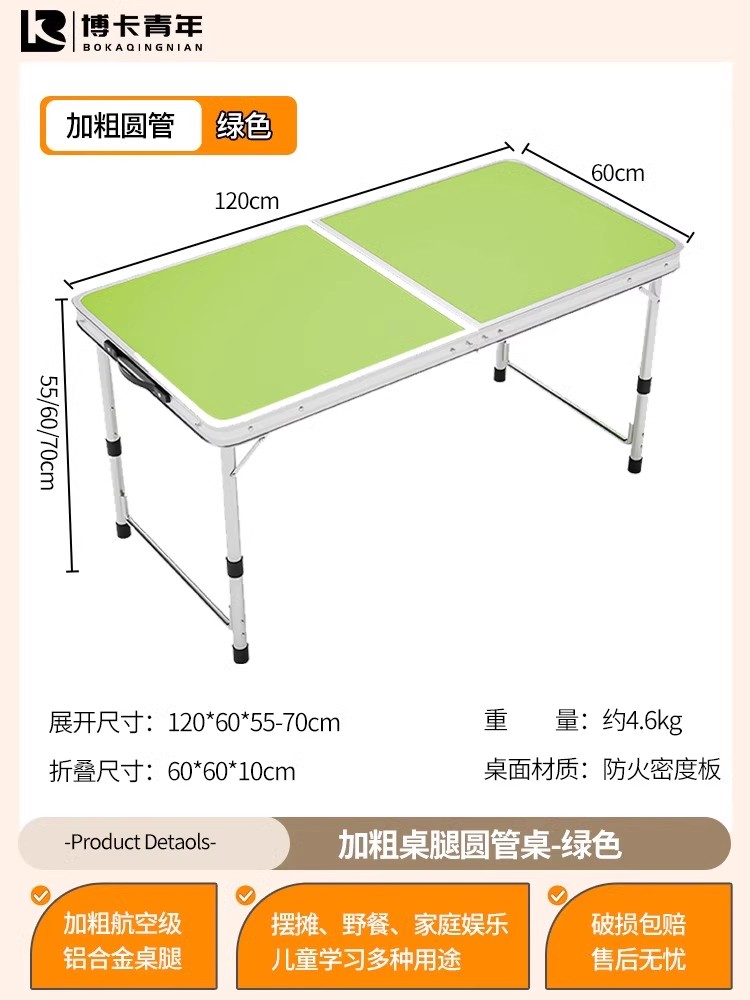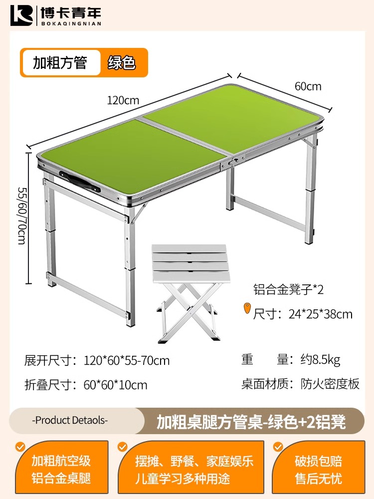• [업그레이드 된 알루미늄 합금 사각 튜브] 120*60cm 녹색 + 알루미늄 의자 2개