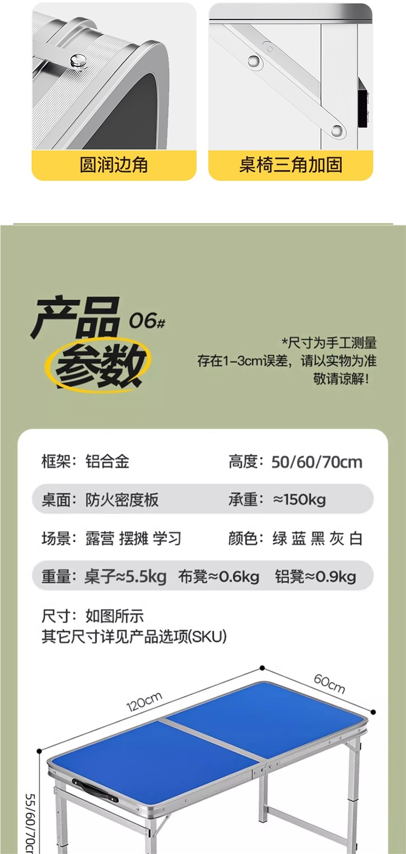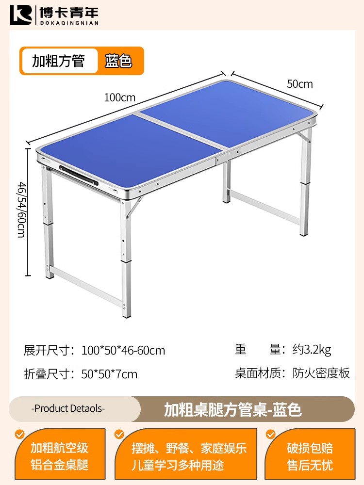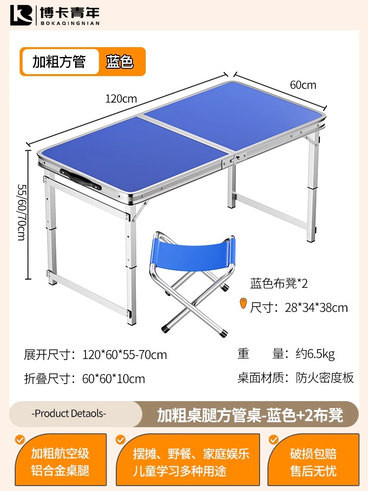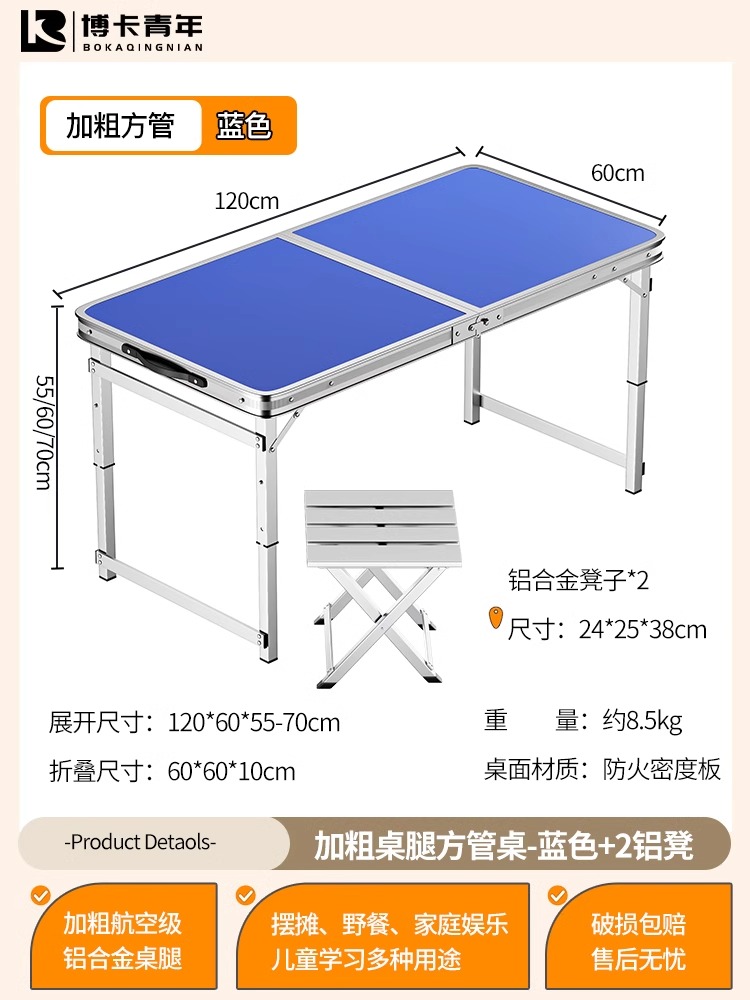 • [업그레이드 된 알루미늄 합금 사각 튜브] 120*60cm 파란색 + 알루미늄 의자 2개