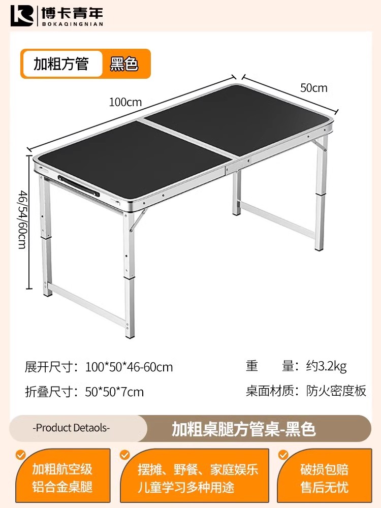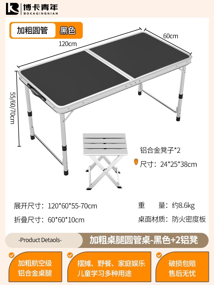 • [업그레이드 된 알루미늄 합금 사각 튜브] 120*60cm 검정색 + 알루미늄 의자 2개