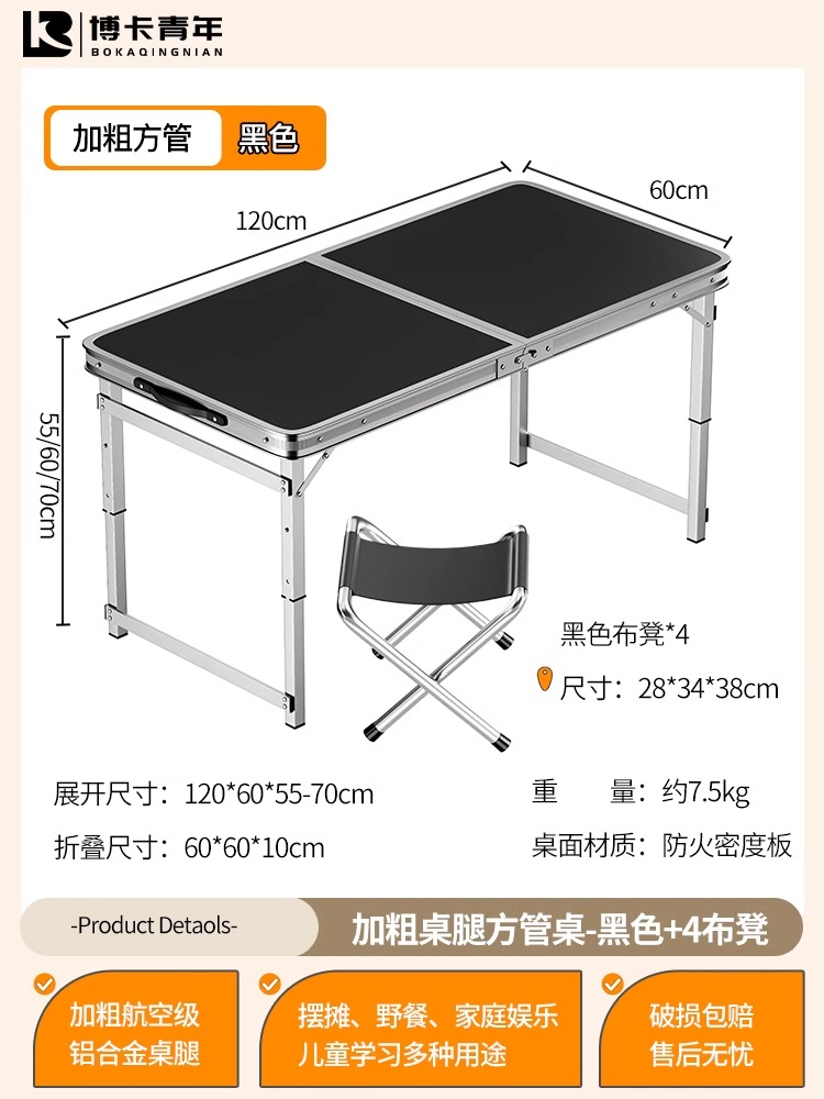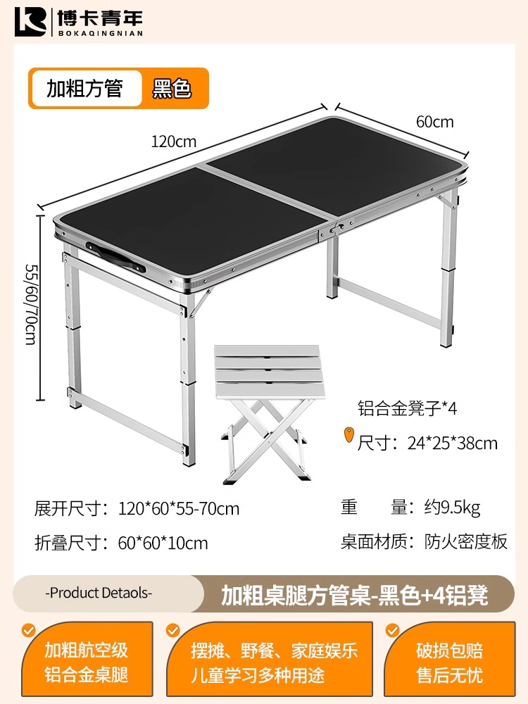 • [업그레이드 된 알루미늄 합금 사각 튜브] 120*60cm 검정색 + 알루미늄 의자 4개