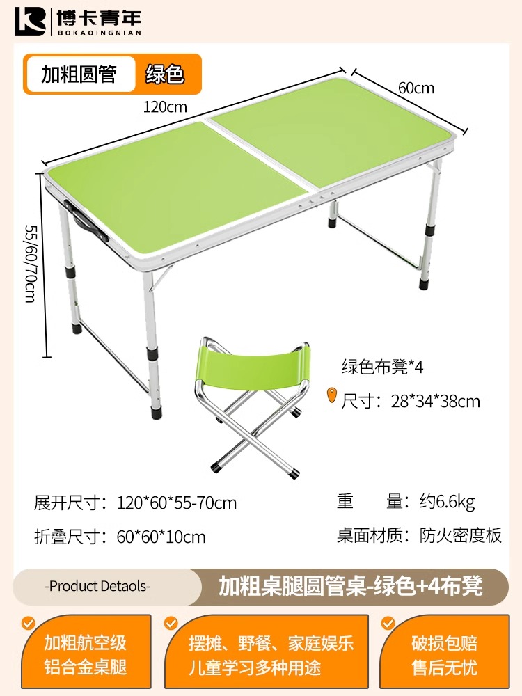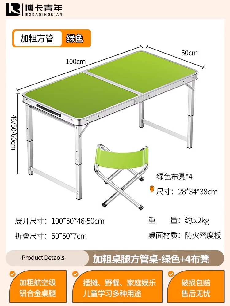 • [업그레이드 된 알루미늄 합금 사각 튜브] 120*60cm 녹색 + 알루미늄 의자 4개