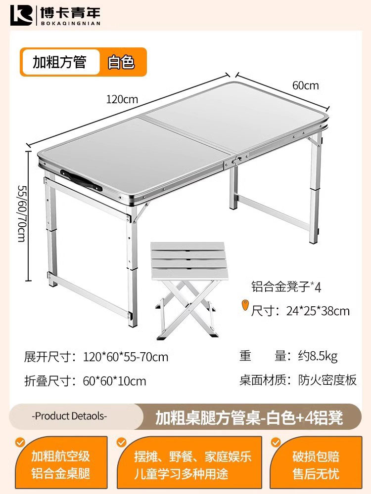 • [업그레이드 된 알루미늄 합금 사각 튜브] 120*60cm 흰색 + 알루미늄 의자 4개