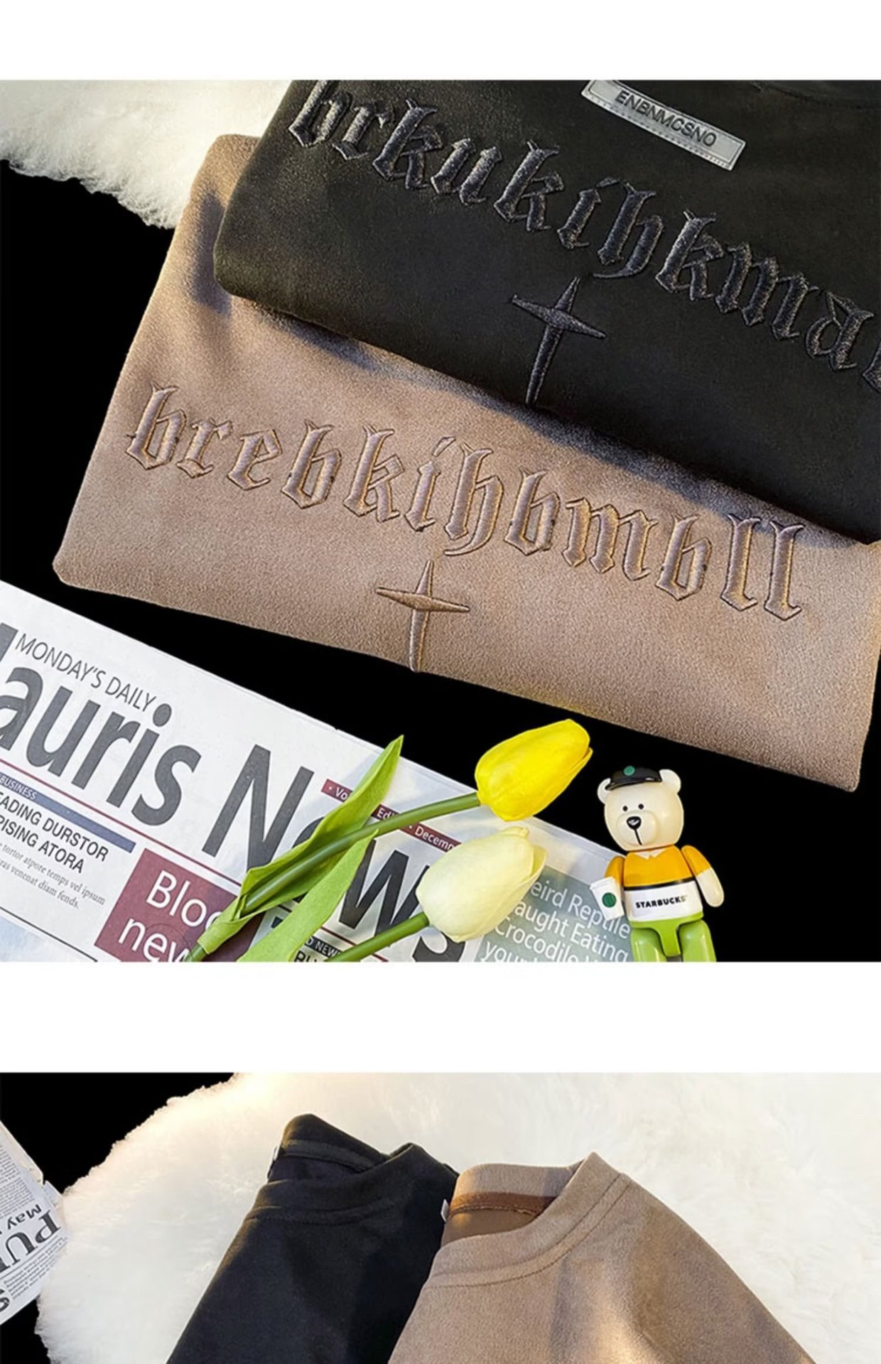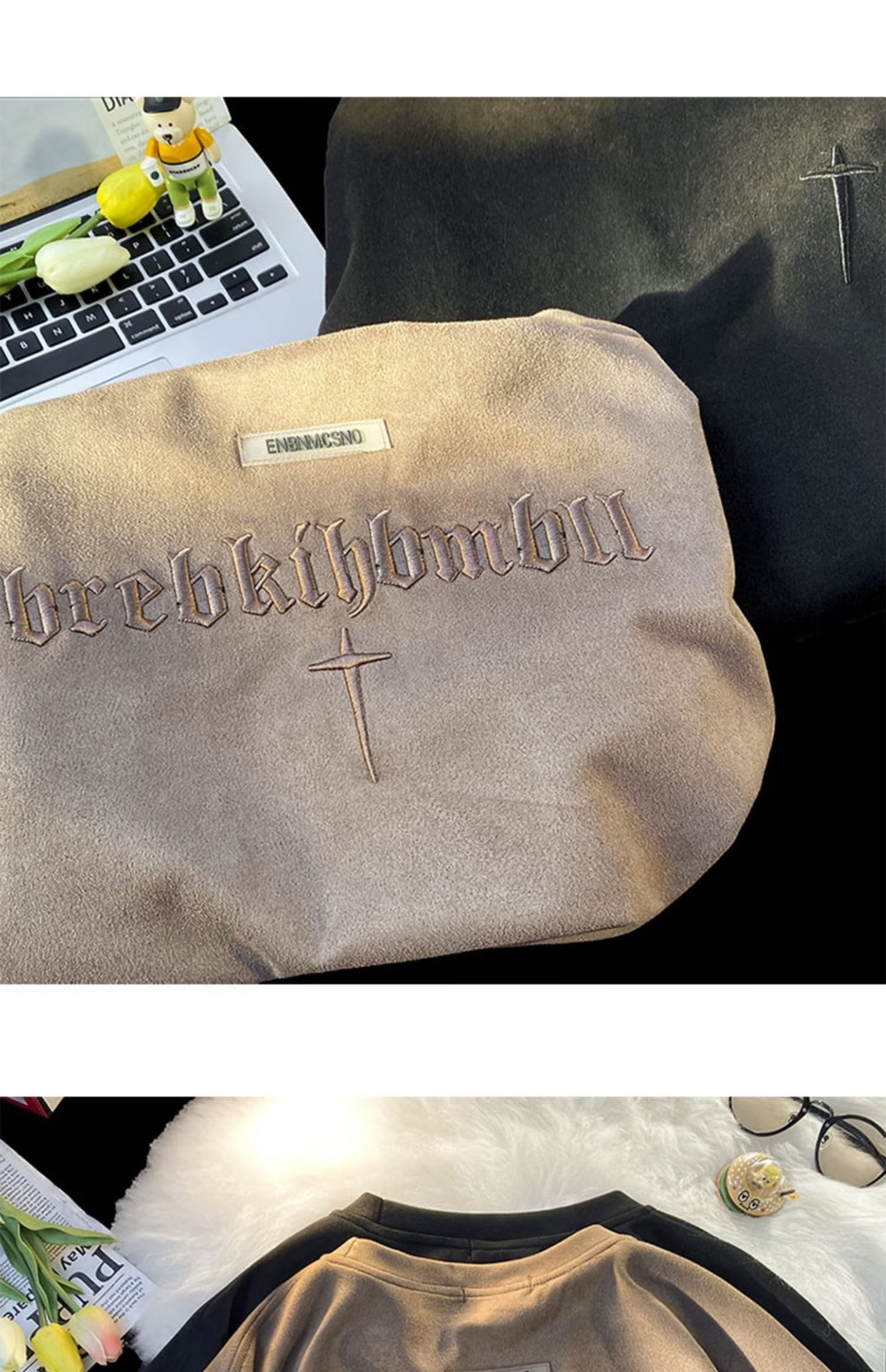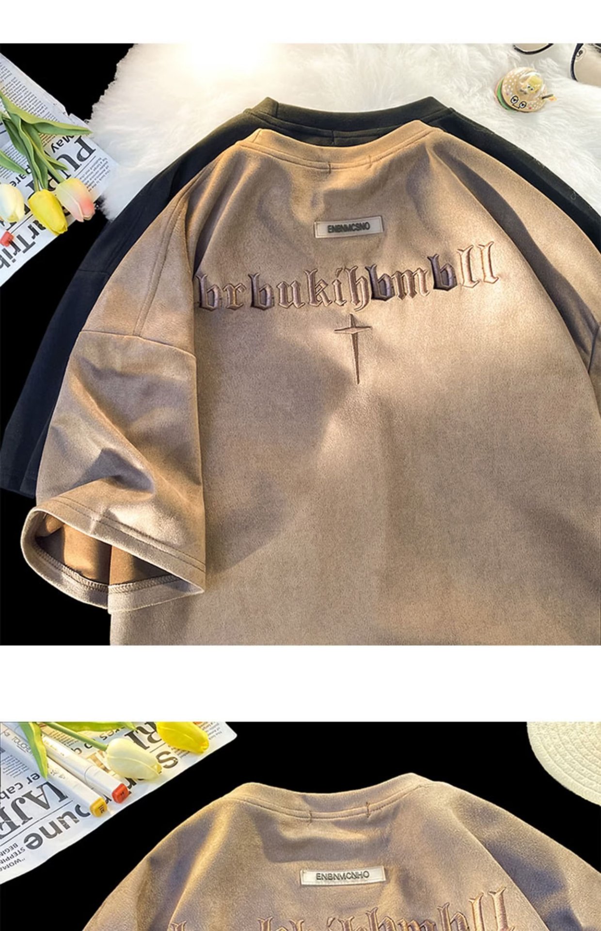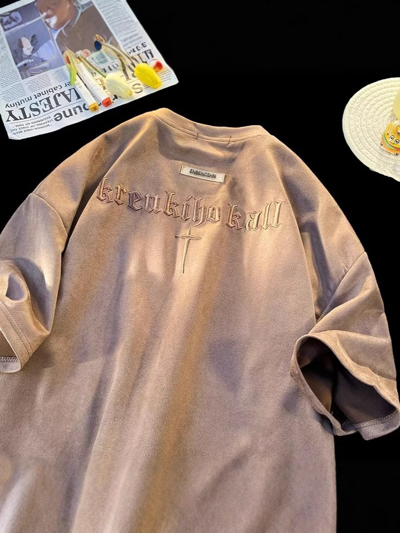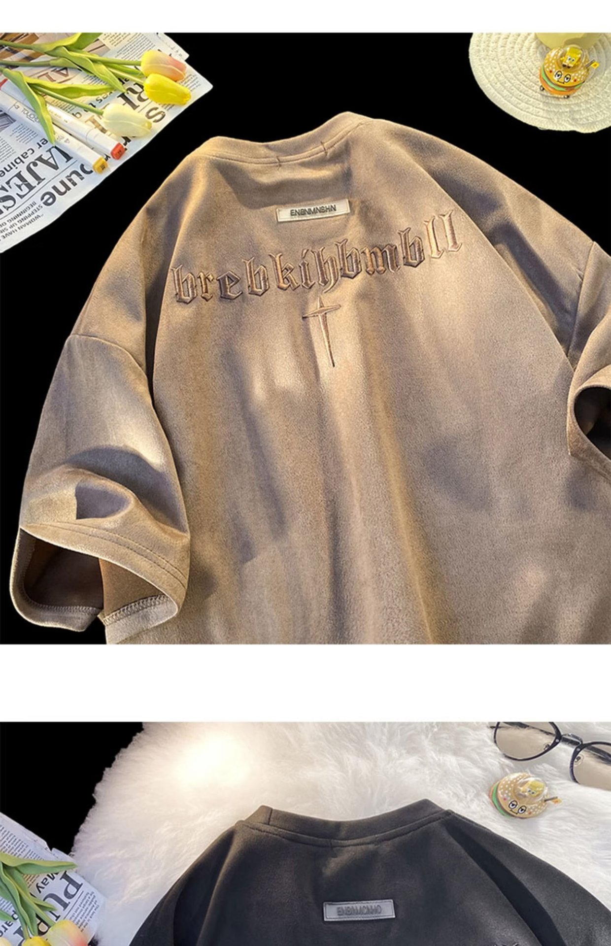 빈티지 트렌디 브랜드 레트로 레터 자수 스웨이드 반팔 티셔츠 남성용 아메리칸 힙합 루즈 반팔 티셔츠