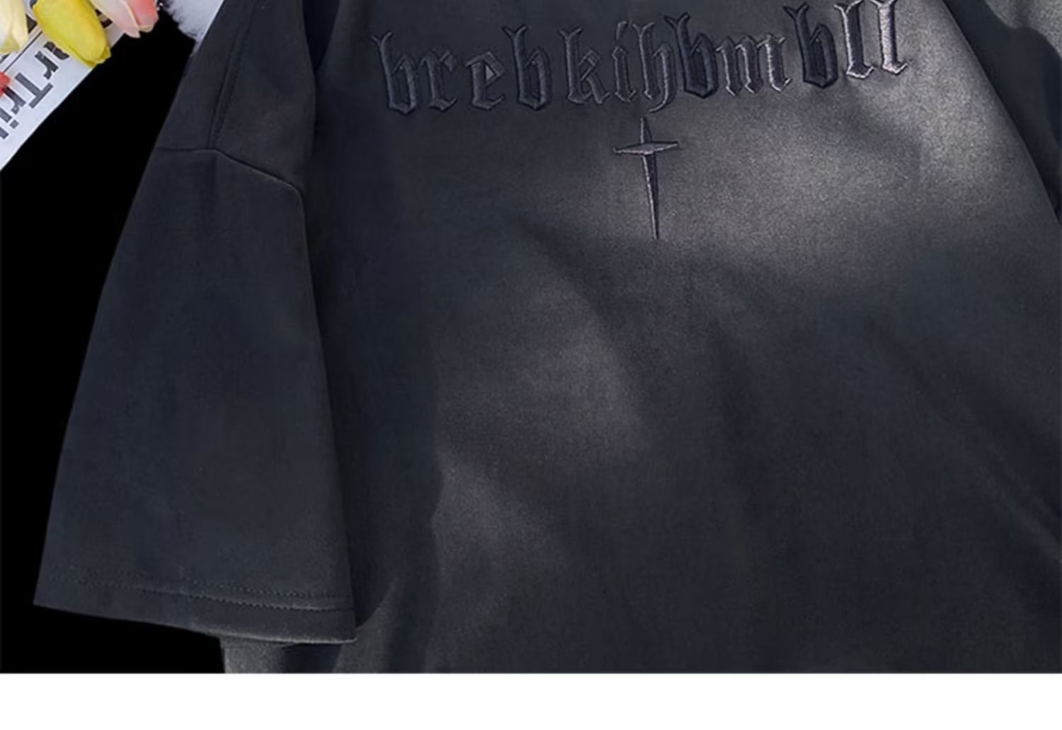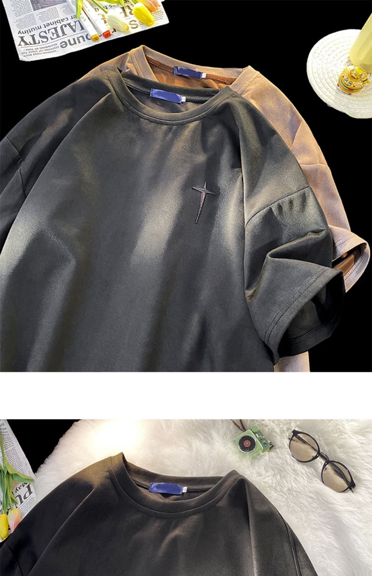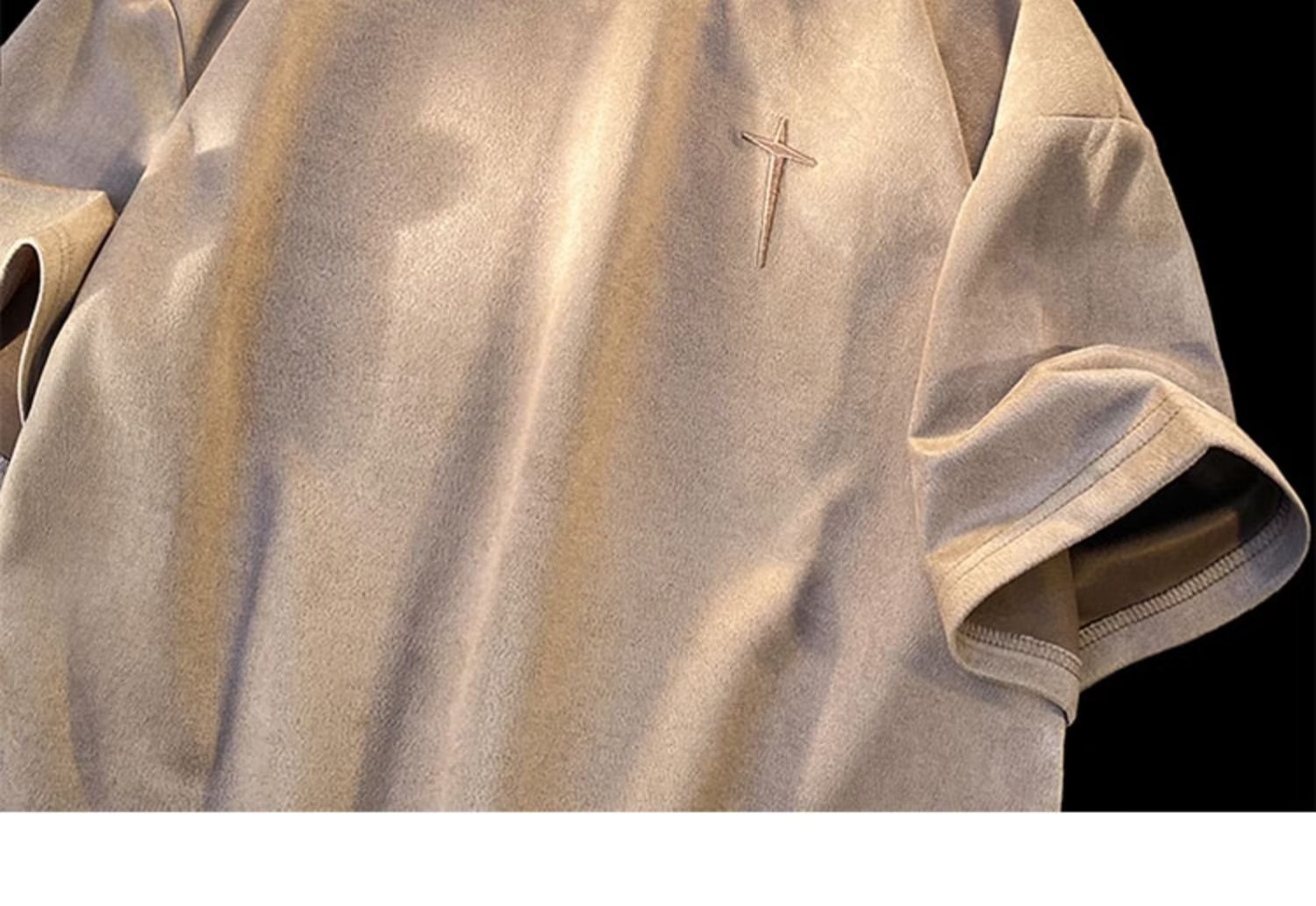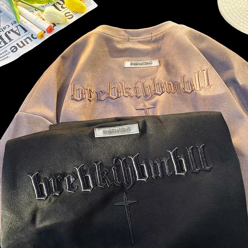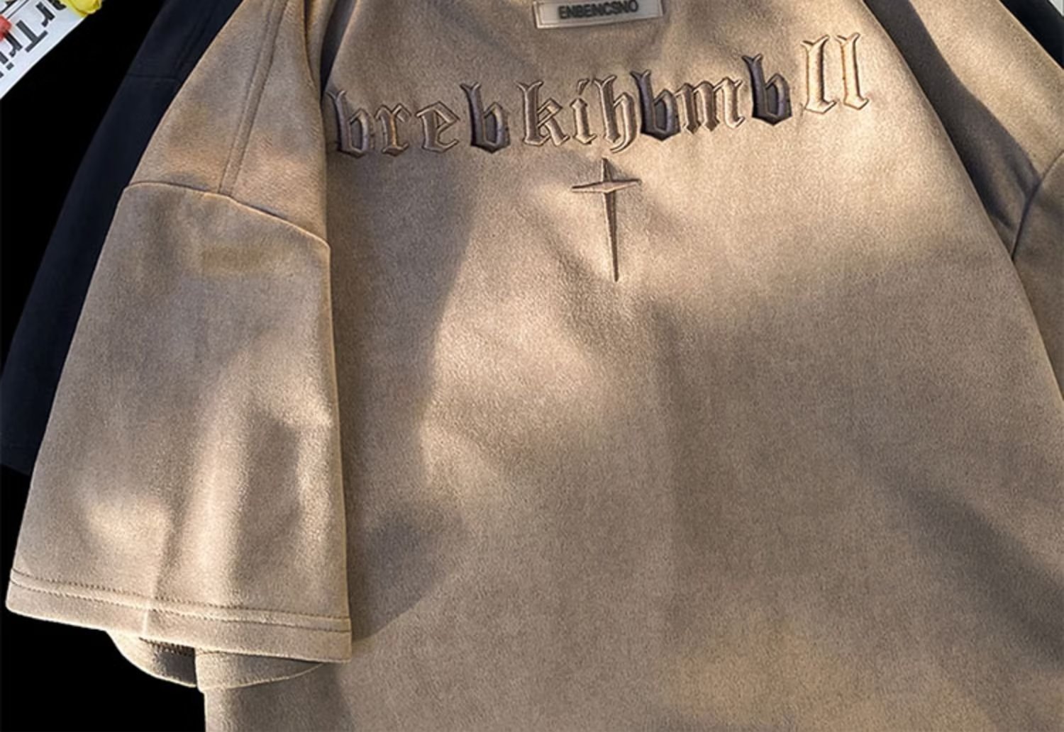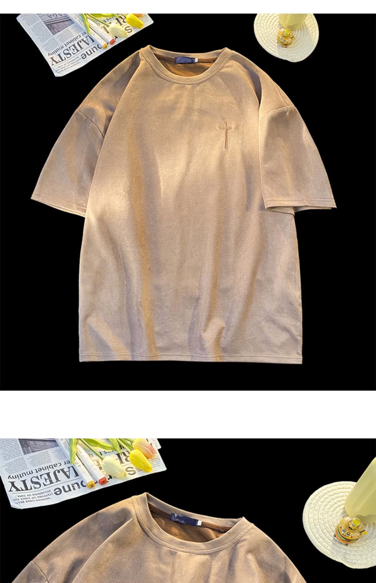 빈티지 트렌디 브랜드 레트로 레터 자수 스웨이드 반팔 티셔츠 남성용 아메리칸 힙합 루즈 반팔 티셔츠