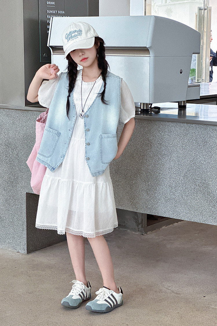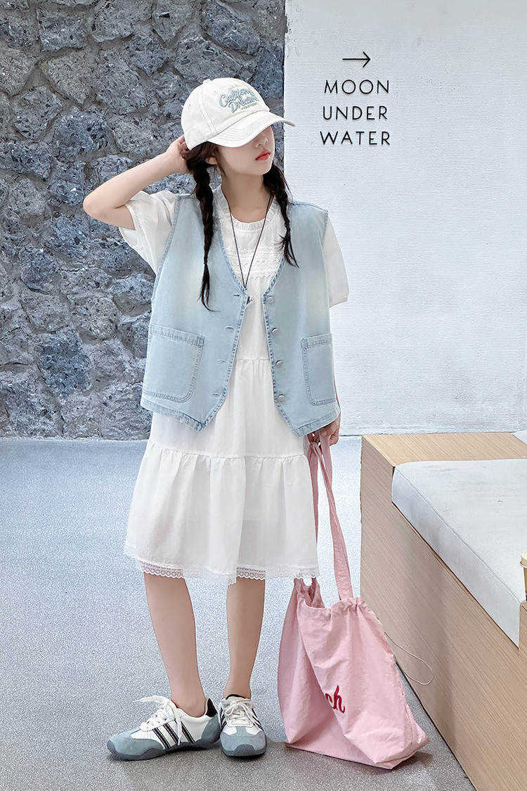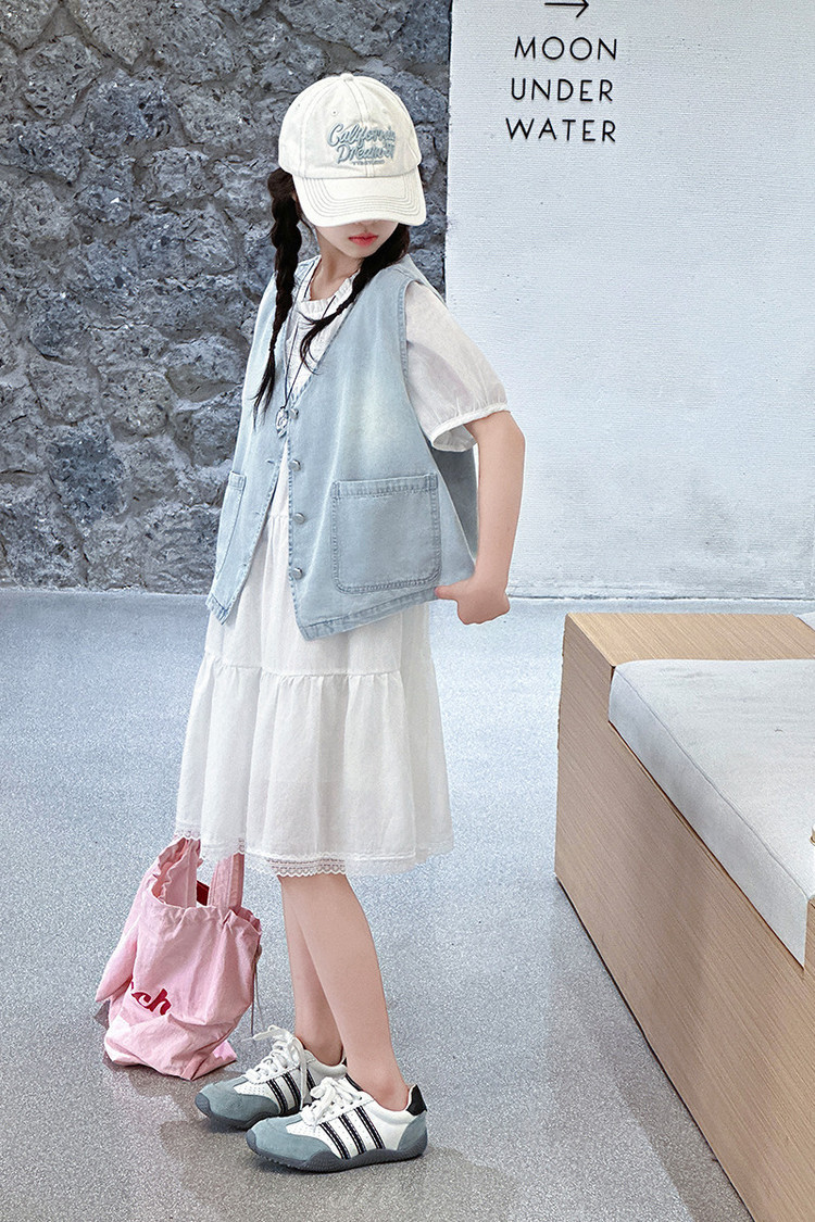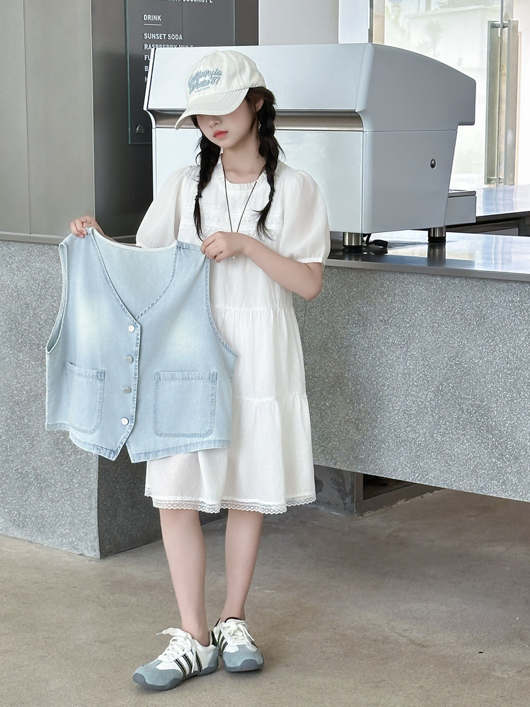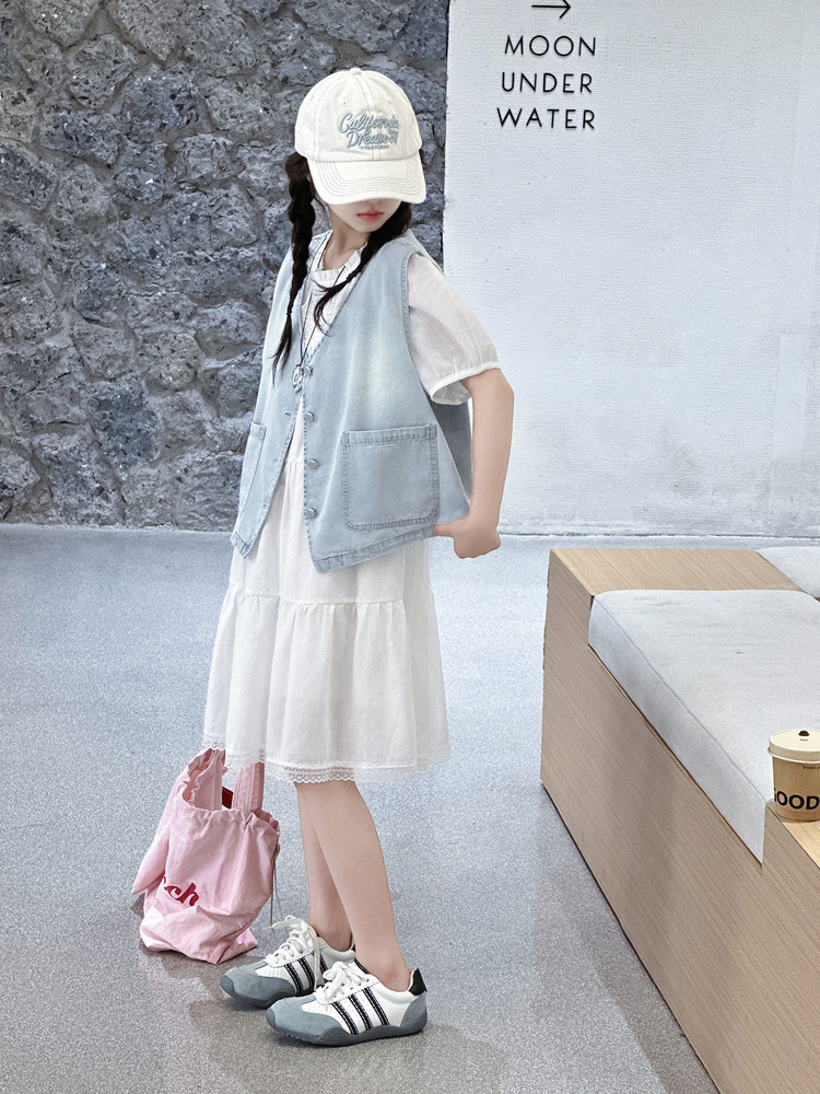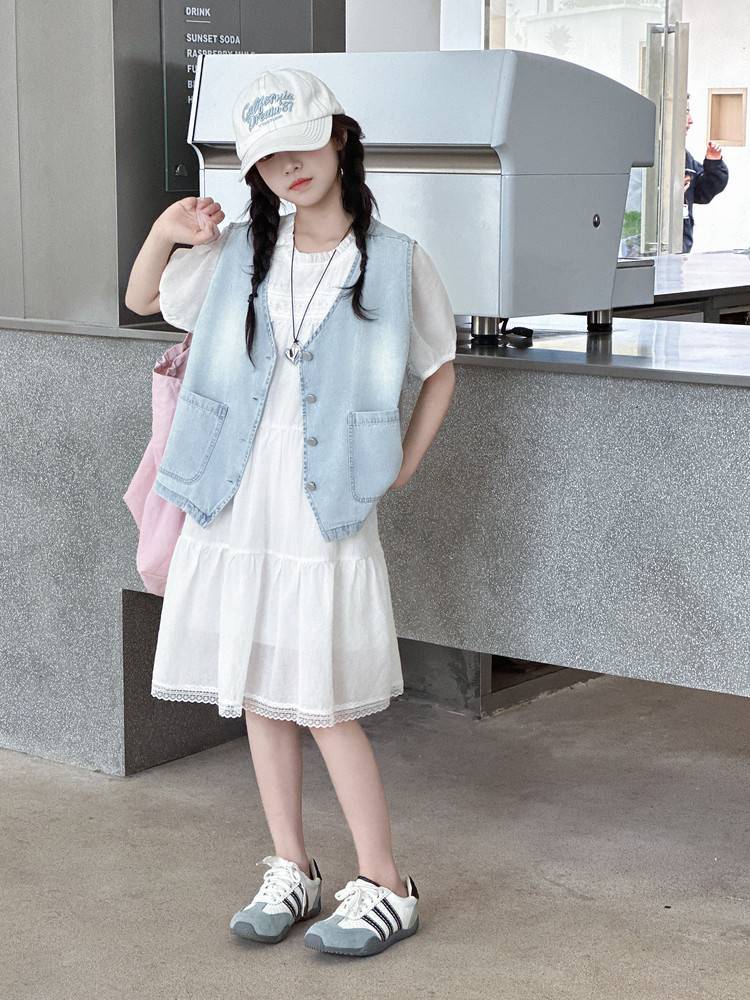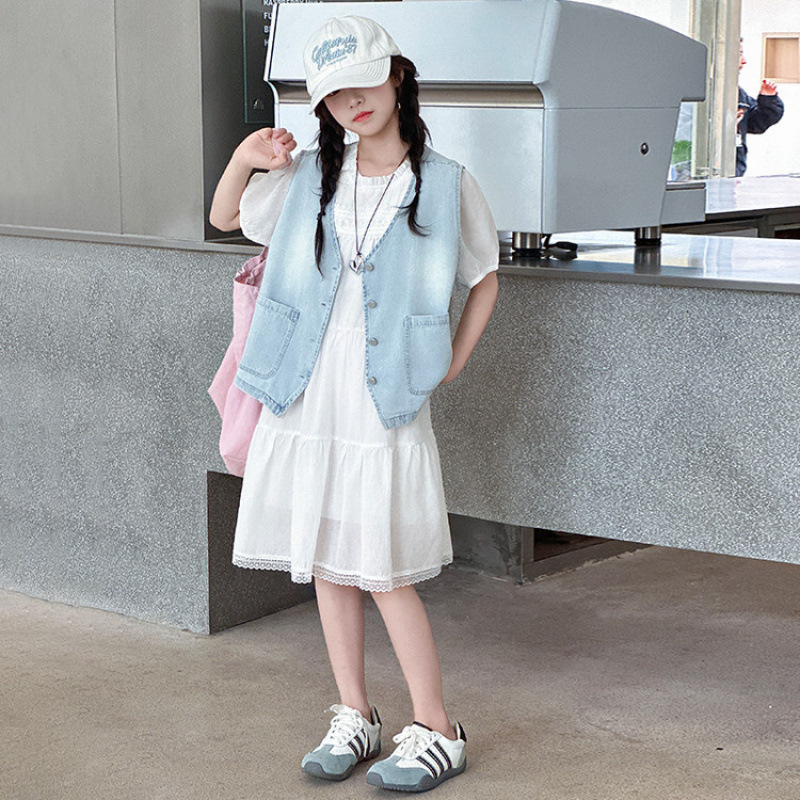 여자 드레스 여름 2025 새로운 스타일 중대형 어린이 스타일 데님 조끼 공주 드레스 여름 투피스 세트 유행스토어 가기