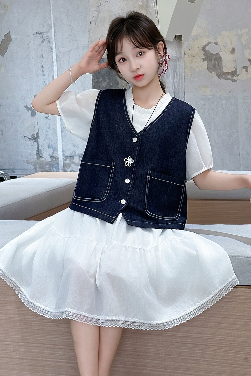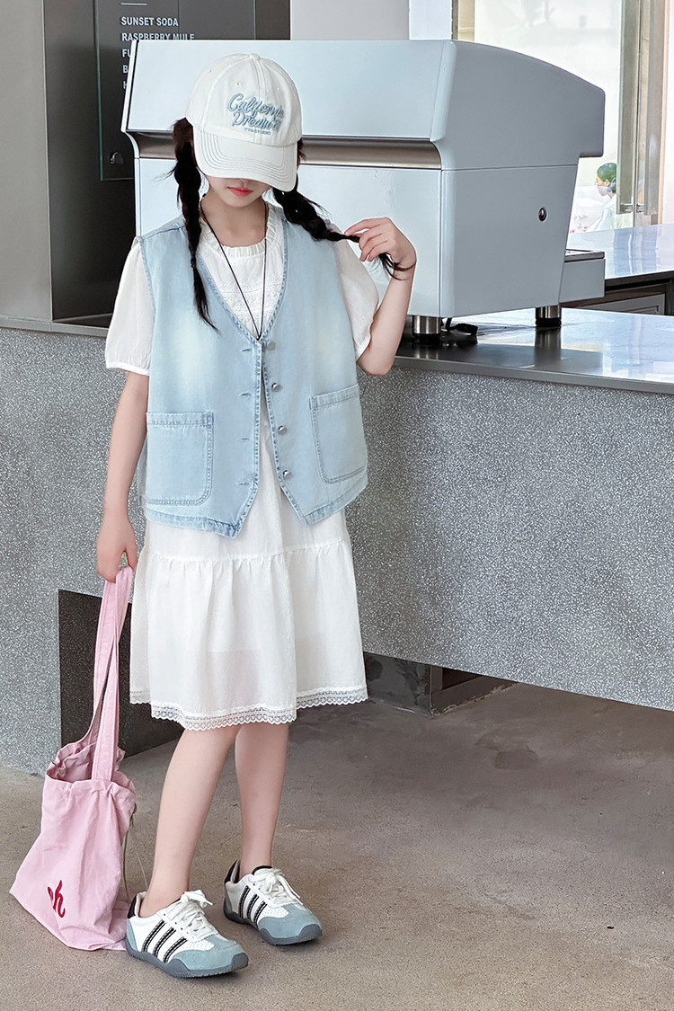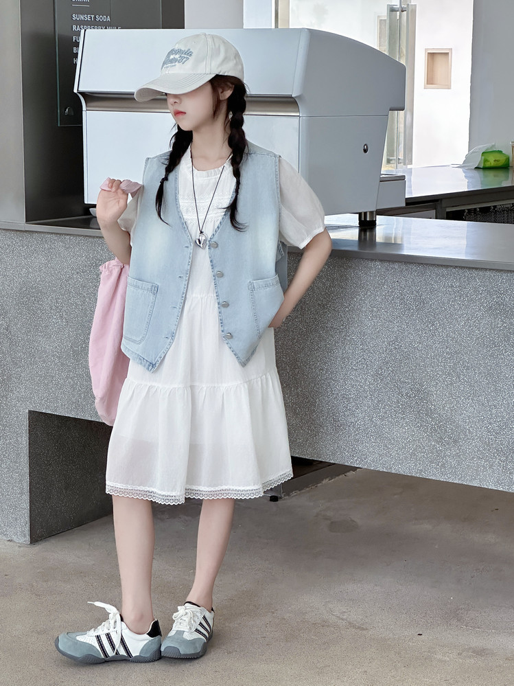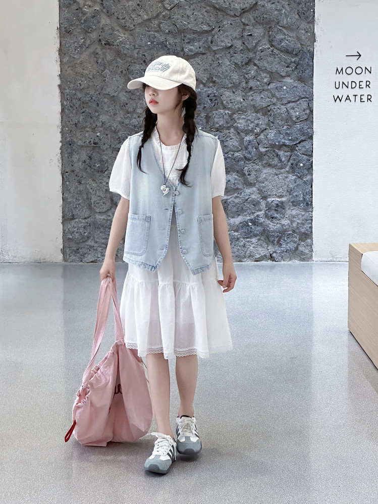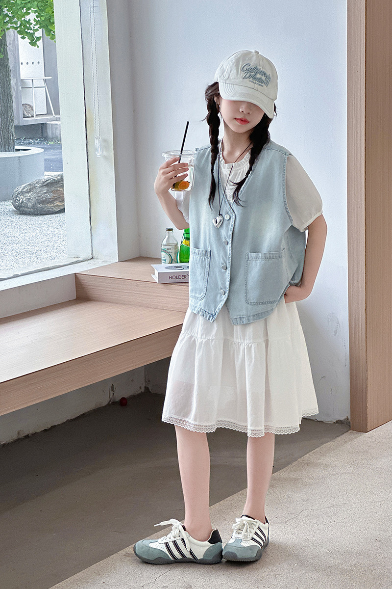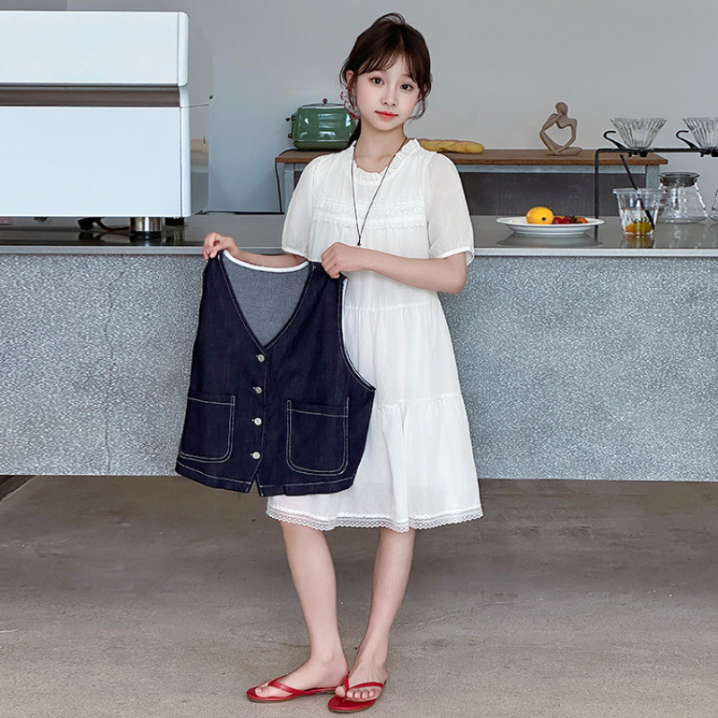 여자 드레스 여름 2025 새로운 스타일 중대형 어린이 스타일 데님 조끼 공주 드레스 여름 투피스 세트 유행스토어 가기