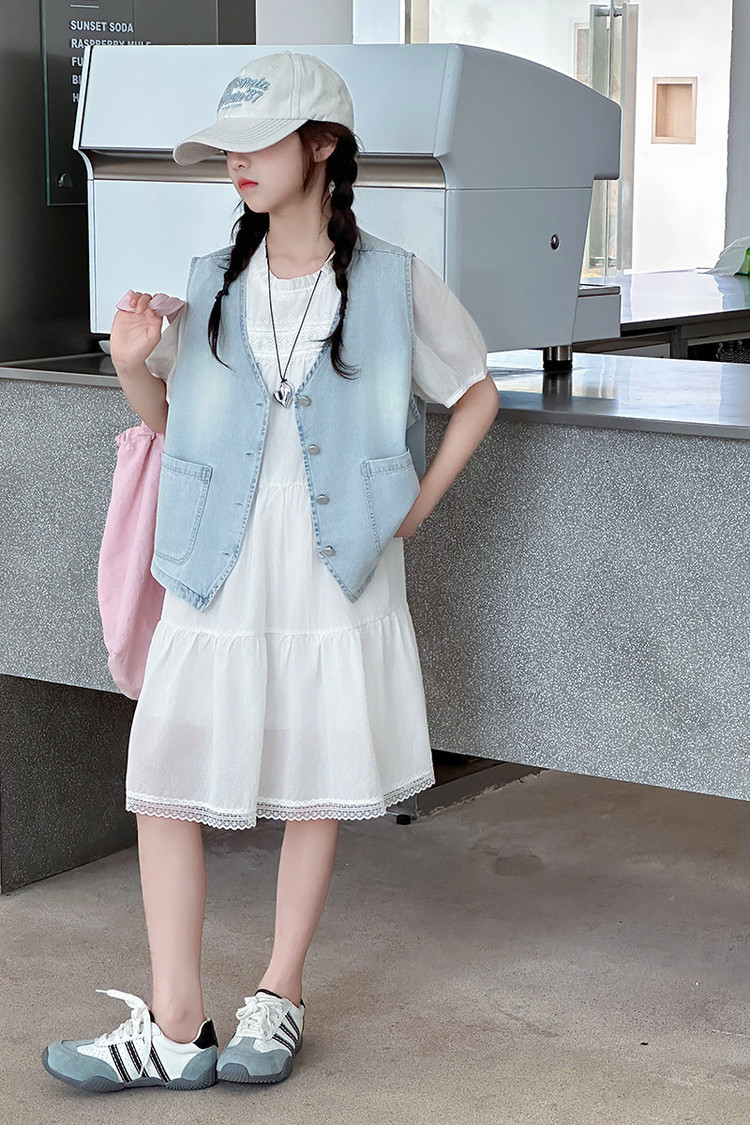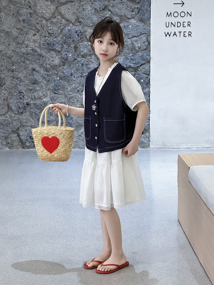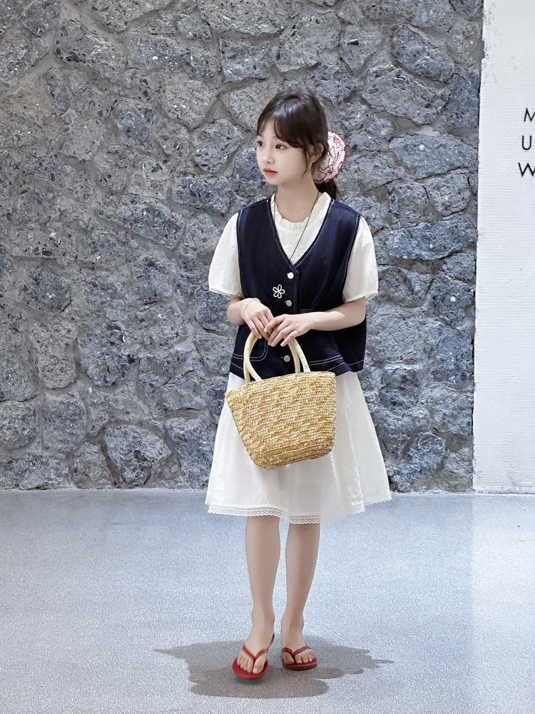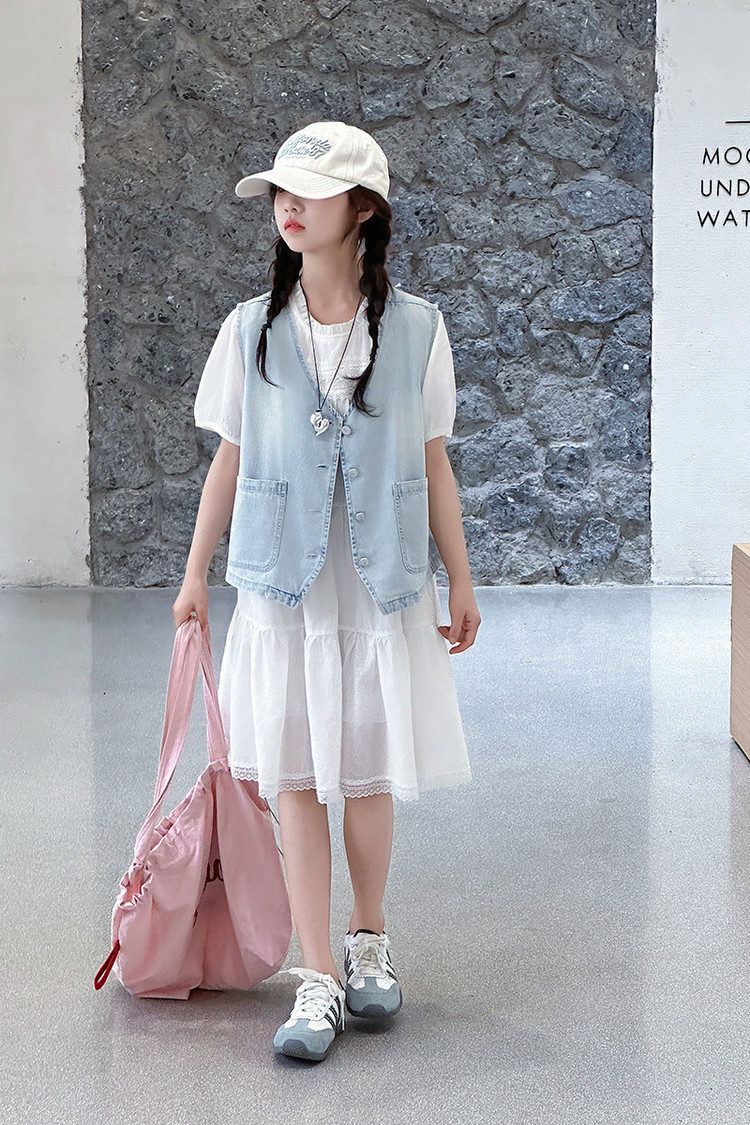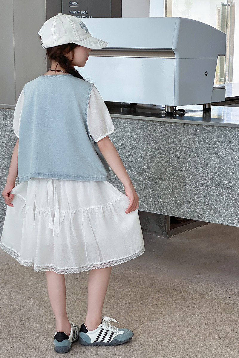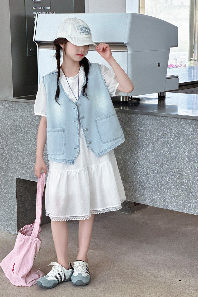 여자 드레스 여름 2025 새로운 스타일 중대형 어린이 스타일 데님 조끼 공주 드레스 여름 투피스 세트 유행스토어 가기