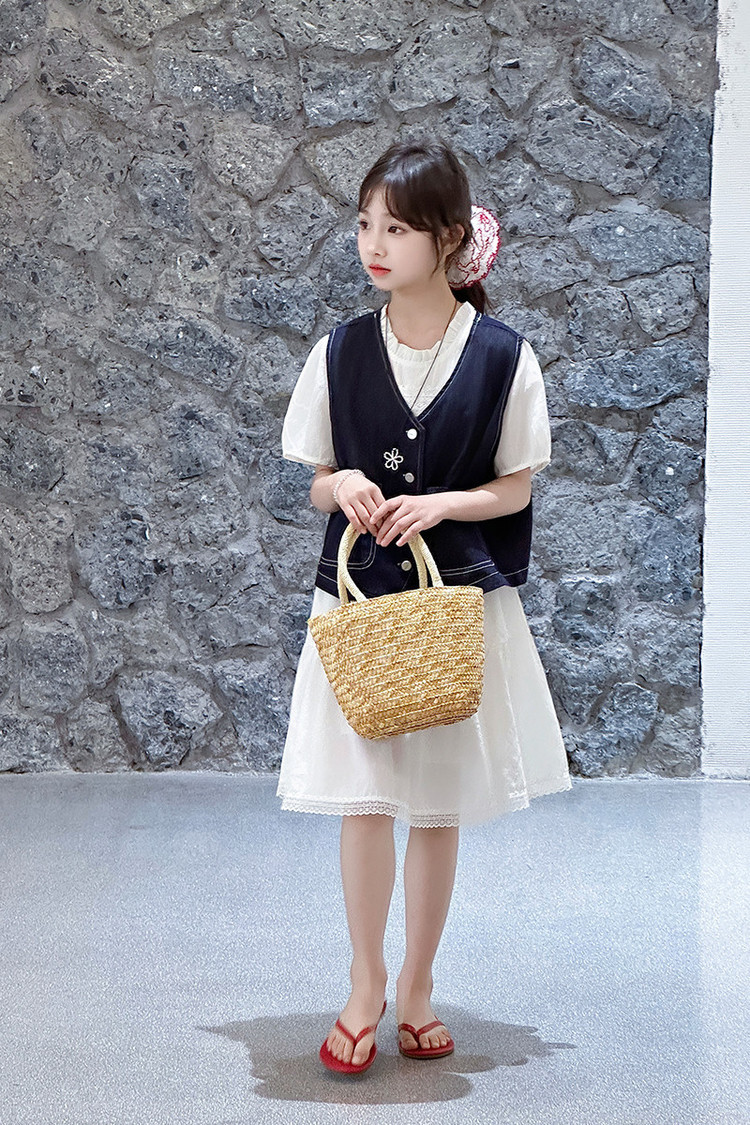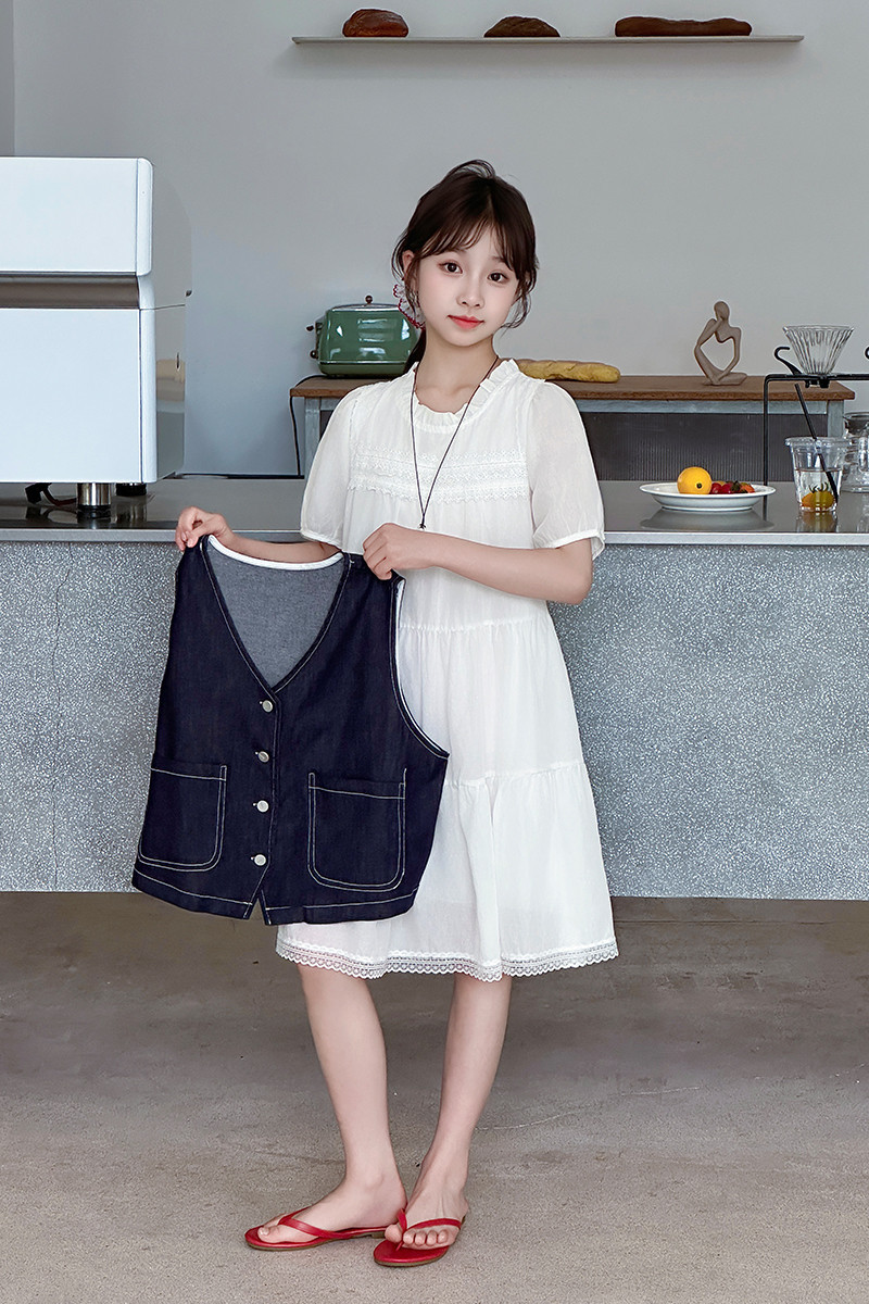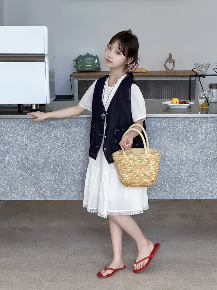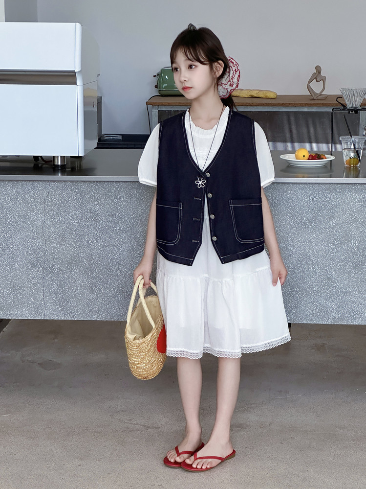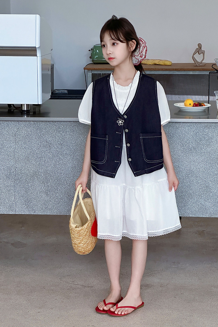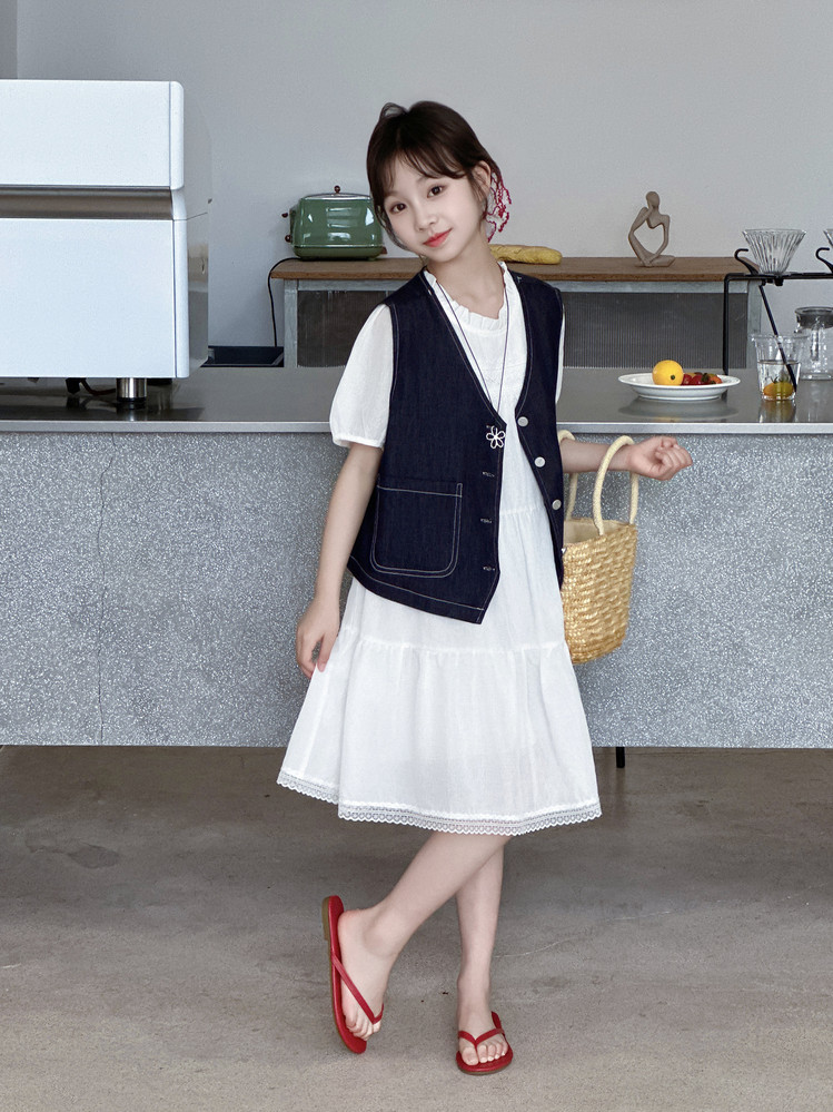 여자 드레스 여름 2025 새로운 스타일 중대형 어린이 스타일 데님 조끼 공주 드레스 여름 투피스 세트 유행스토어 가기