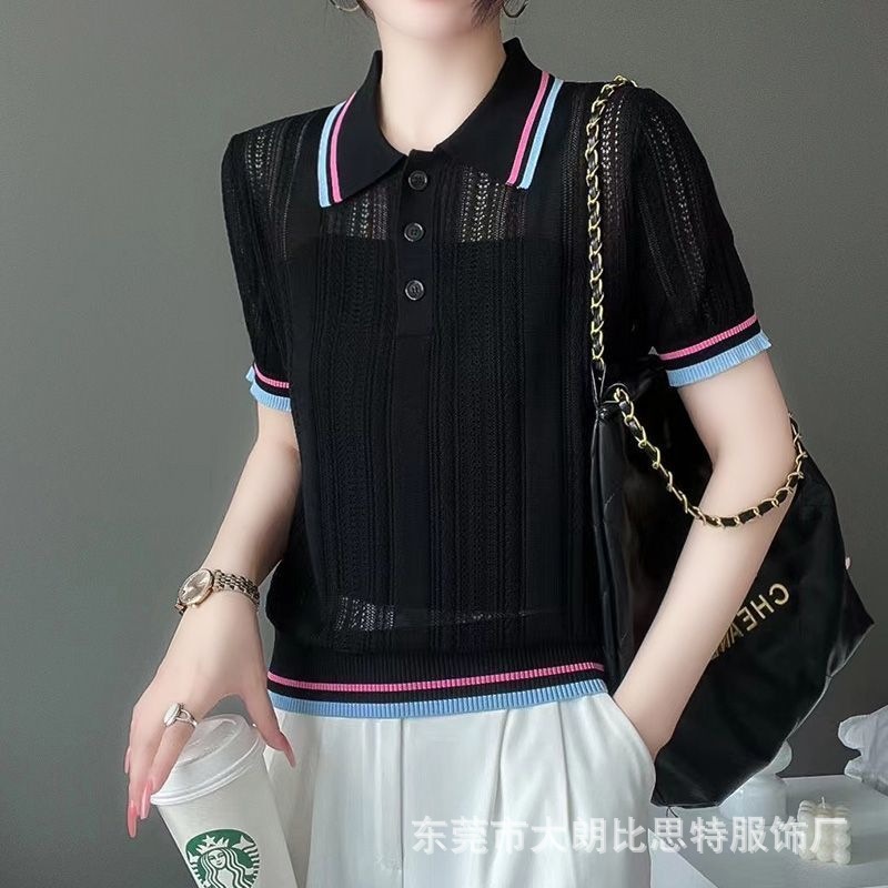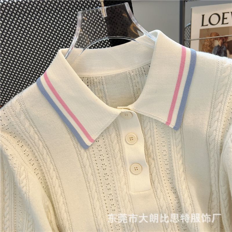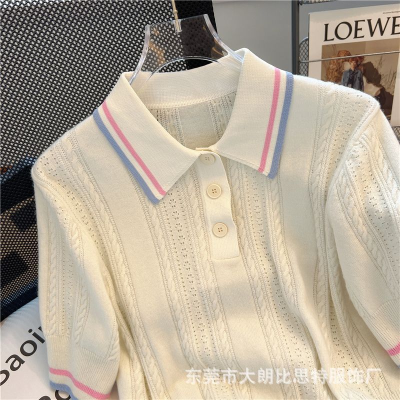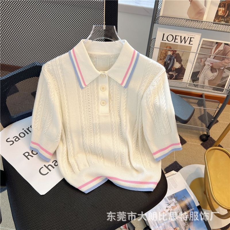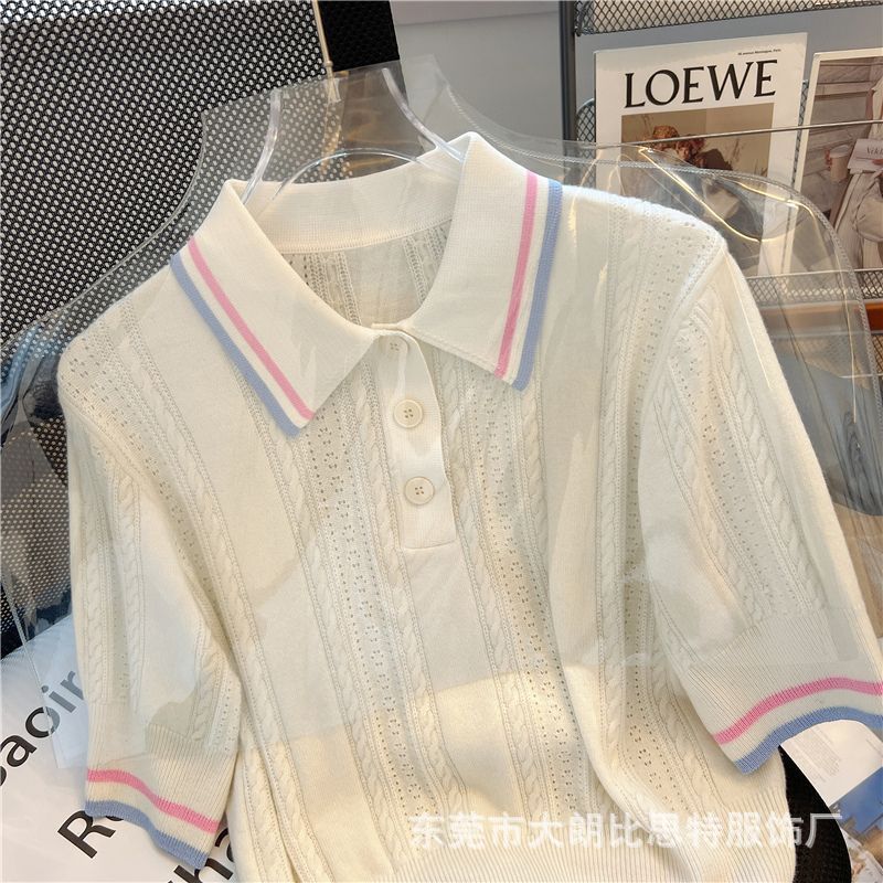 2025 새로운 여름 한국 스타일 달콤한 대학 스타일 폴로 칼라 대비 스트라이프 디자인 반팔 스웨터 탑