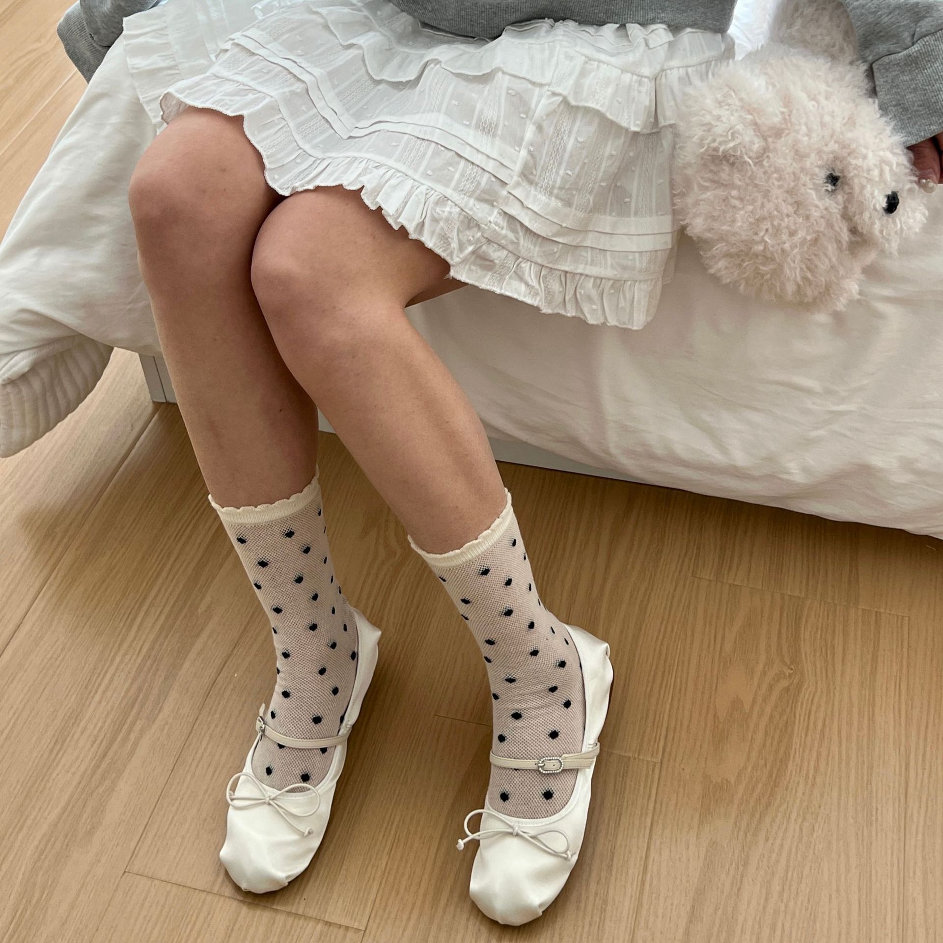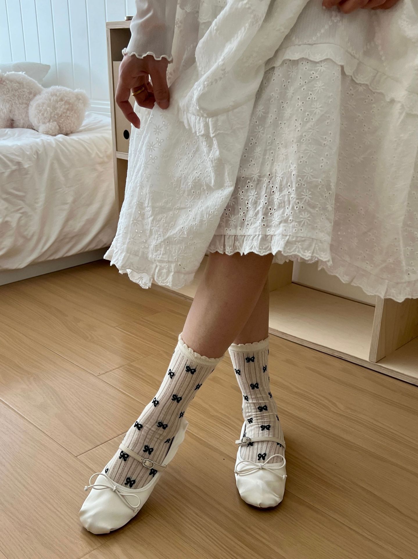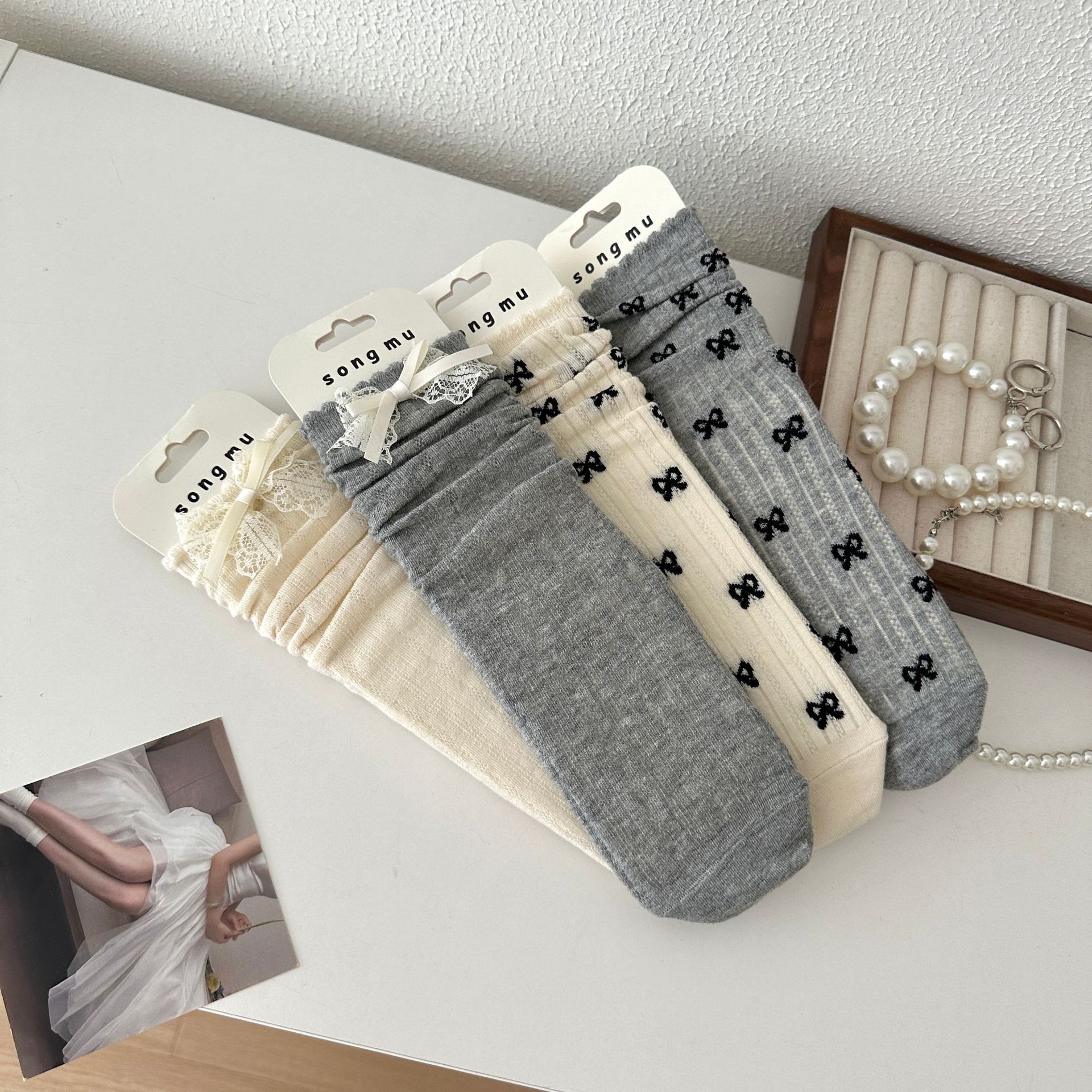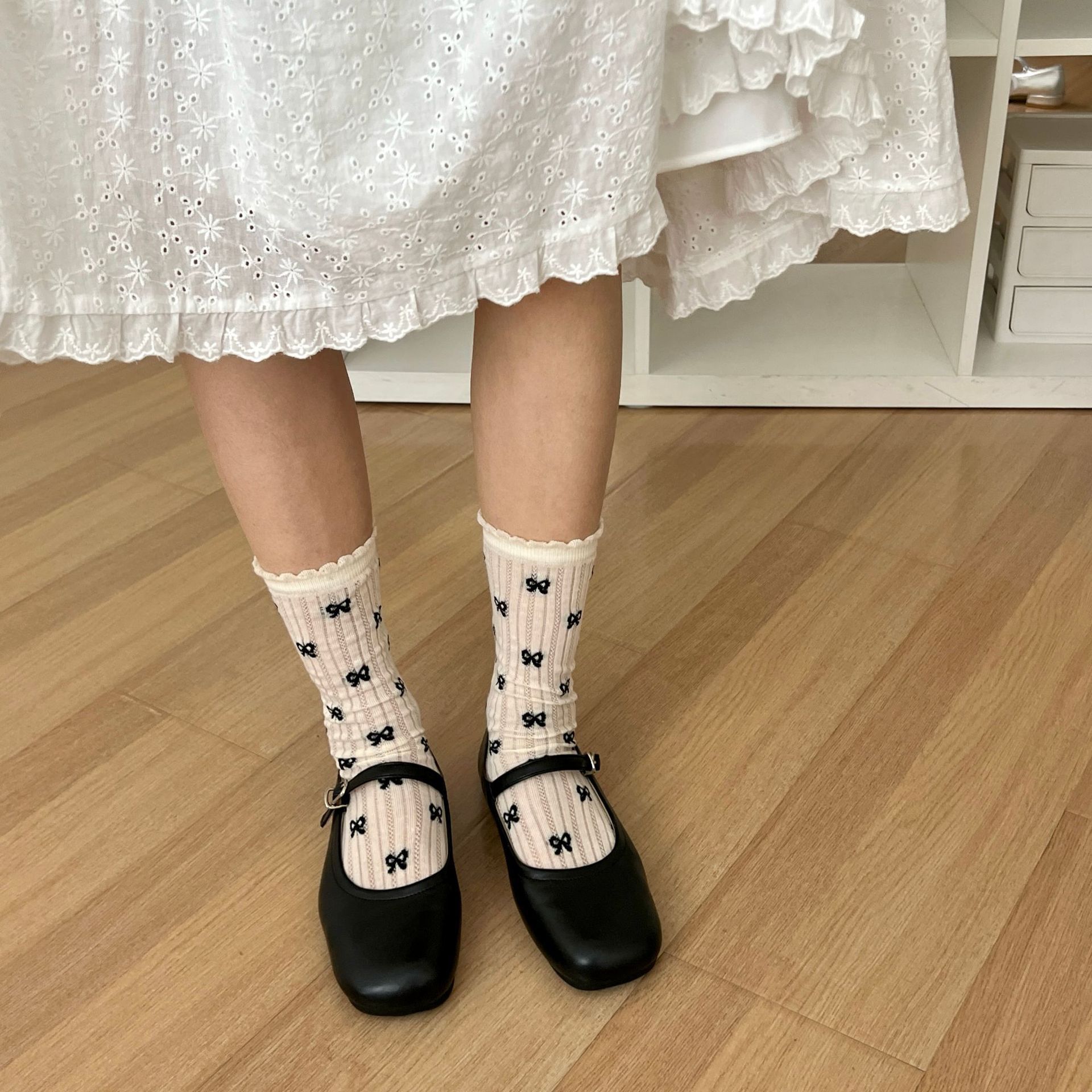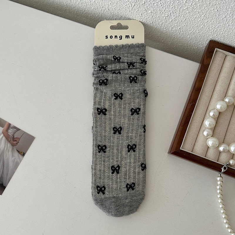 메쉬 보우 양말 여성용 종아리 중간 양말 여름 얇은 면 한국식 일본식 통기성 발레 스타일 여름 스타킹스토어 가기