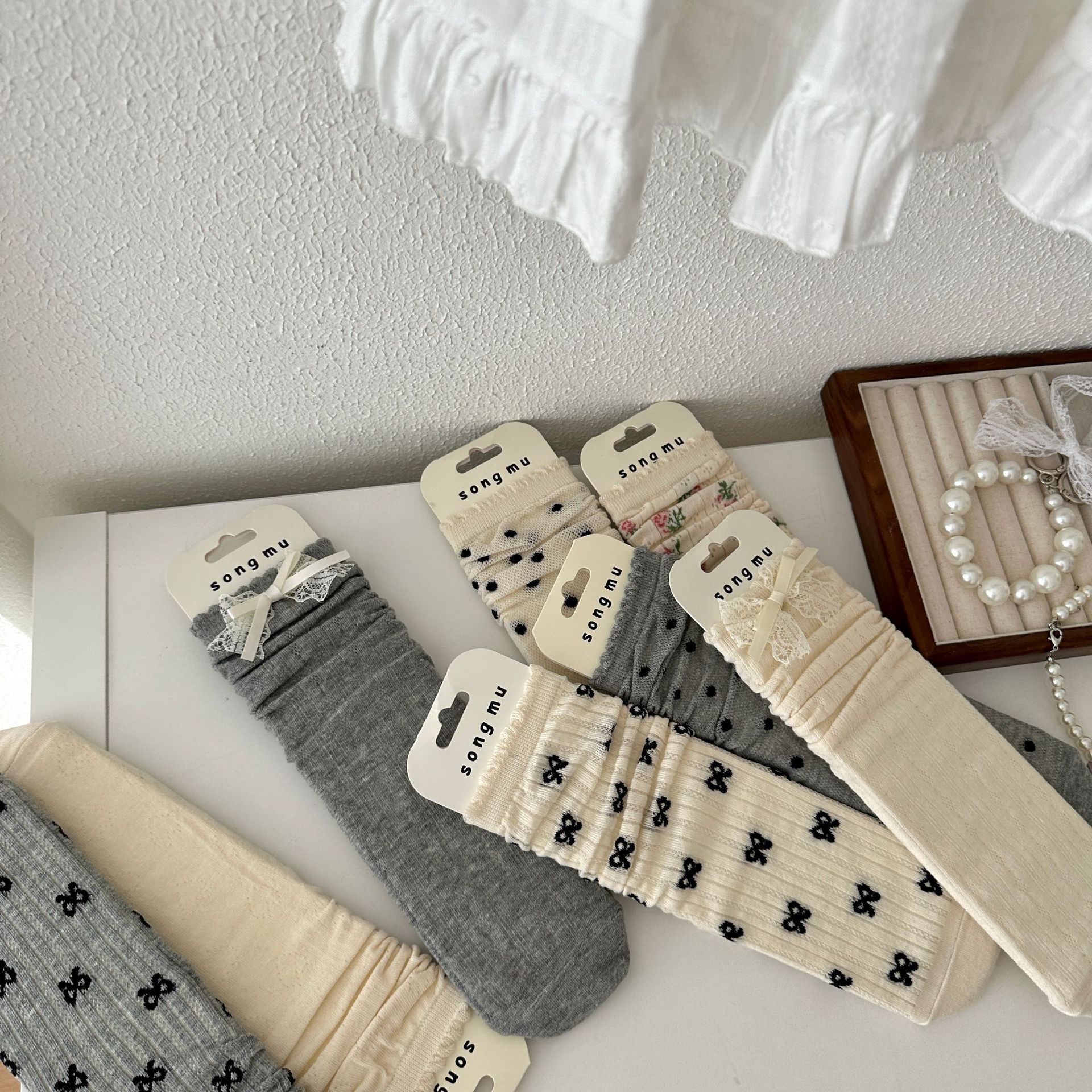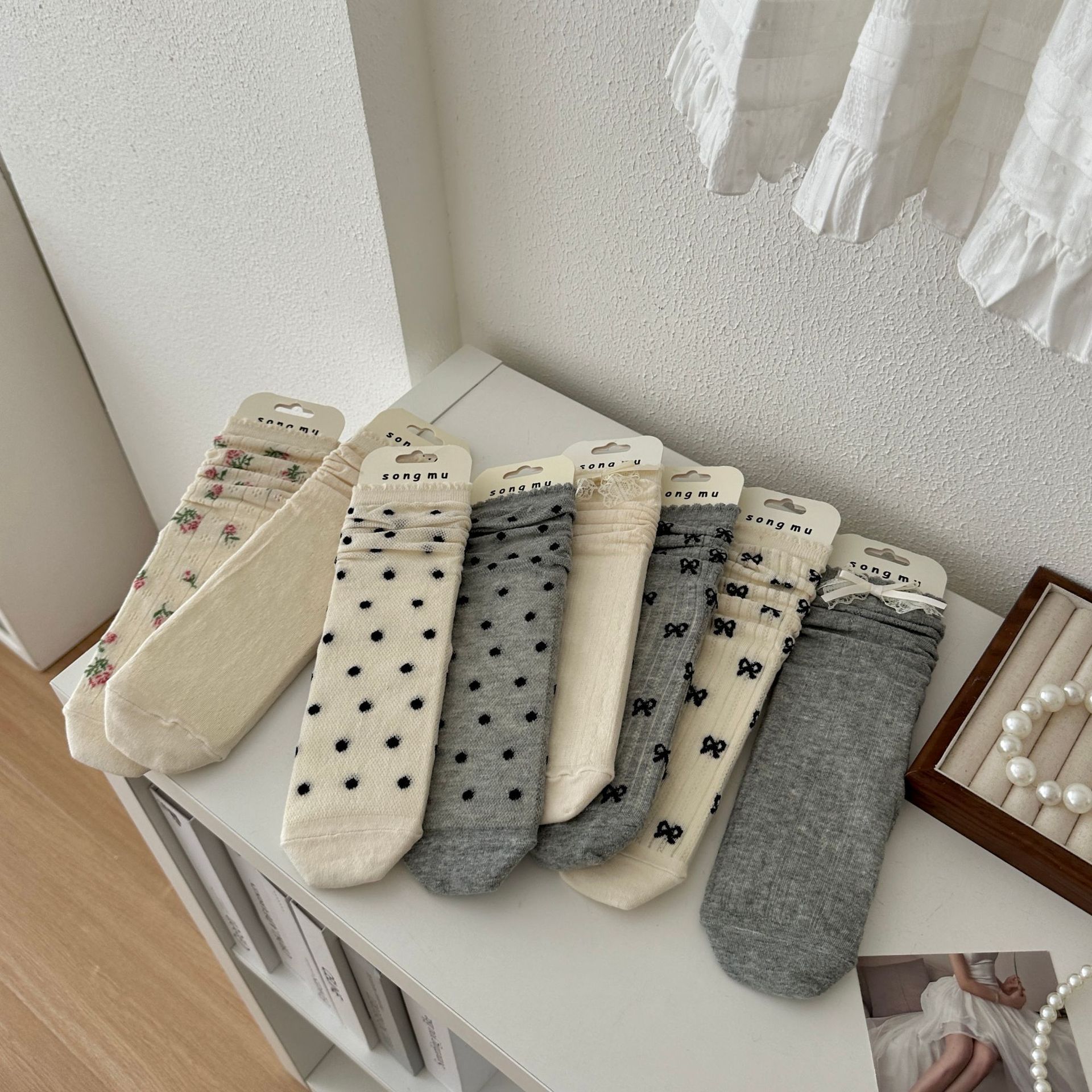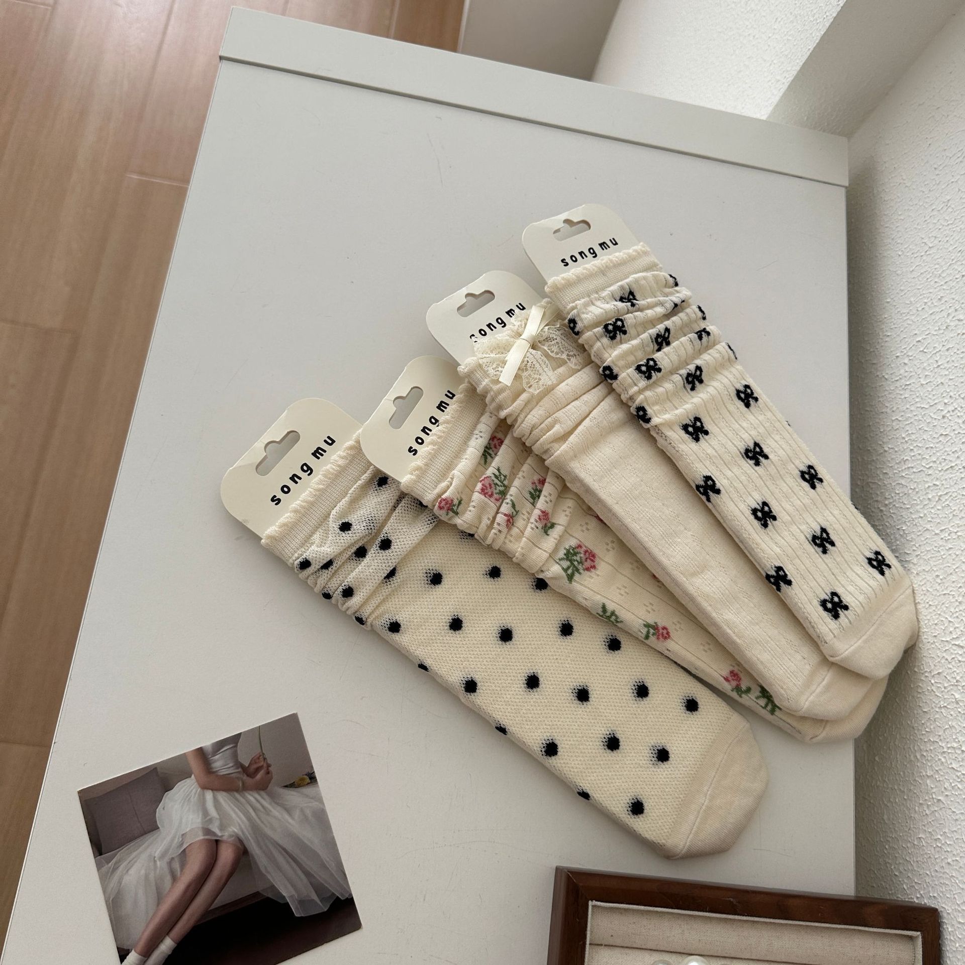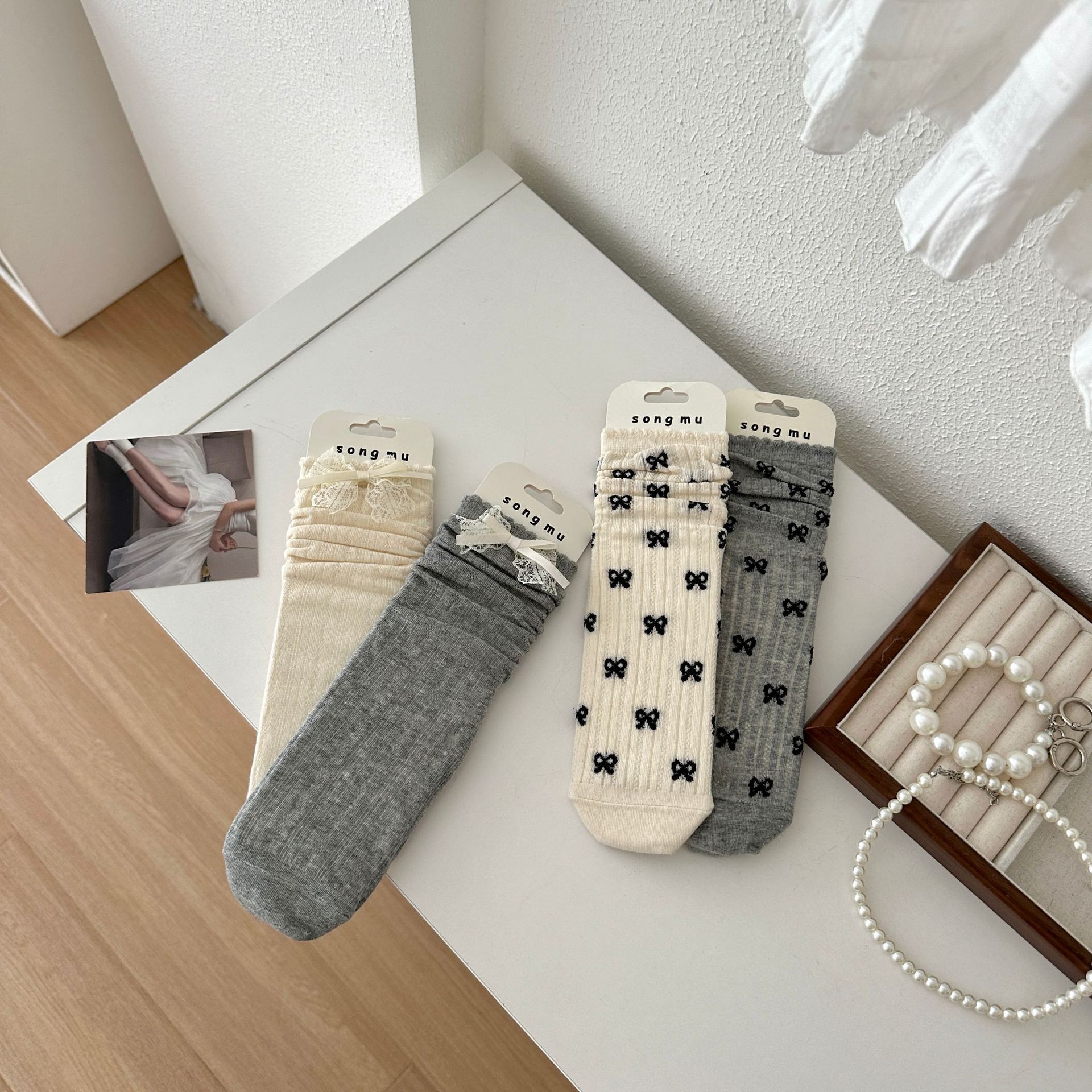 메쉬 보우 양말 여성용 종아리 중간 양말 여름 얇은 면 한국식 일본식 통기성 발레 스타일 여름 스타킹스토어 가기
