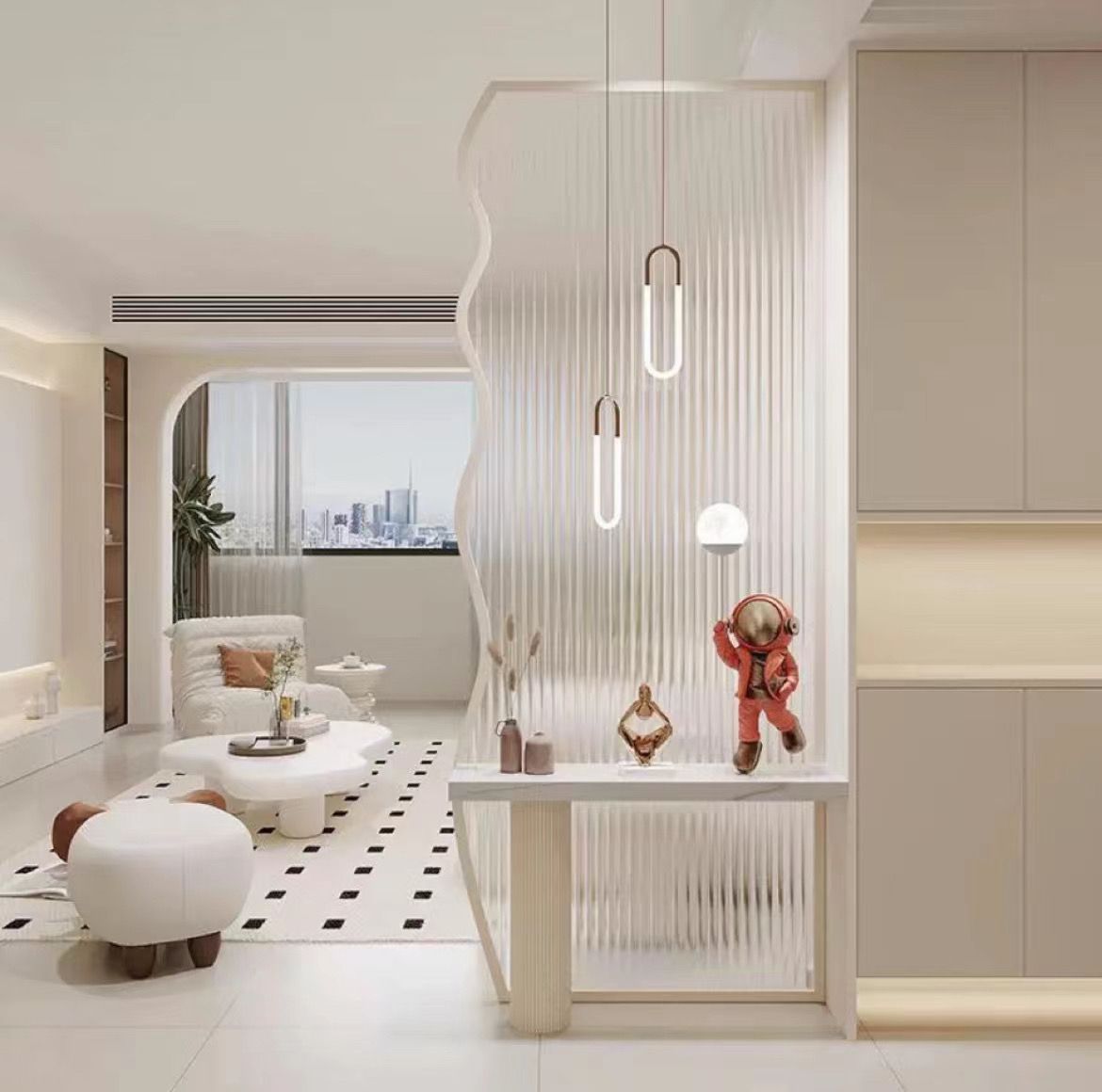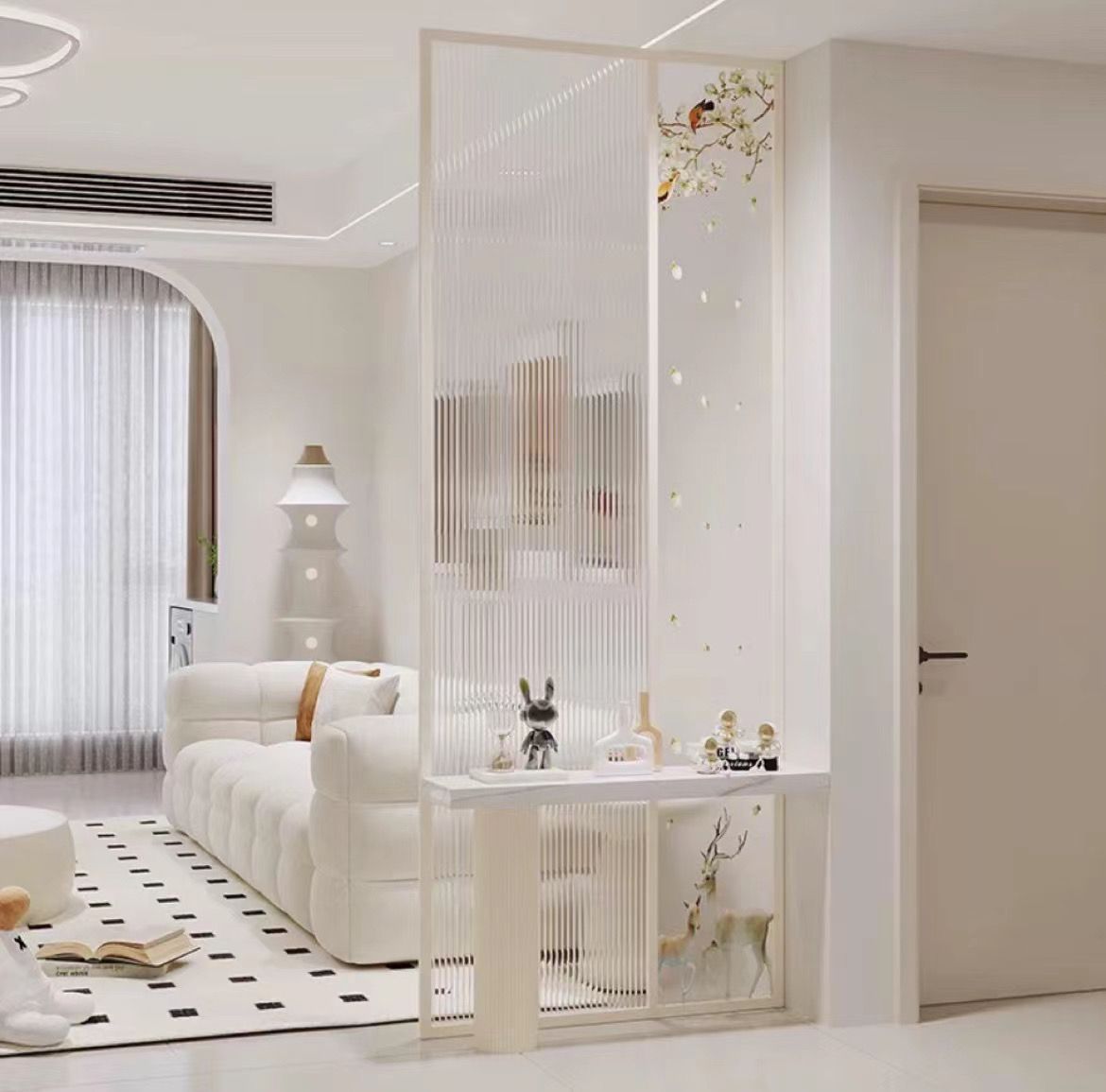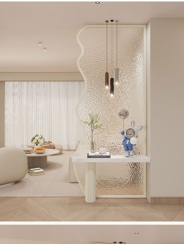 창의적인 크림 스타일의 물결 모양의 스크린 파티션, 현관에 직면한 거실, 현관에 직면한 세면대, 현관 보관 스크린