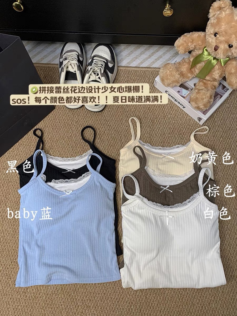여성용 가슴 패드가 있는 여름 투피스 레이스 캐미솔, 여성용 스위트 퓨어 디자이어 아우터웨어 및 이너웨어 쇼트탑스토어 가기