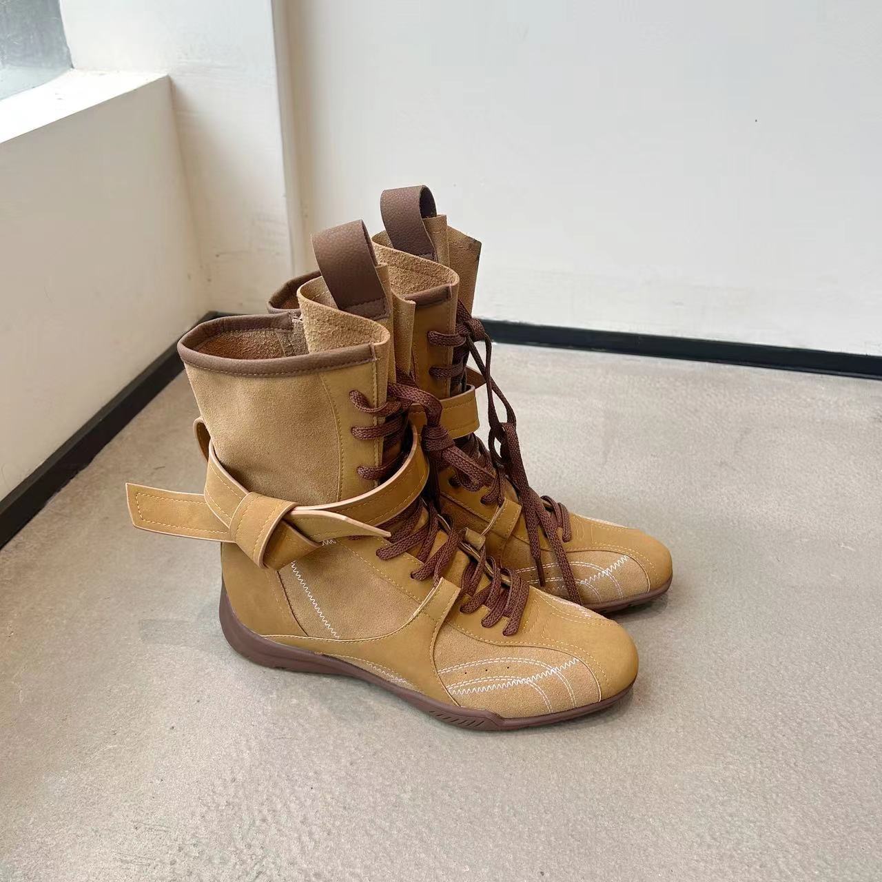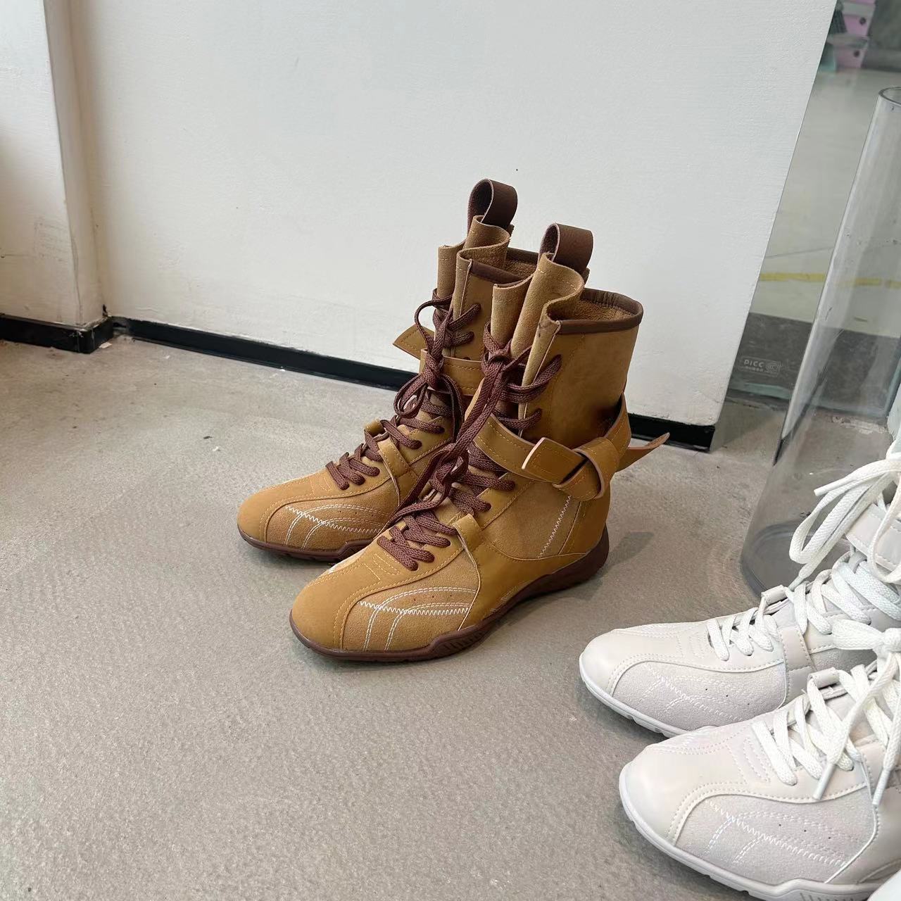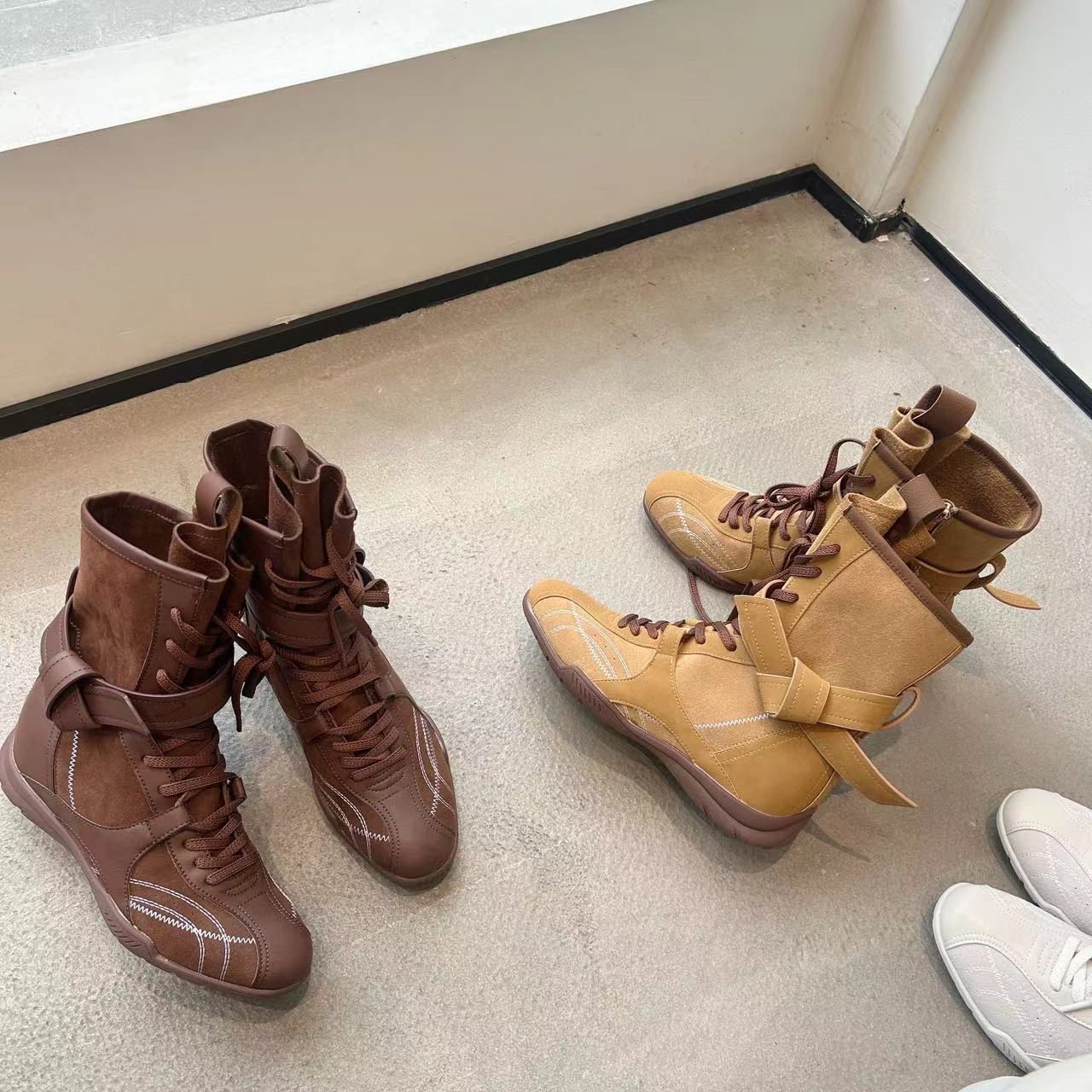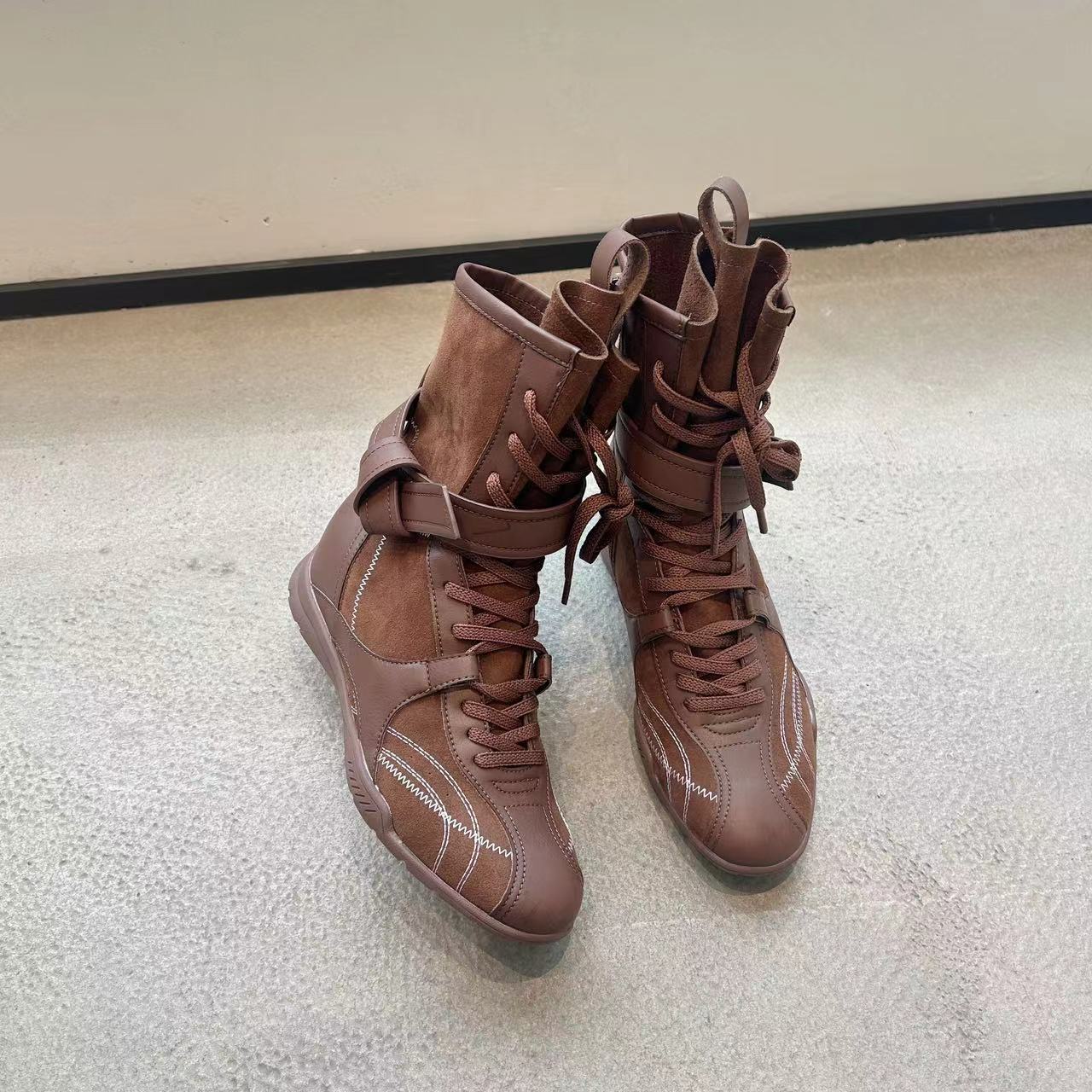 2025 봄 레트로 내부 강화 마틴 부츠 여성용 브라운 복싱 부츠 누벅 가죽 라운드 발가락 레이스 업 스포츠 부츠 짧은 부츠