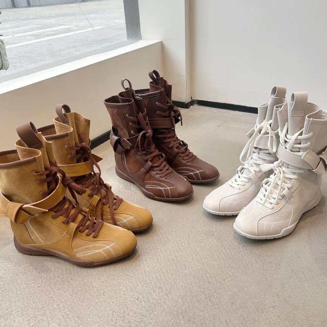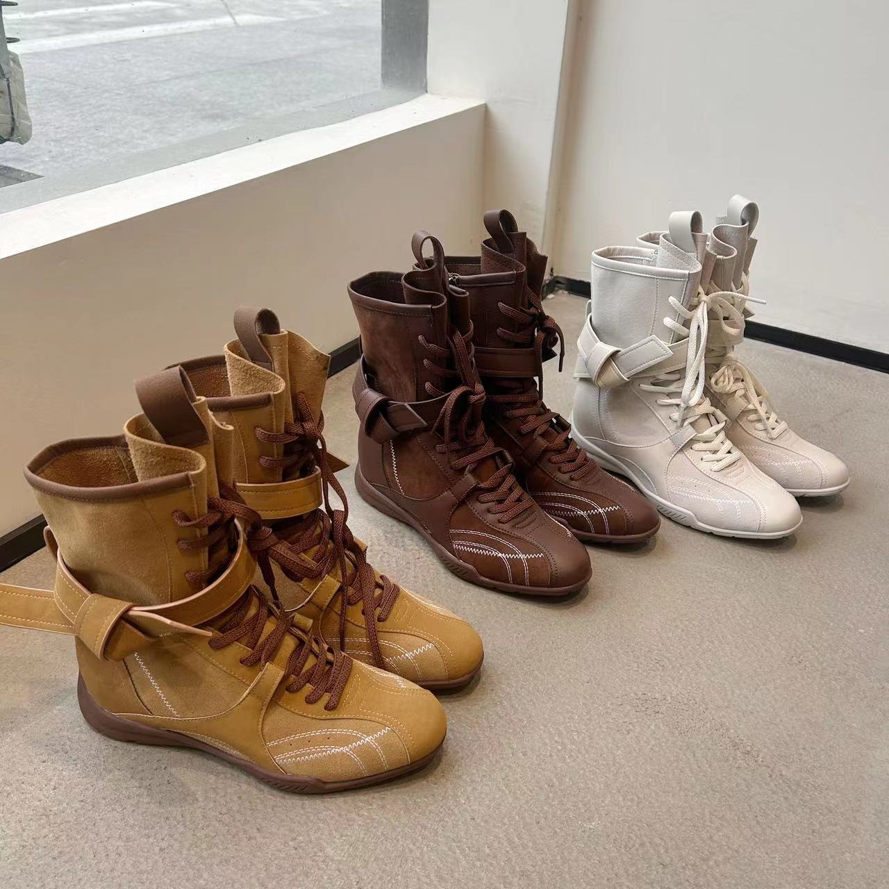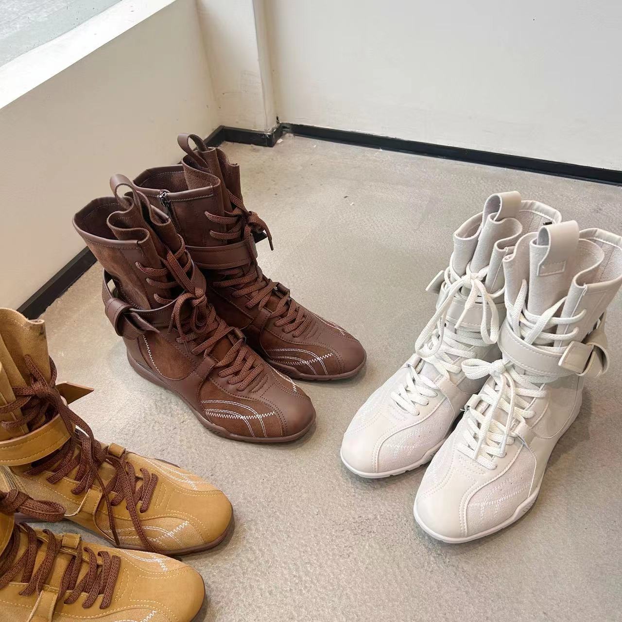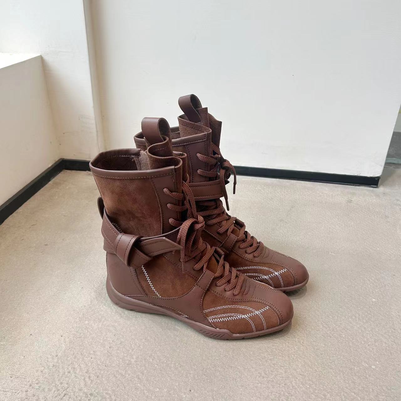 2025 봄 레트로 내부 강화 마틴 부츠 여성용 브라운 복싱 부츠 누벅 가죽 라운드 발가락 레이스 업 스포츠 부츠 짧은 부츠