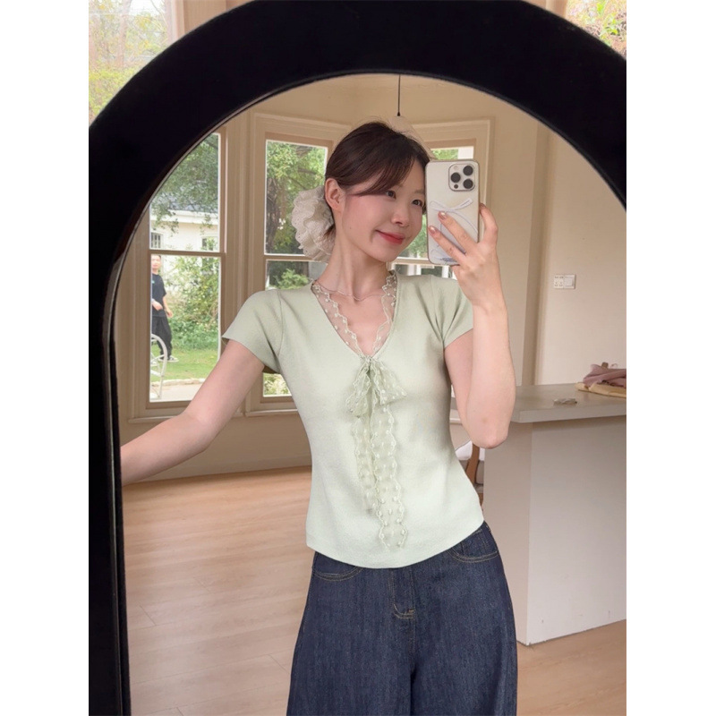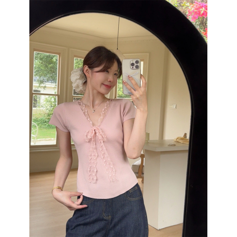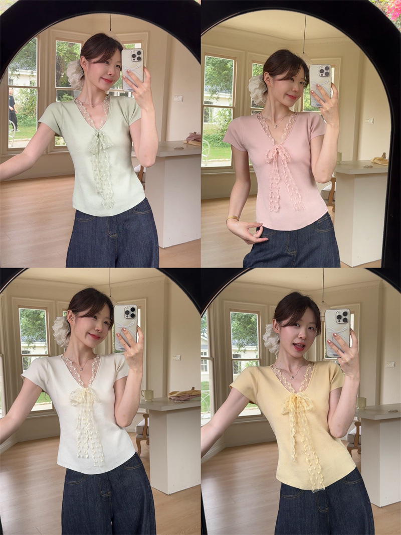 여름 달콤한 레이스 스트랩 v 넥 반팔 티셔츠 여성용 다목적 슬리밍 한국 소녀 니트 탑스토어 가기