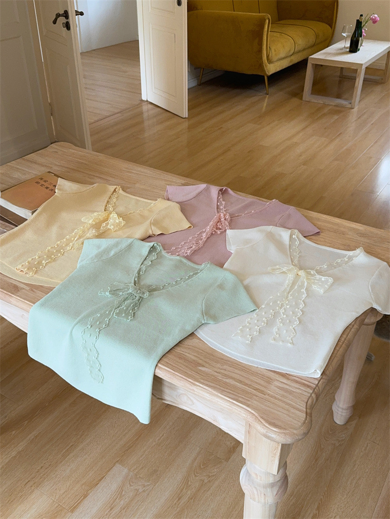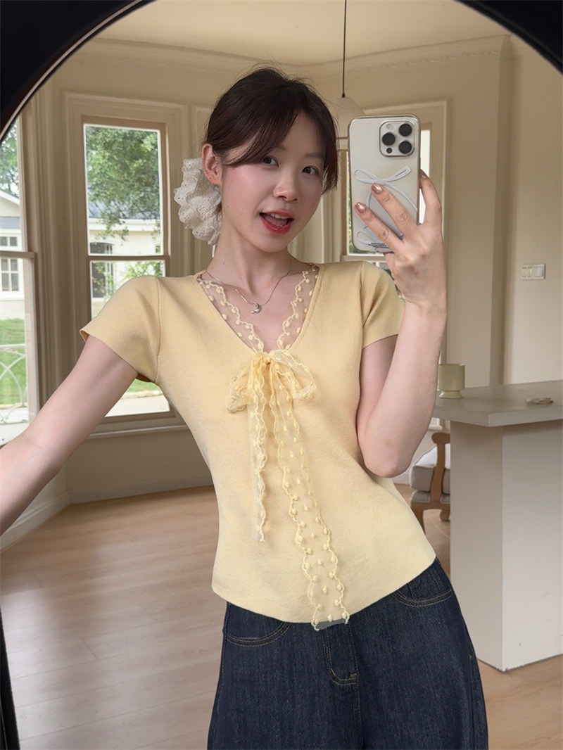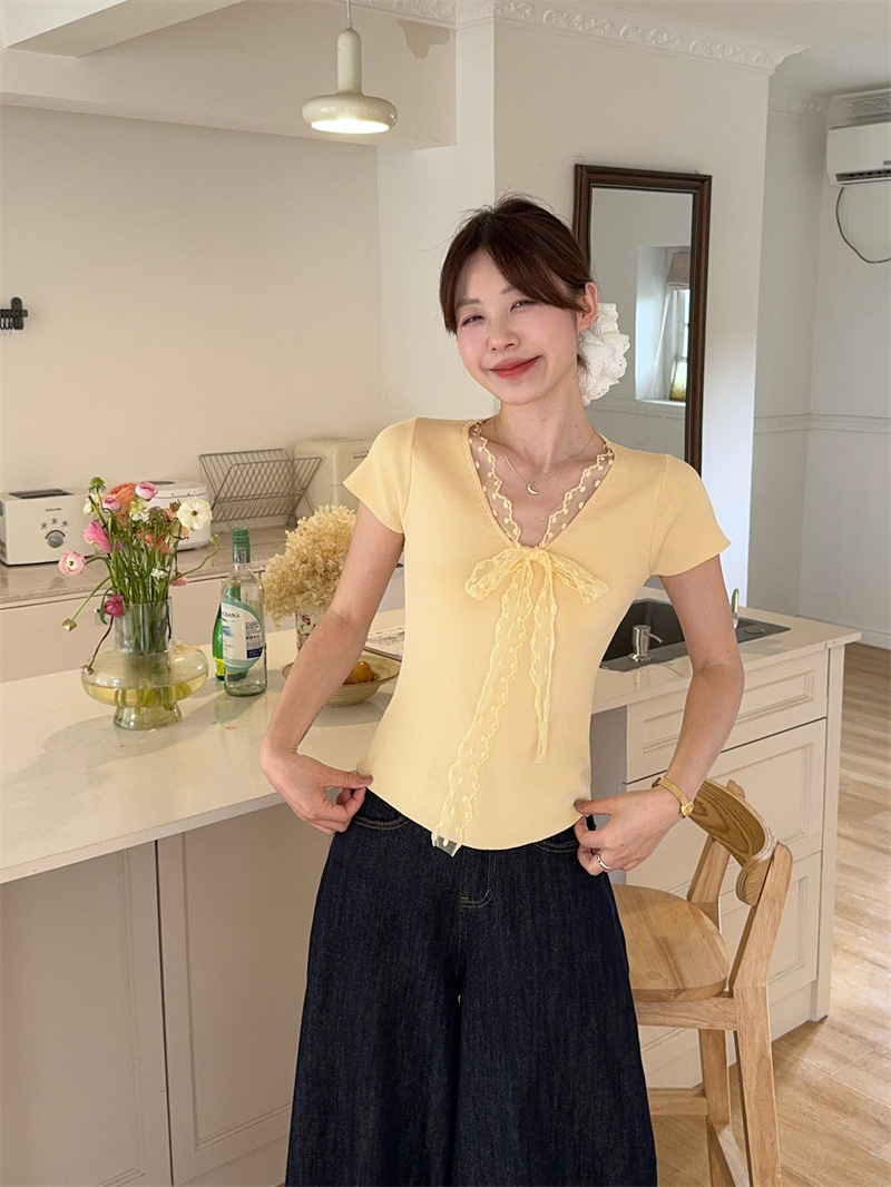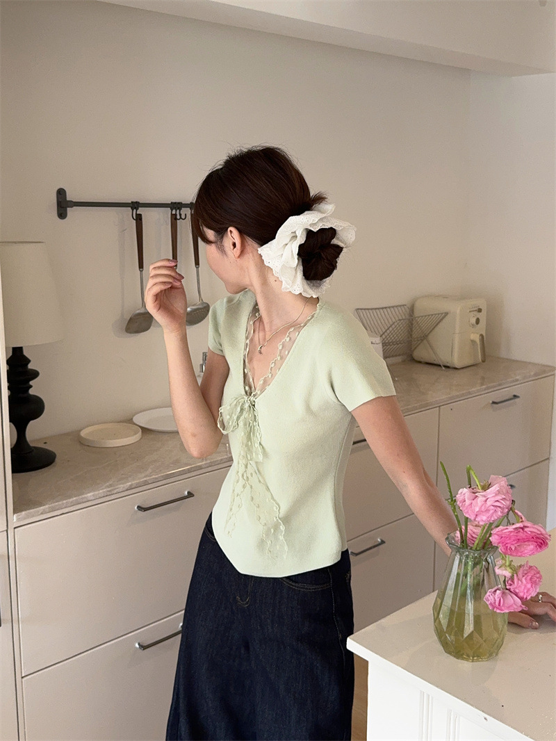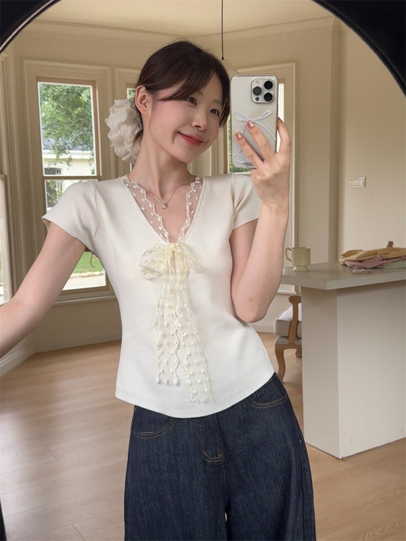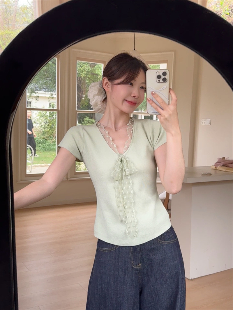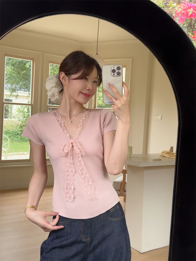 여름 달콤한 레이스 스트랩 v 넥 반팔 티셔츠 여성용 다목적 슬리밍 한국 소녀 니트 탑
