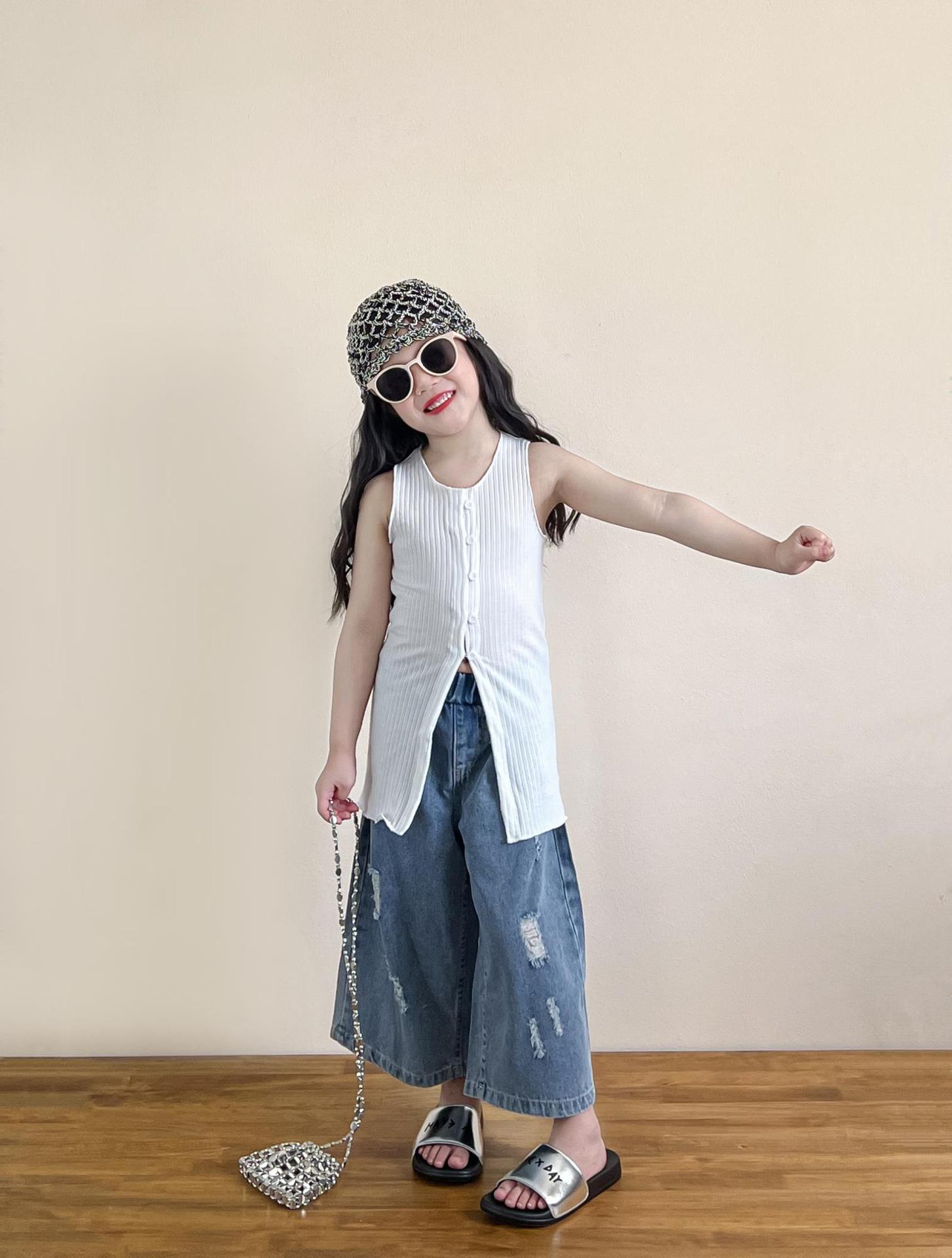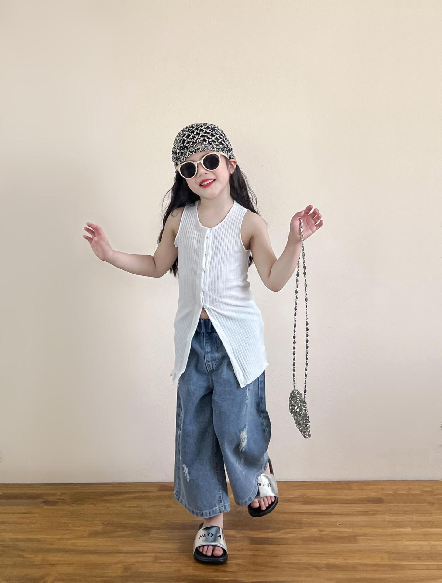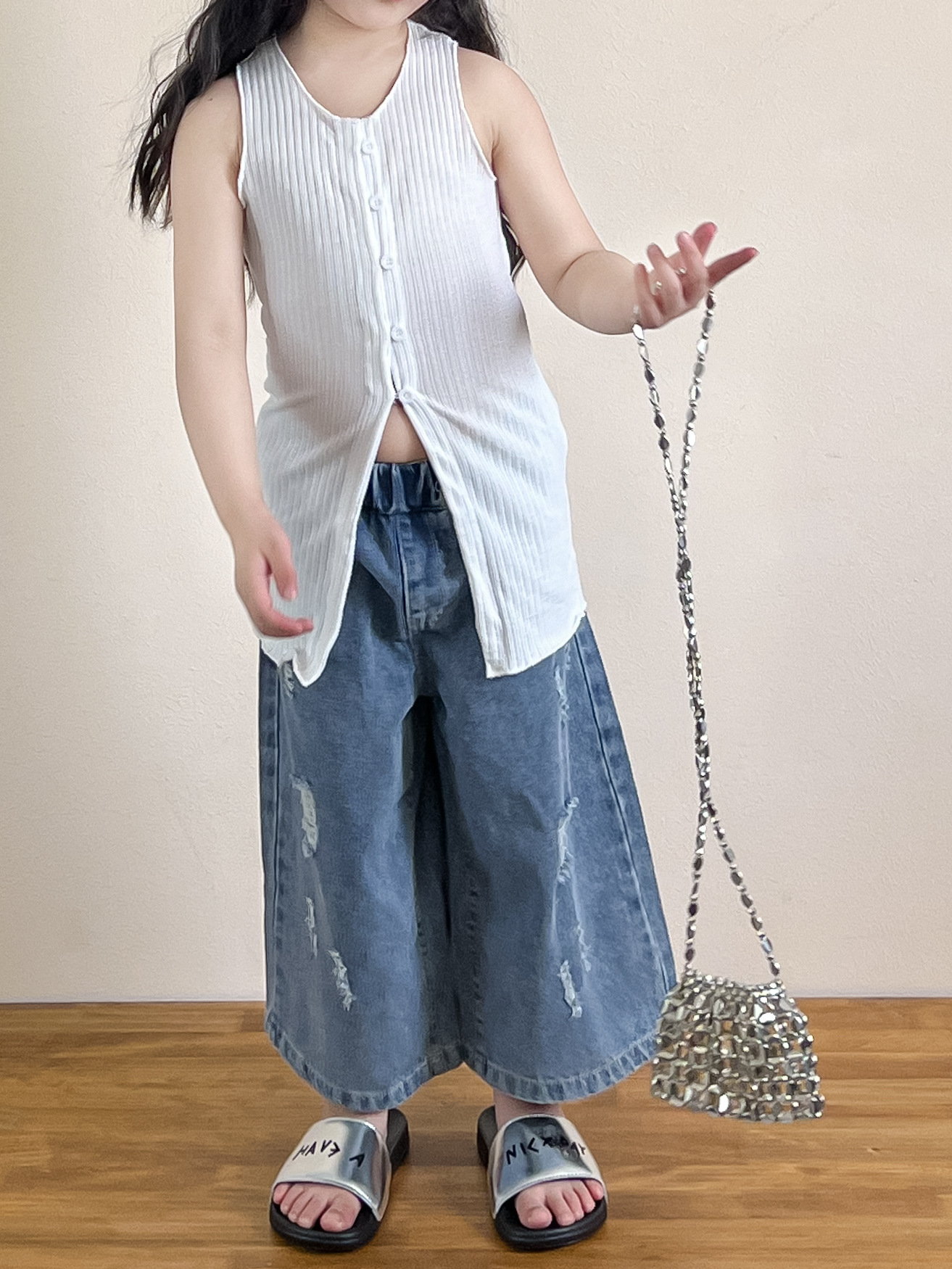 2025 여아 여름 중간 길이 슬림 슬릿 민소매 디자인 조끼 탑 + 찢어진 데님 와이드 팬츠스토어 가기