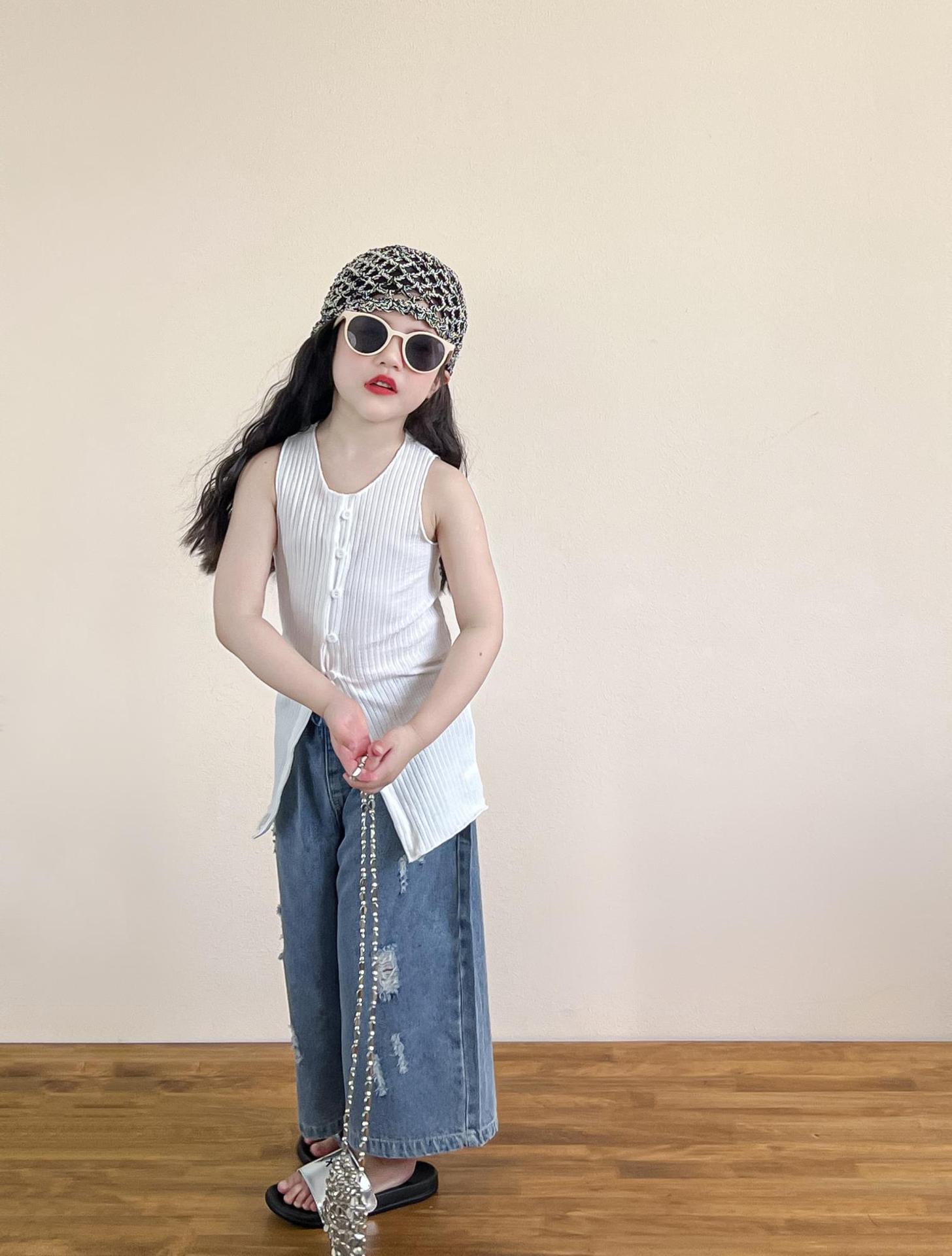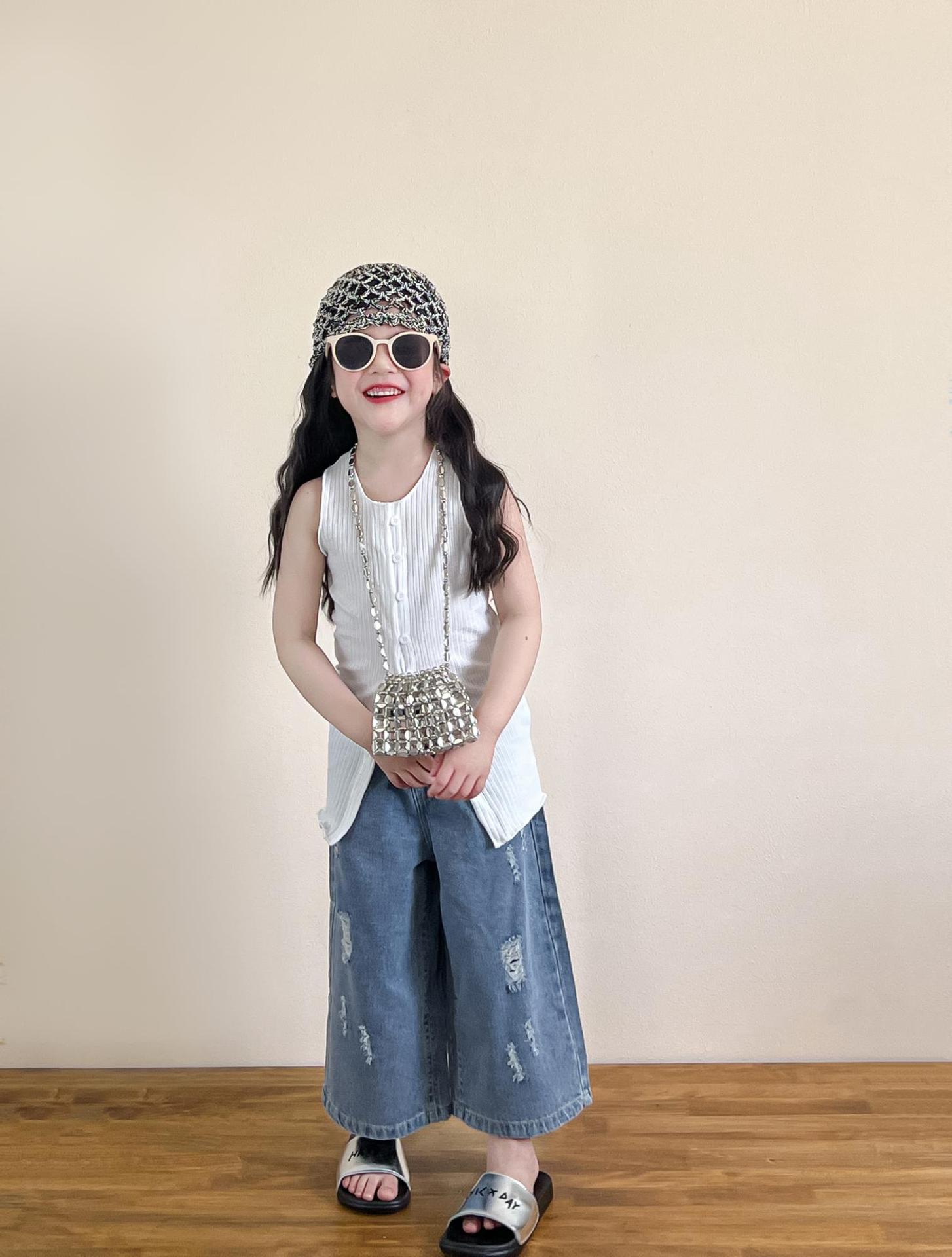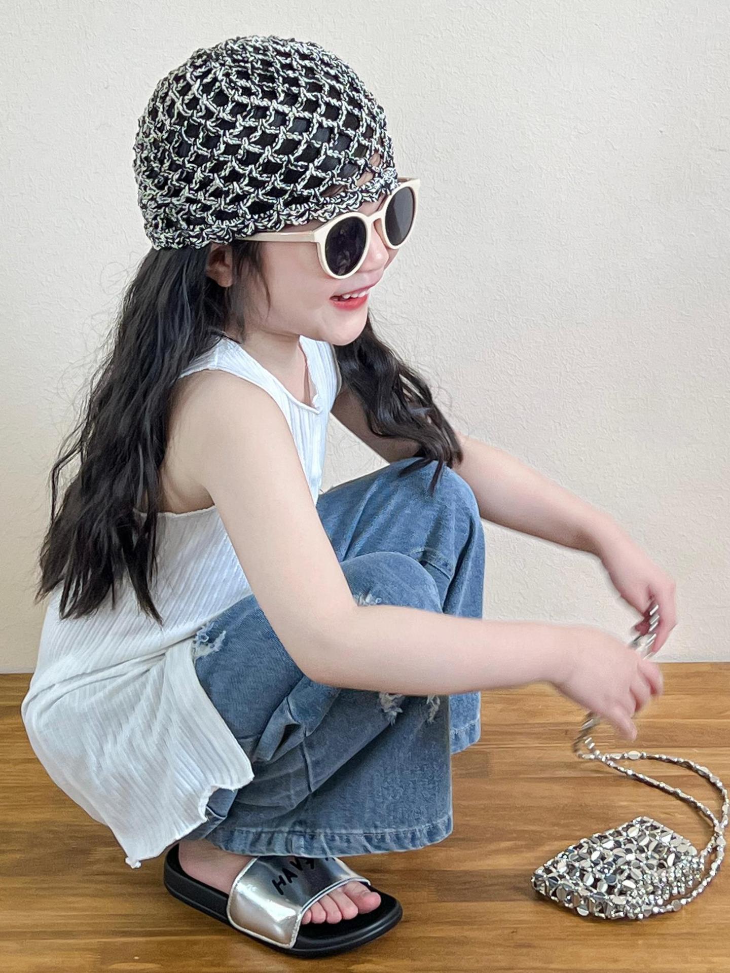 2025 여아 여름 중간 길이 슬림 슬릿 민소매 디자인 조끼 탑 + 찢어진 데님 와이드 팬츠