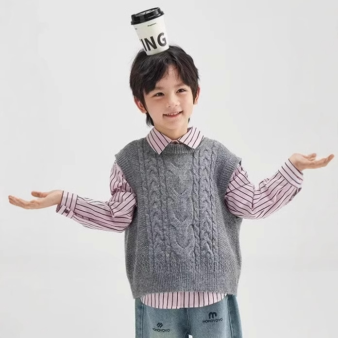가을 겨울 남아 및 여아용 아동 패셔너블 트위스트 니트 조끼, 라운드 넥 풀오버, 레이어드 스웨터 조끼, 트렌디스토어 가기