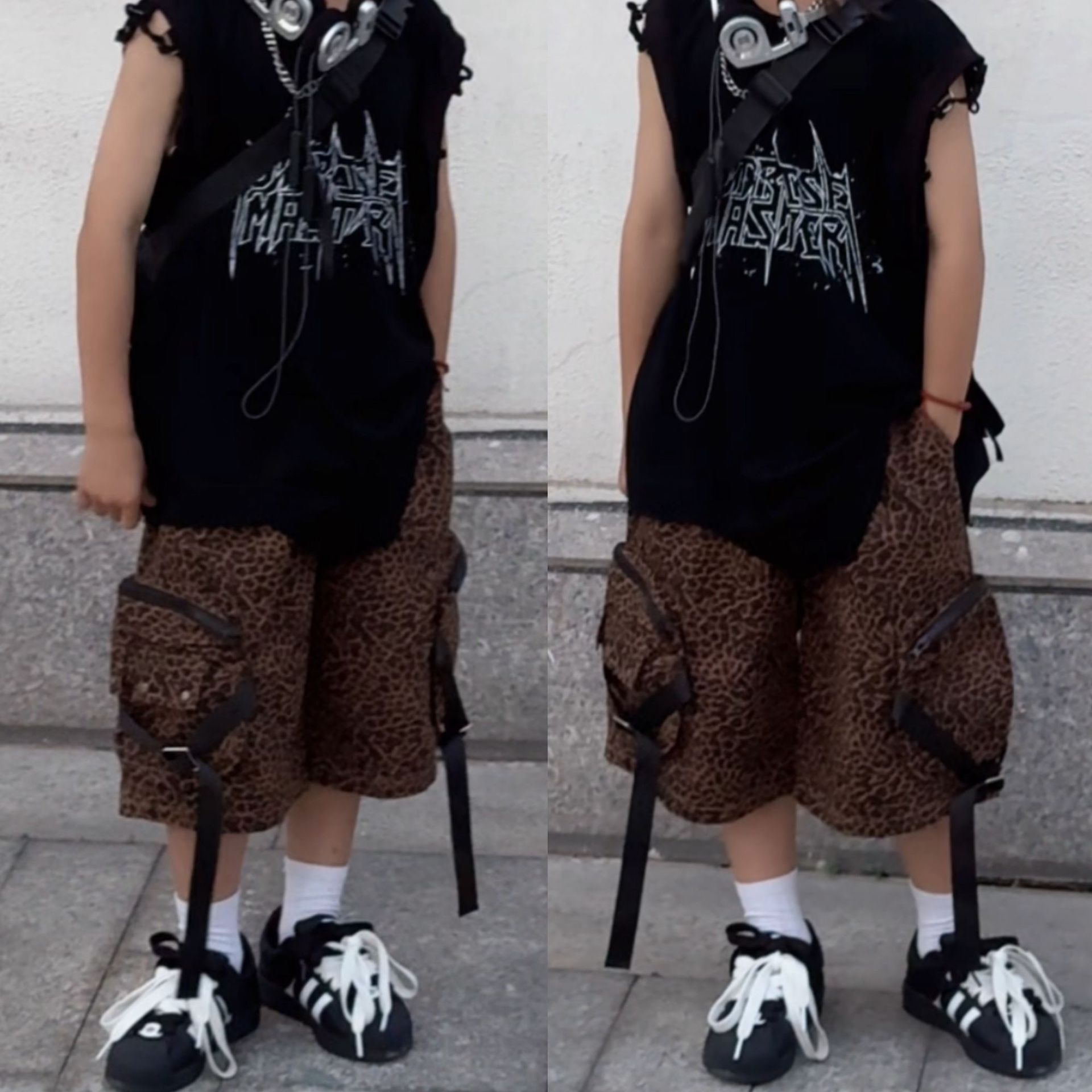2025 아동 여름 중대형 아동 레오파드 프린트 반바지 아메리칸 하이 스트리트 패션 브랜드 빅 포켓 루즈 워크웨어 5부 바지