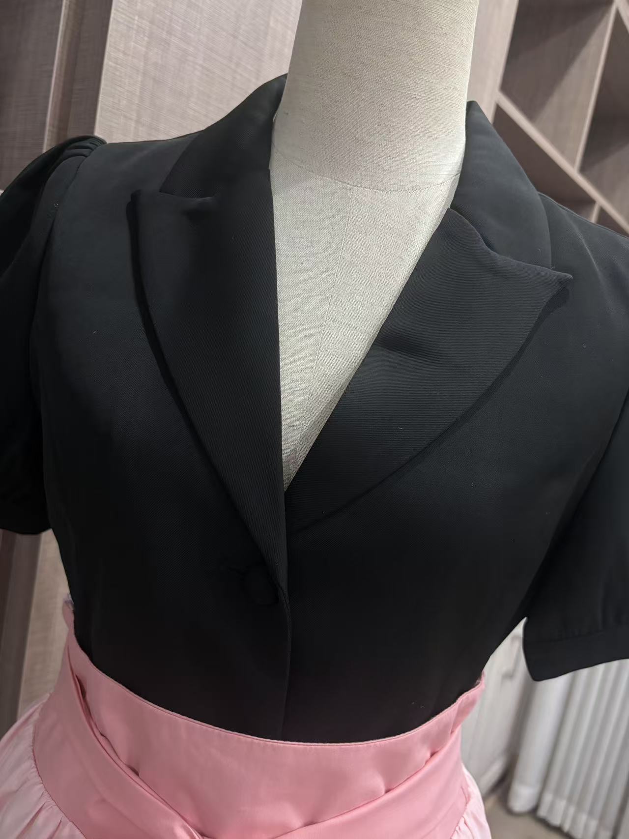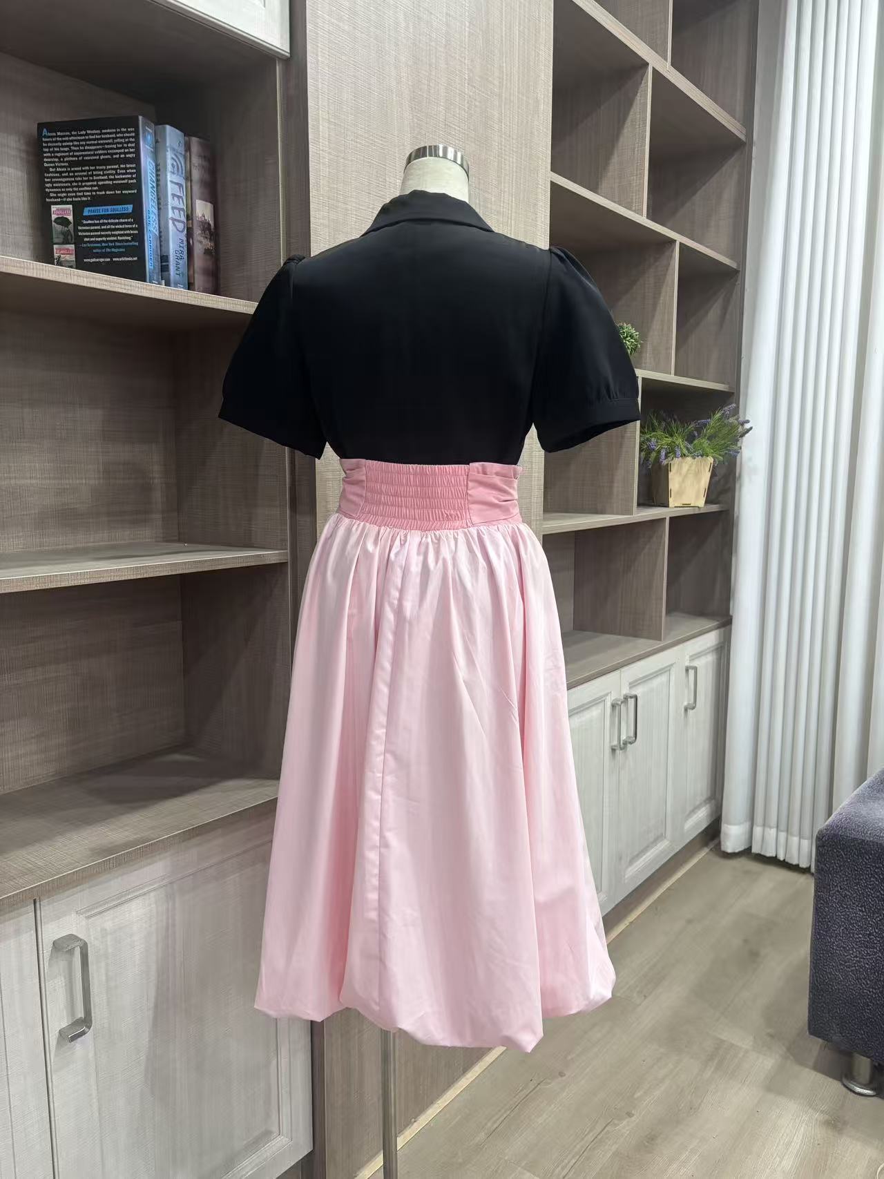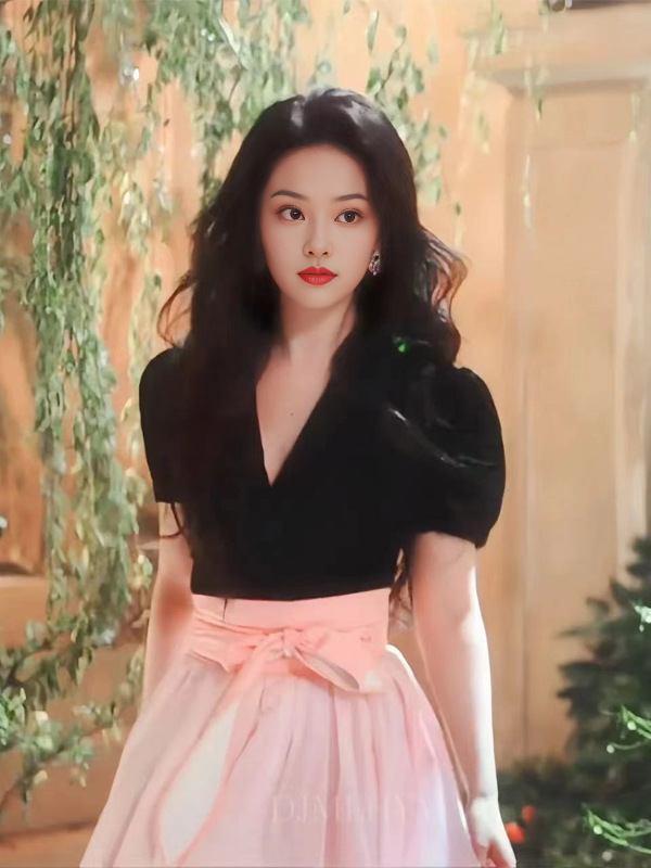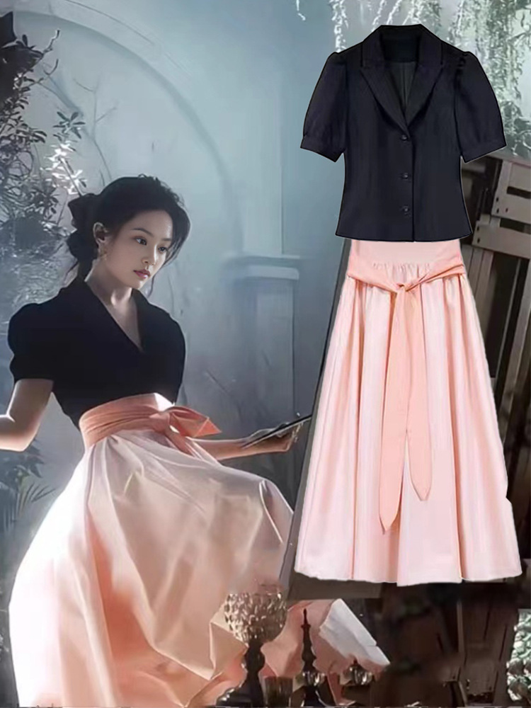 유이페이와 같은 스타일의 블랙 브이넥 셔츠 탑 여성용 여름 핑크 프렌치 스타일 퍼프 스커트 세트스토어 가기